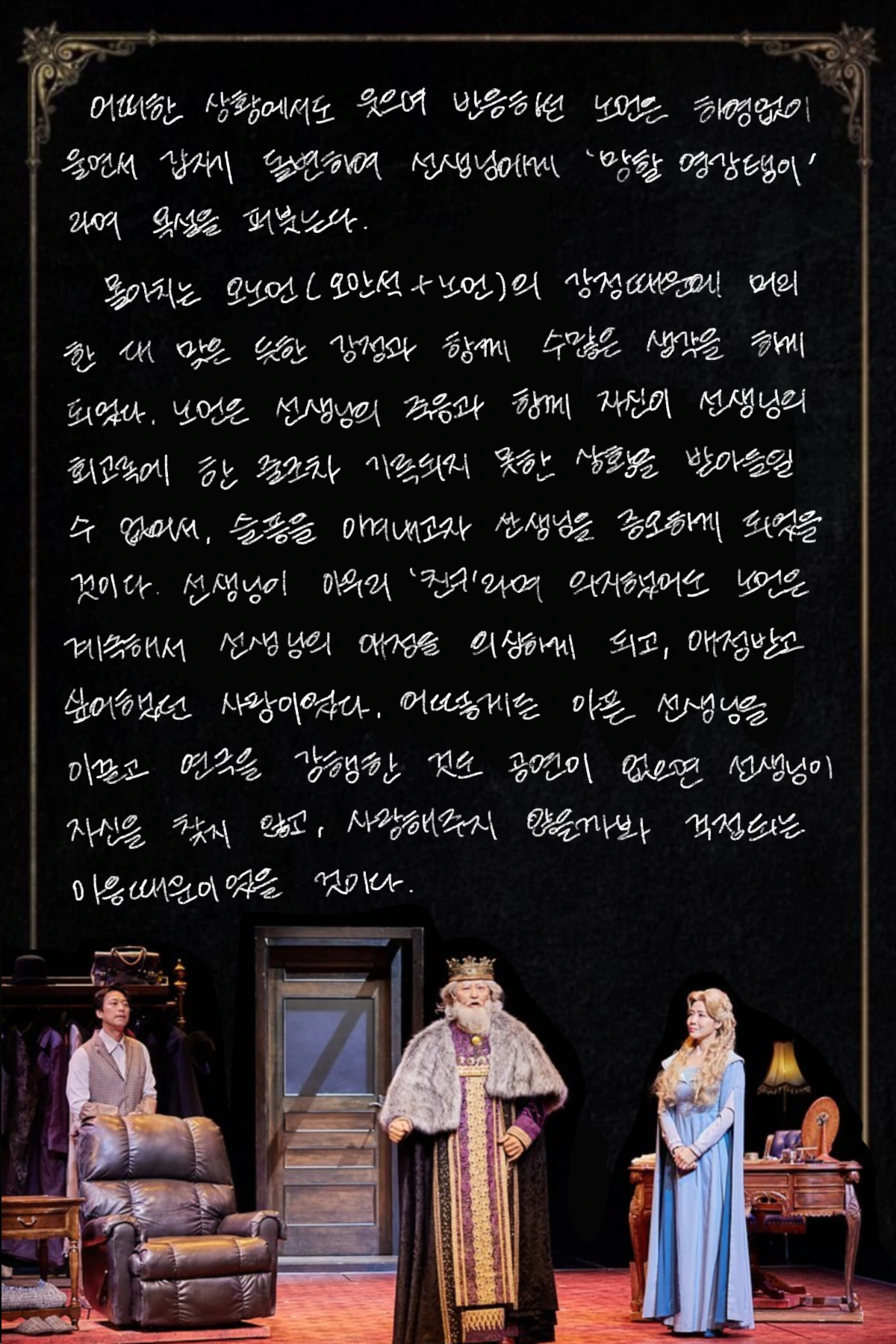몰아치는 오노먼의 감정 때문에 머리 한 대 맞은 듯한 감정과 함께 수많은 생각을 하게 되었다. 노먼은 선생님의 죽음과 함께 자신이 선생님의 회고록에 한 줄조차 기록되지 못한 상황을 받아들일 수 없어서, 슬픔을 이겨내고자 선생님들 증오하게 되었을 것이다. 선생님이 아무리 '친구'라며 의지했어도 노먼은 계속해서 선생님의 애정을 의심하게 되고, 인정 받고 싶어했던 사람이었다. 어떻게든 아픈 선생님을 이끌고 연극을 강행한 것도 공연이 없으면 선생님이 자신을 찾지 않고, 사랑해주지 않을까봐 걱정되는 마음 때문이었을 것이다.