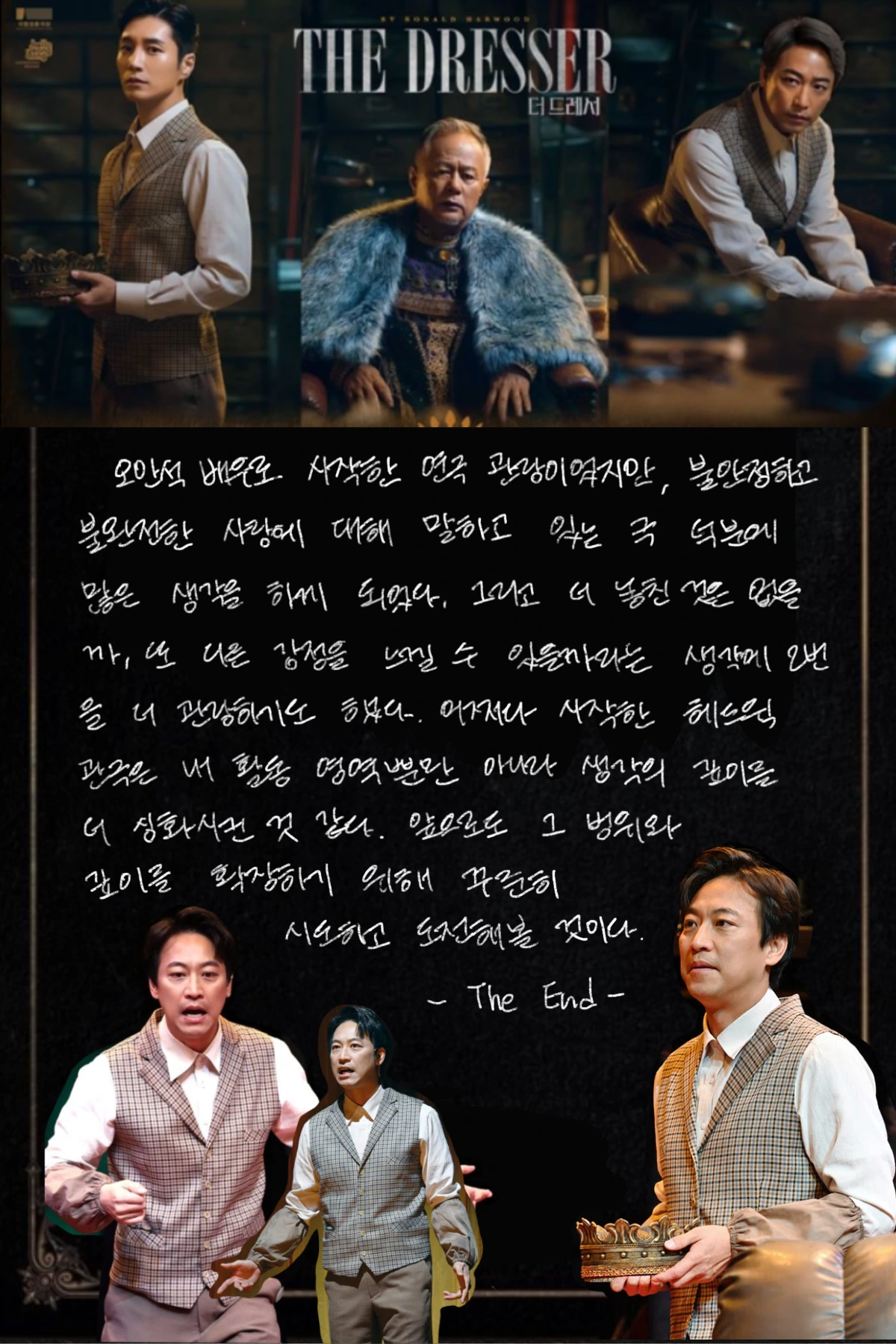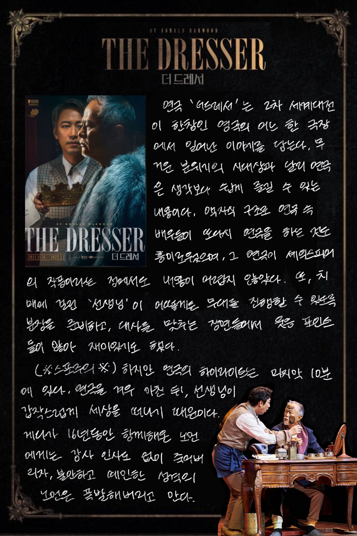 연극 '더드레서'는 2차 세계대전이 한창인 영국의 어느 한 극장에서 일어난 이야기를 담는다. 무거운 분위기의 시대상과 달리 연극은 생각보다 쉽게 즐길 수 있는 내용이다. 액자식 구조로 연극 속 배우들이 또다시 연극을 하는 것도 흥미로웠으며, 그 연극이 셰익스피어의 작품이라는 점에서도 내용이 어렵지 않았다. 또, 치매에 걸린 '선생님'이 어떻게든 무대를 진행할 수 있도록 분장을 준비하고, 대사를 맞추는 장면들에서 웃음 포인트들이 많아 재미있기도 했다.