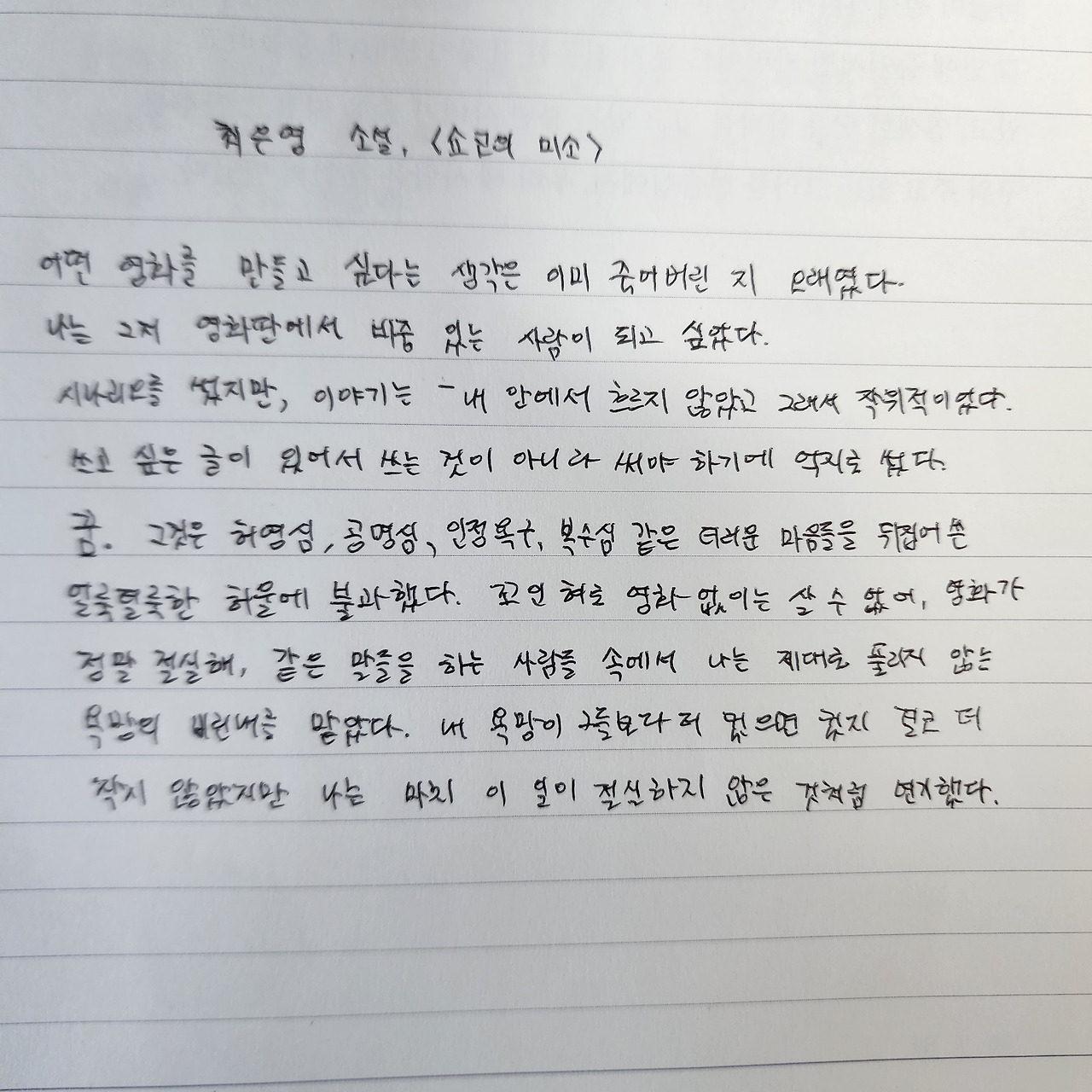 오늘의 필사는 최은영 님의 소설, <쇼코의 미소> 중 한 문장입니다.