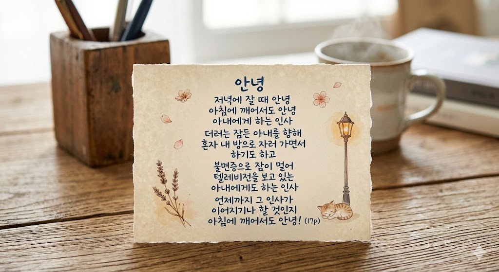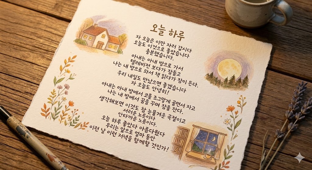 나이가 들면 마음이 나약해지는 것일까요, 아니면 딸의 말처럼 그저 감성이 풍부해지는 것일까요. 이유가 무엇이든 좋습니다. 오늘 시 두 편 필사를 통해 '나를 위한, 그리고 우리를 위한 나의 선택'이 틀리지 않았음을 따뜻하게 응원받은 것 같아 마음이 편안해집니다.