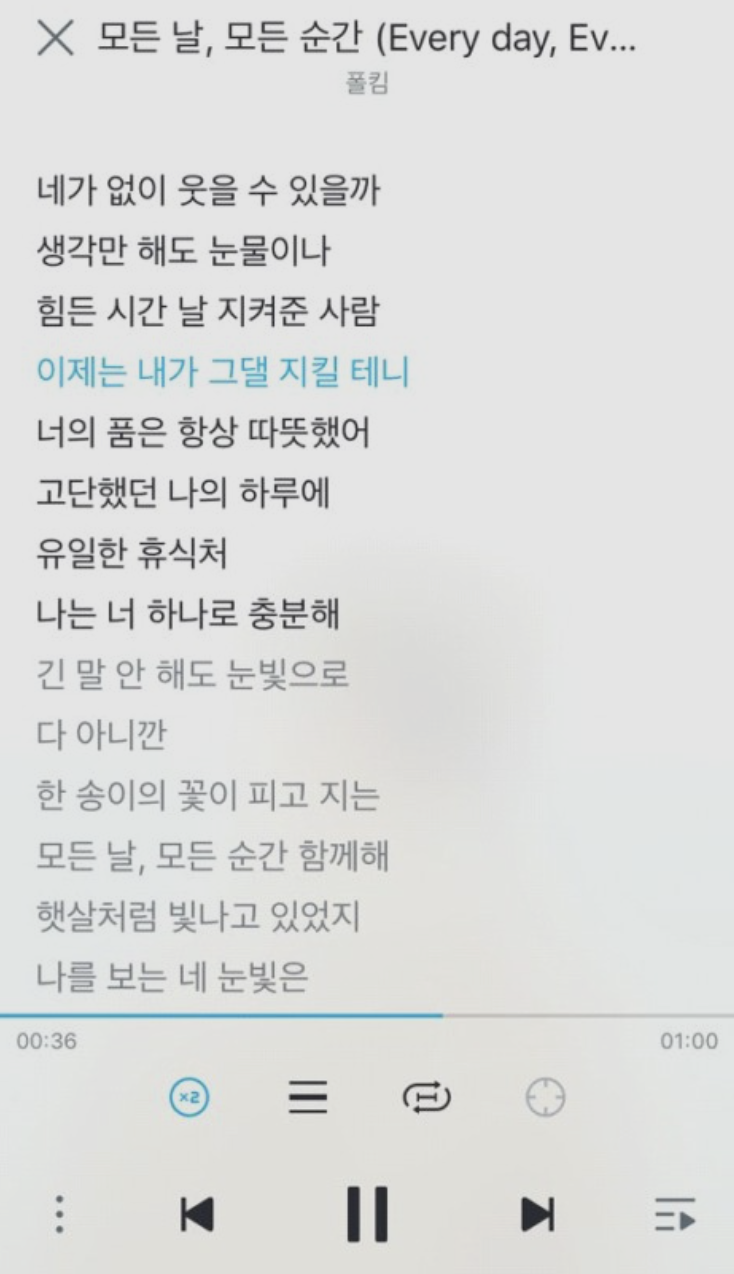 지니 뮤직 같은 경우에는 그 노래를 눌러 보면 내가 지금 듣고 있는 부분이 가사에서 어느 부분인지 별도 표기를 해 주잖아요. 내가 뭐 예를 들어서 나나나~ 하는 부분을 듣고 있으면 가사에서도 나나~ 이렇게 표시를 그대로 표기를 해줘서 내가 이 부분 듣고 있구나라는 걸 알 수 있는데 유튜브는 그게 없어요.