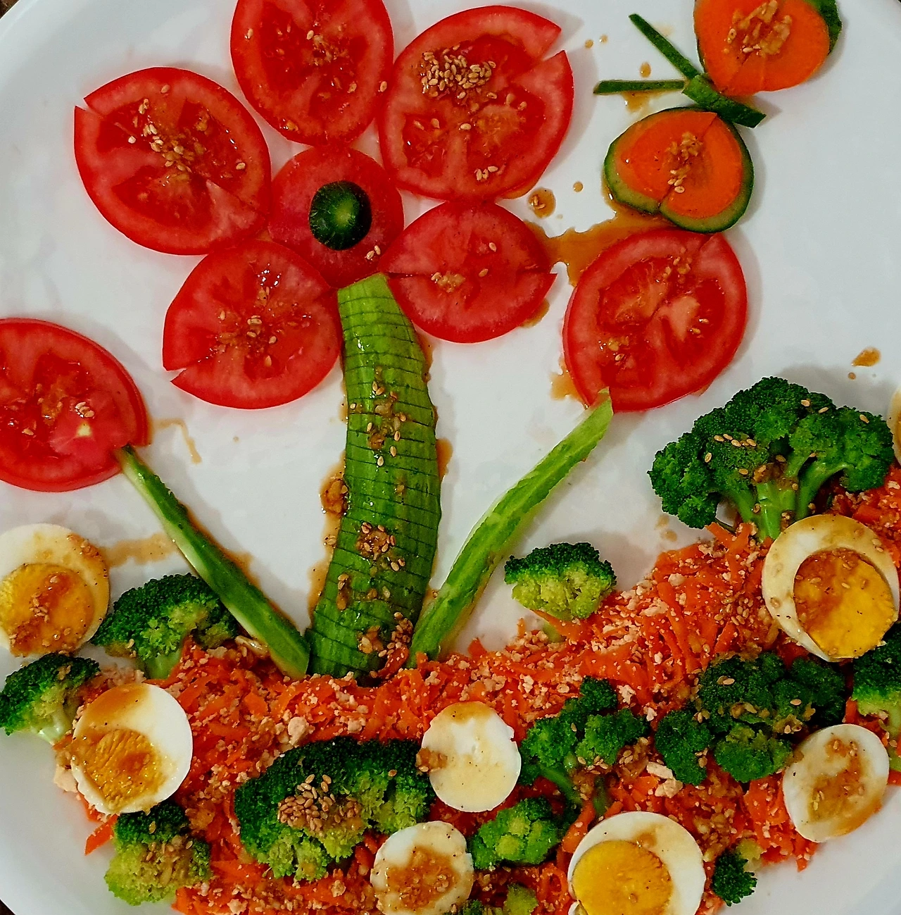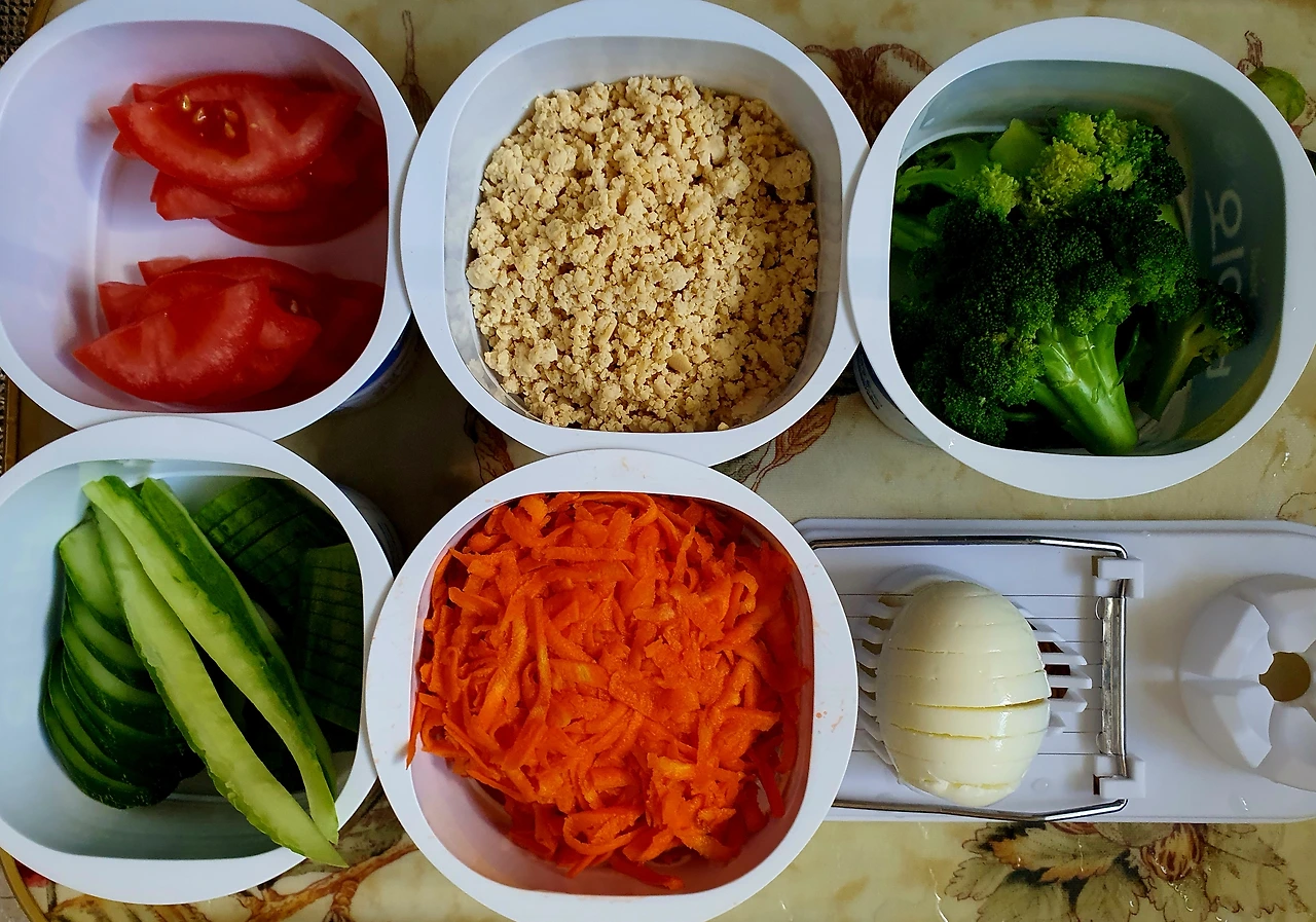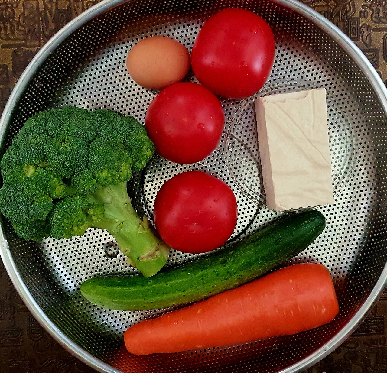 ■ 재료 : 토마토 1개. 당근½개. 브로콜리¼개. 오이 1개. 삶은 달걀 1개. 두부 조금