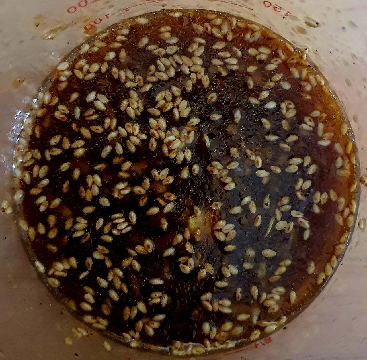 ■ 소스 : 오리엔탈 드레싱 소스 (간장 1큰술, 올리브유 1큰술, 꿀 1큰술, 감식초 1큰술, 레몬즙 1큰술, 매실청 1큰술, 다진 마늘 ½큰술, 소금 약간, 후추 약간, 통깨 ½큰술, 참기름 1큰술) - 매실에는 소염과 항균효능이 있는 거 아시죠? 그래서 요리헌터는 불을 안 쓰고 생으로 먹는 조리법엔 매실청을 꼭 넣어서 해요.