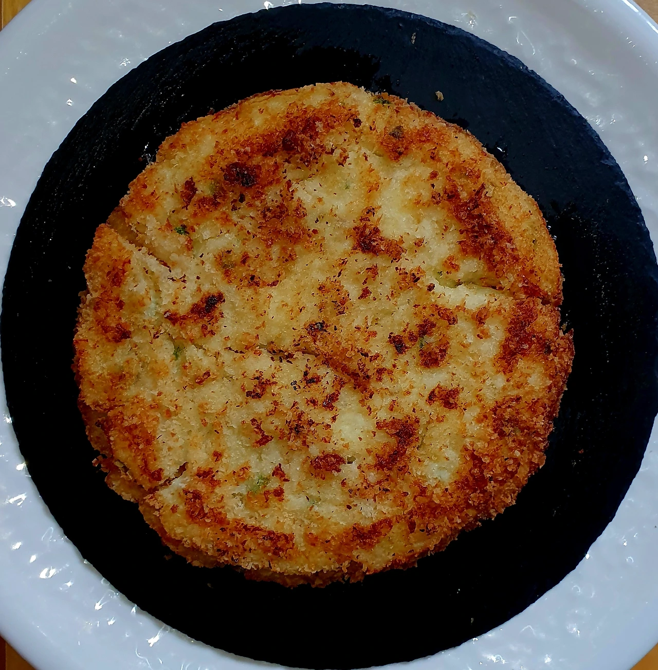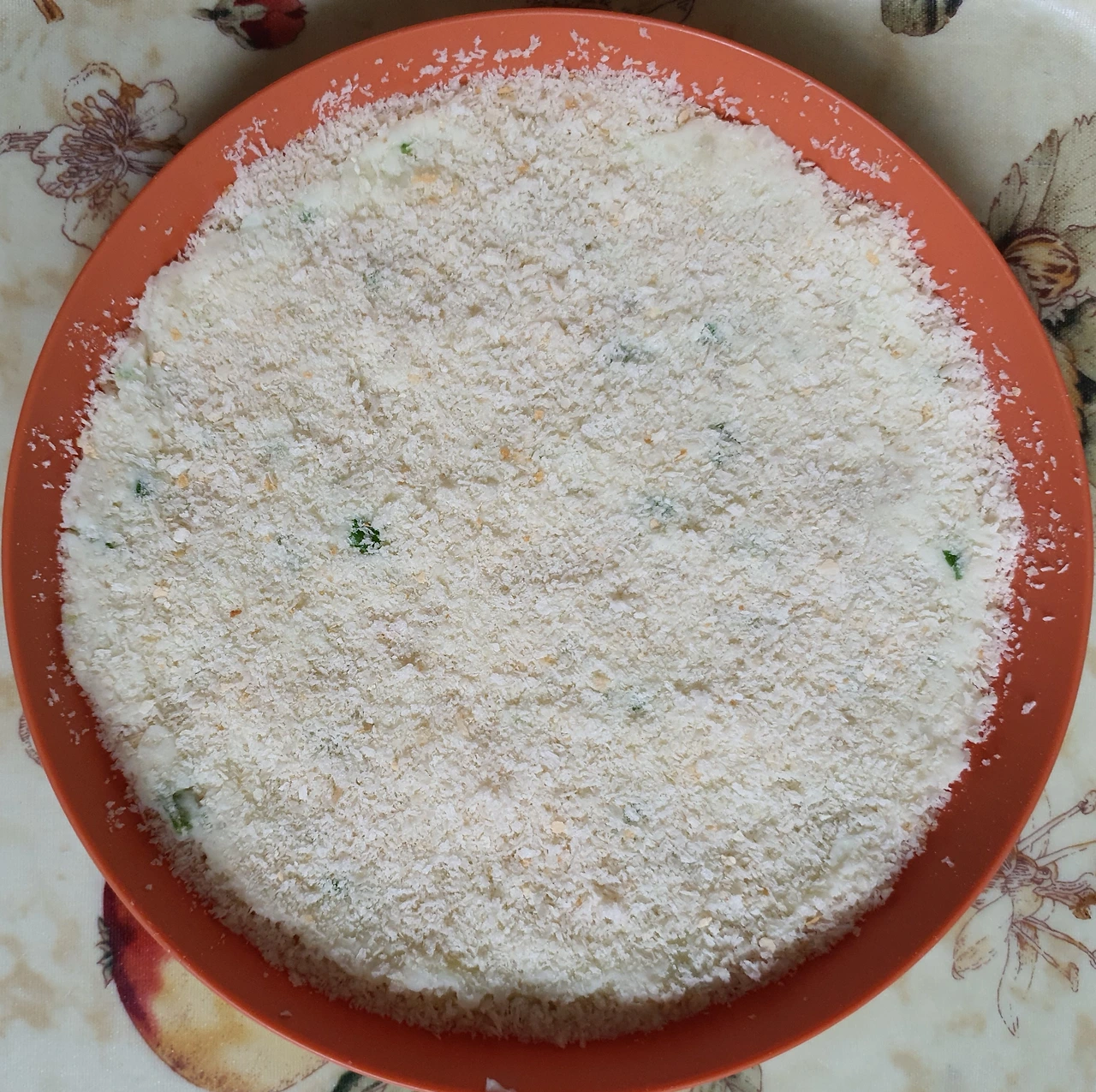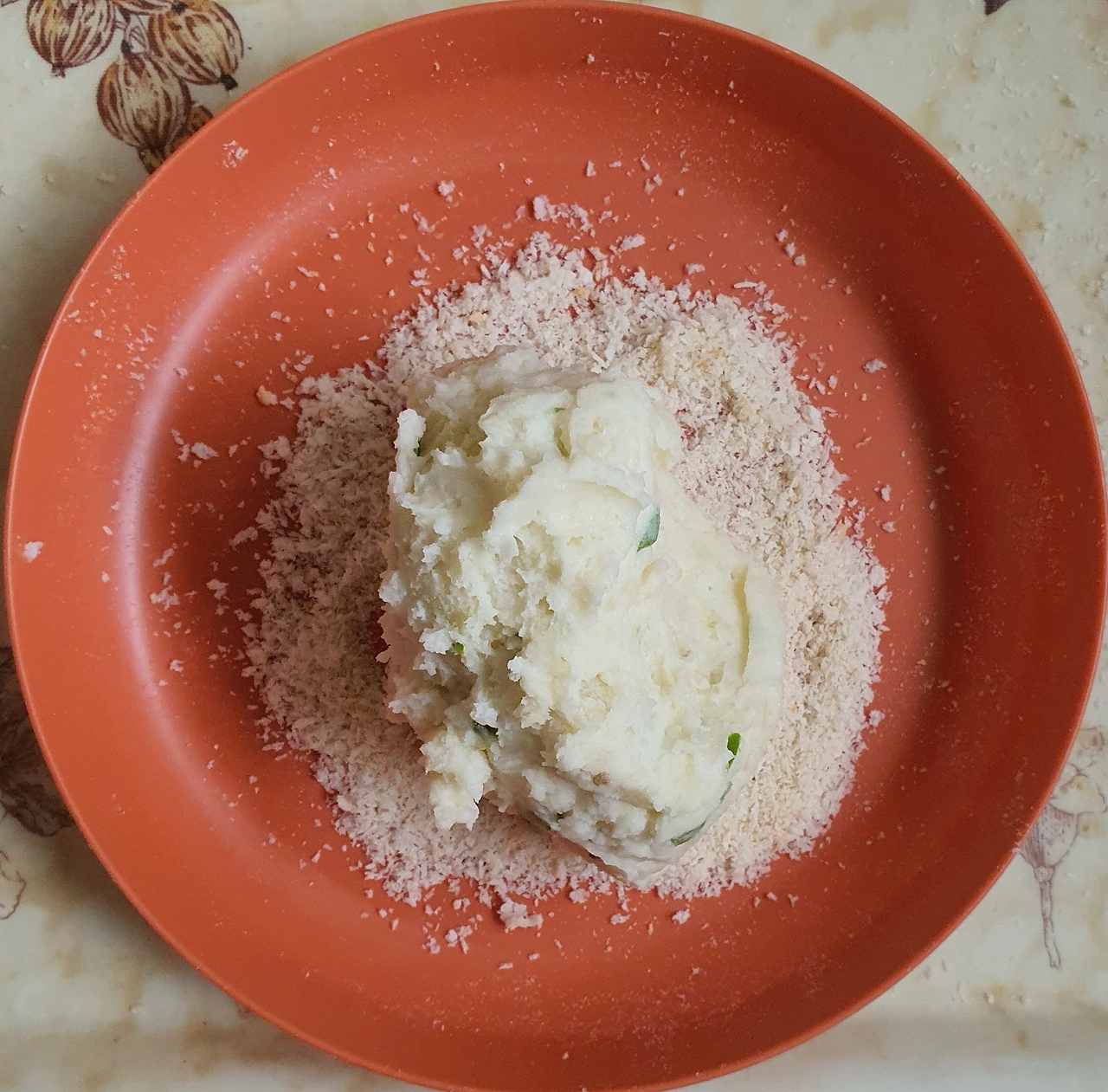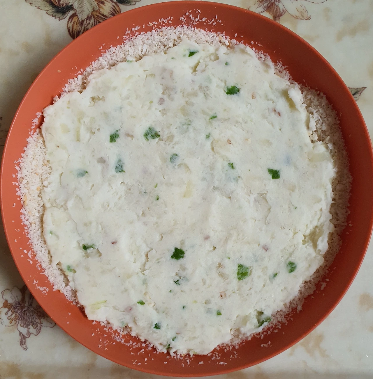 • 바닥에 빵가루를 깔고 이렇게 섞어준 감자를 넓고 두툽 하게 펼쳐 준다음 위에 빵가루를 입혀준다.