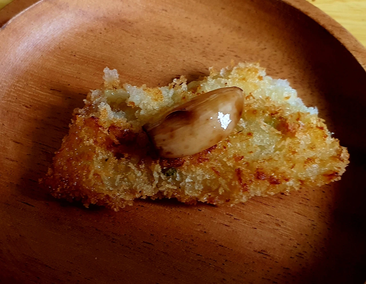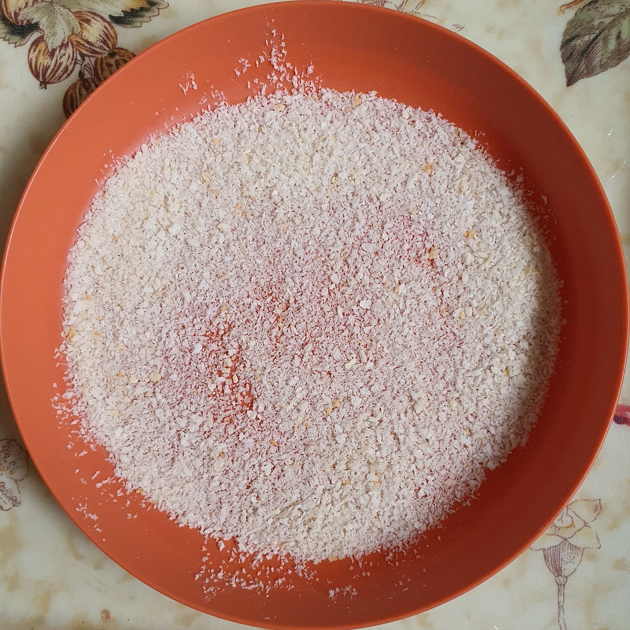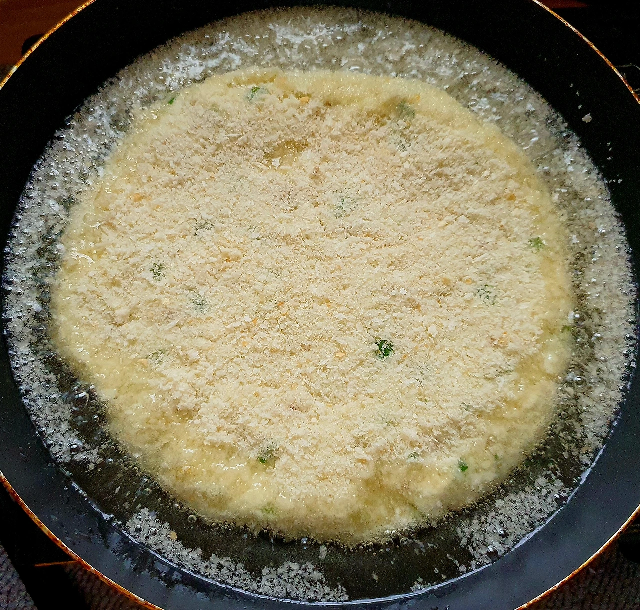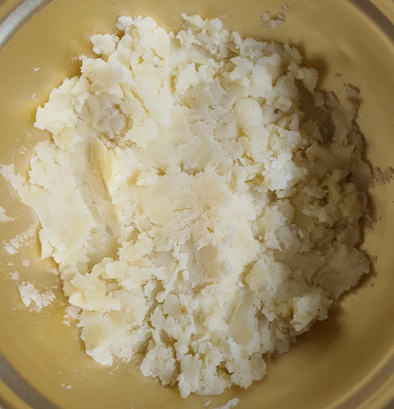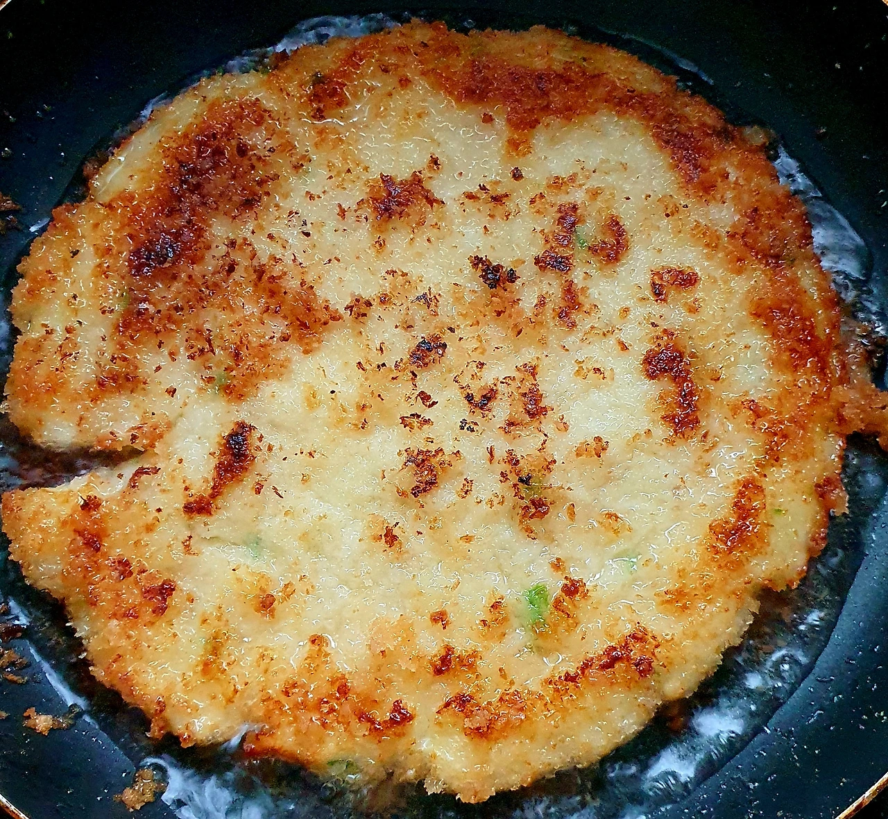 • 바닥에 빵가루를 깔고 이렇게 섞어준 감자를 넓고 두툽 하게 펼쳐 준다음 위에 빵가루를 입혀준다.