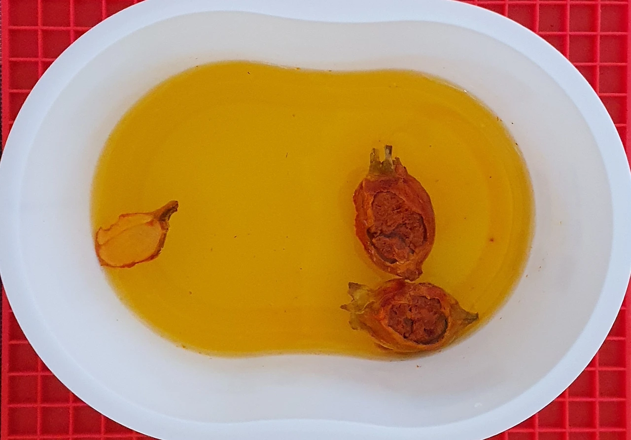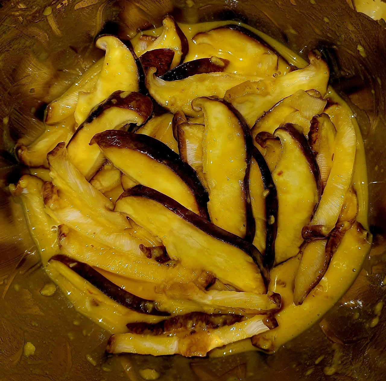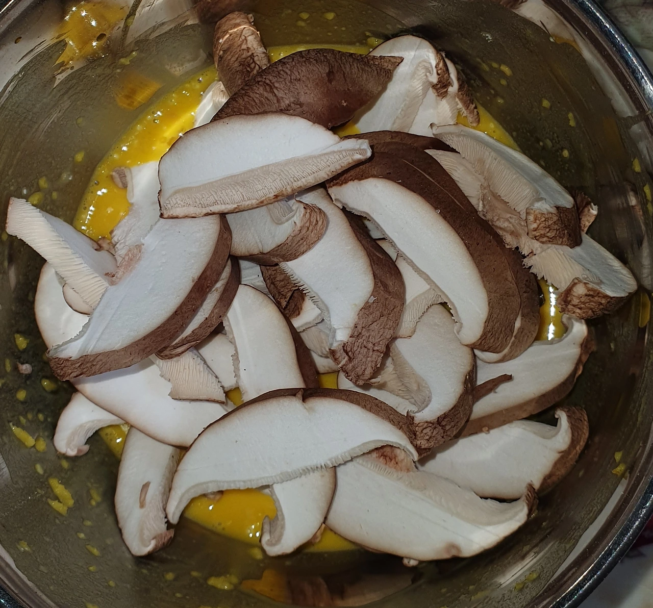 • 뚜껑 있는 통에 치자 1개를 물에 불려 색을 낸다음 치자물과 달걀노른자위와 부침가루. 맛소금을 넣고 잘 풀어 튀김옷처럼 묽게 만들어 준다음 준비한 표고버섯을 넣고 뚜껑을 닫고 잘 흔들어 섞어가며 튀김옷을 입혀준다.
