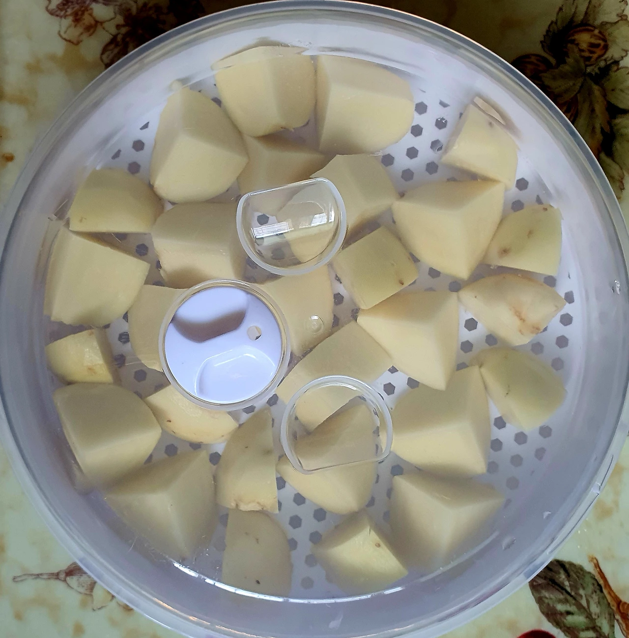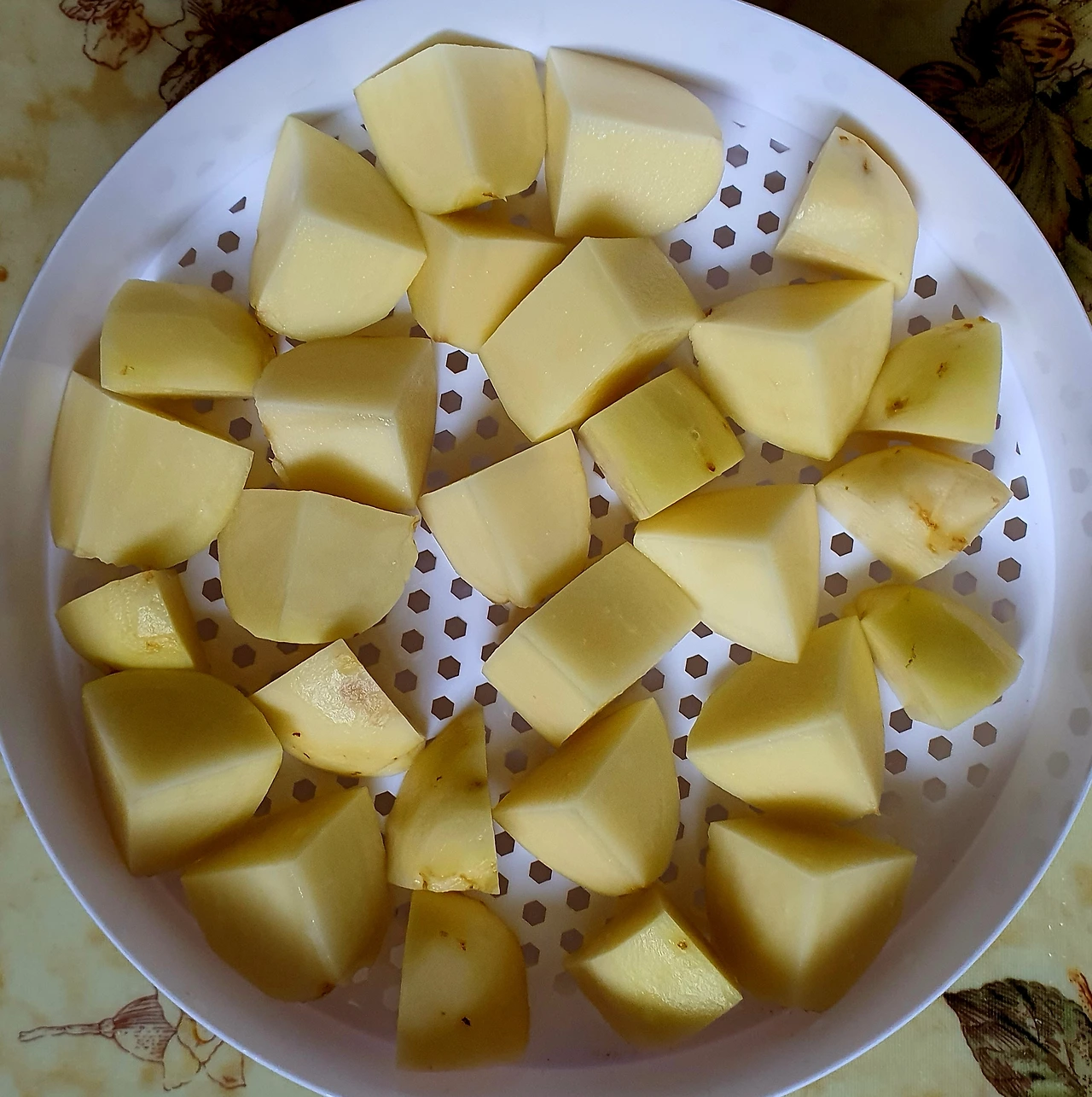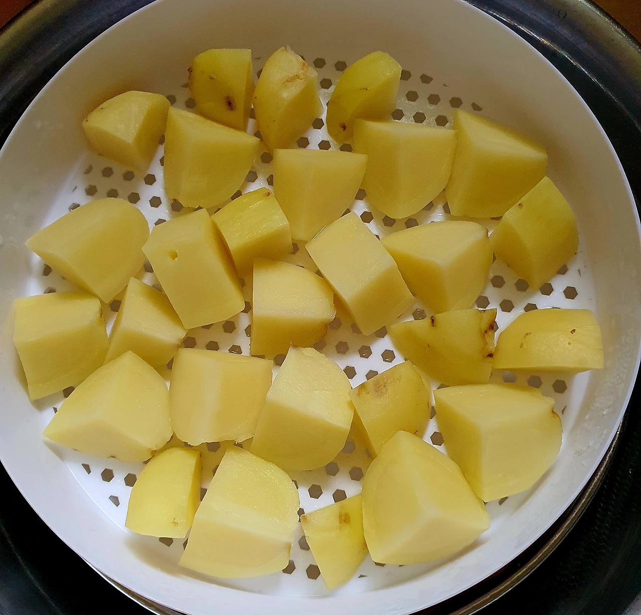 • 감자를 껍질을 벗겨 적당한 크기로 썰어 전자랜즈에 돌려 삶아 준다.