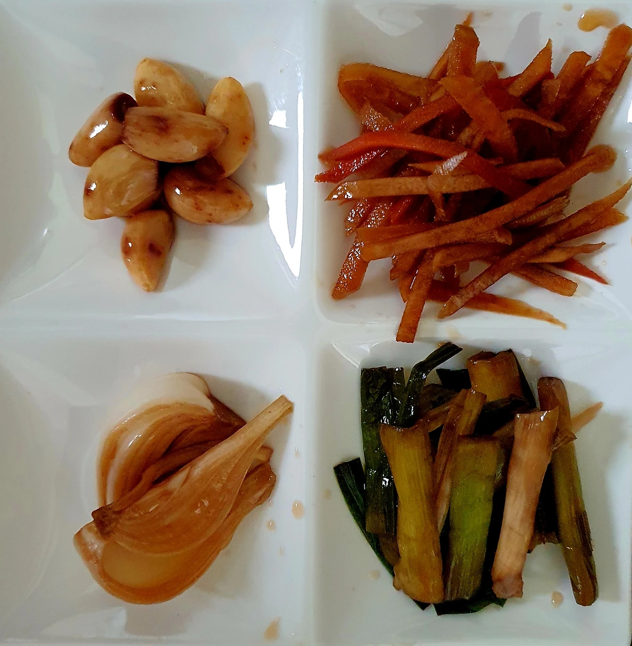 □ 전요리와 잘 어울리는 장아찌도 있어요. 햇양파. 무와 콜라비. 풋마늘 장아찌는 요리헌터가 만들었고요. 마늘 장아찌는 국가 공인 요리사가 만들어 선물로 줬어요!