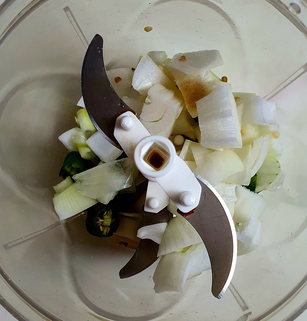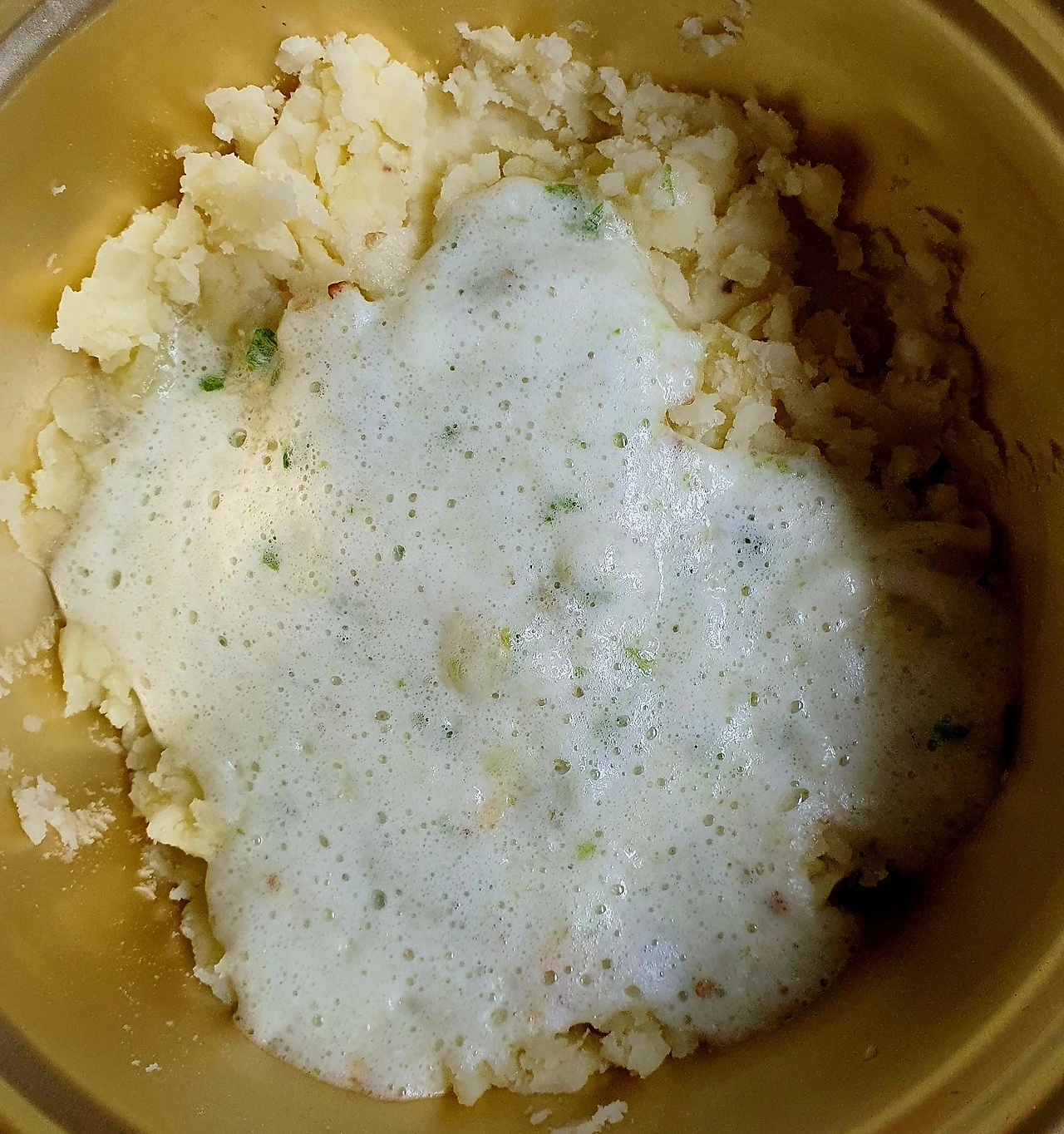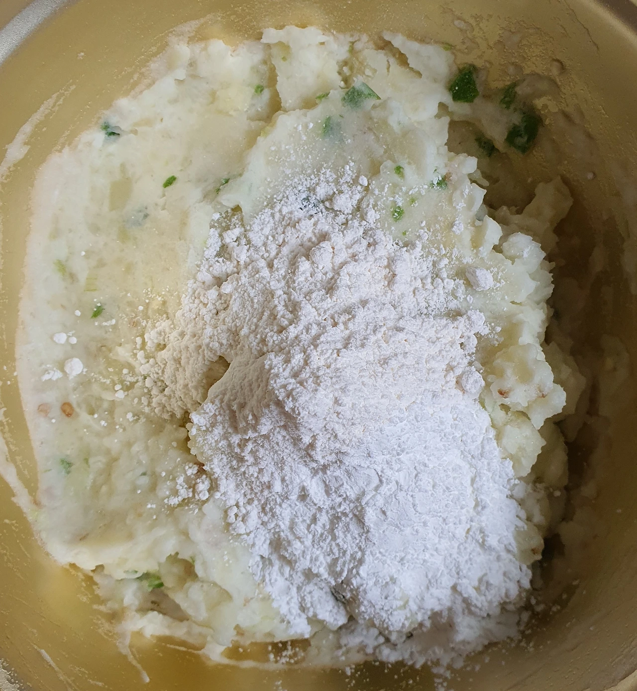 • 삶아진 감자를 으깨주고 양파와 청양고추는 카타기에 곱게 갈고, 달걀흰자위도 넣고, 소금½작은술. 설탕½작은술과 부침가루를 넣고 잘 섞어준다.