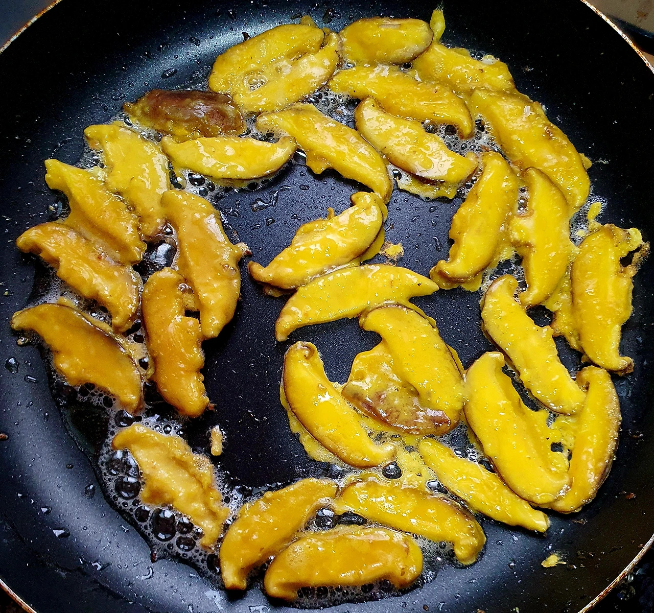• 달궈진 팬에 기름을 넉넉히 두른 후 고루 튀김옷을 입힌 표고를 넣고 노릇하게 구워준다.