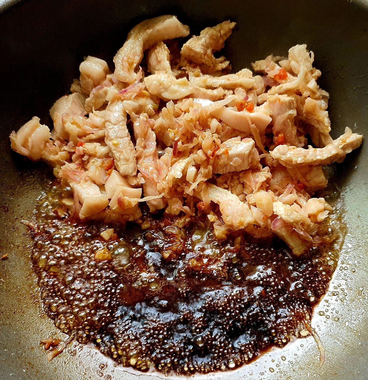 ③ 넓은 팬에 기름을 넉넉히 넣고 간 마늘. 간청양고추와 양파를 먼저 넣고 마늘향을 내고 양파는 중 약불에서 은근히 카라멜라이징 시켜준다. 어느 정도 양파가 볶아지면 돼지고기를 넣고 볶다가 감 칠 향을 돋우기 위해 한쪽으로 몰고 간장 1큰술을 휘리릭 넣고 함께 볶아준다.