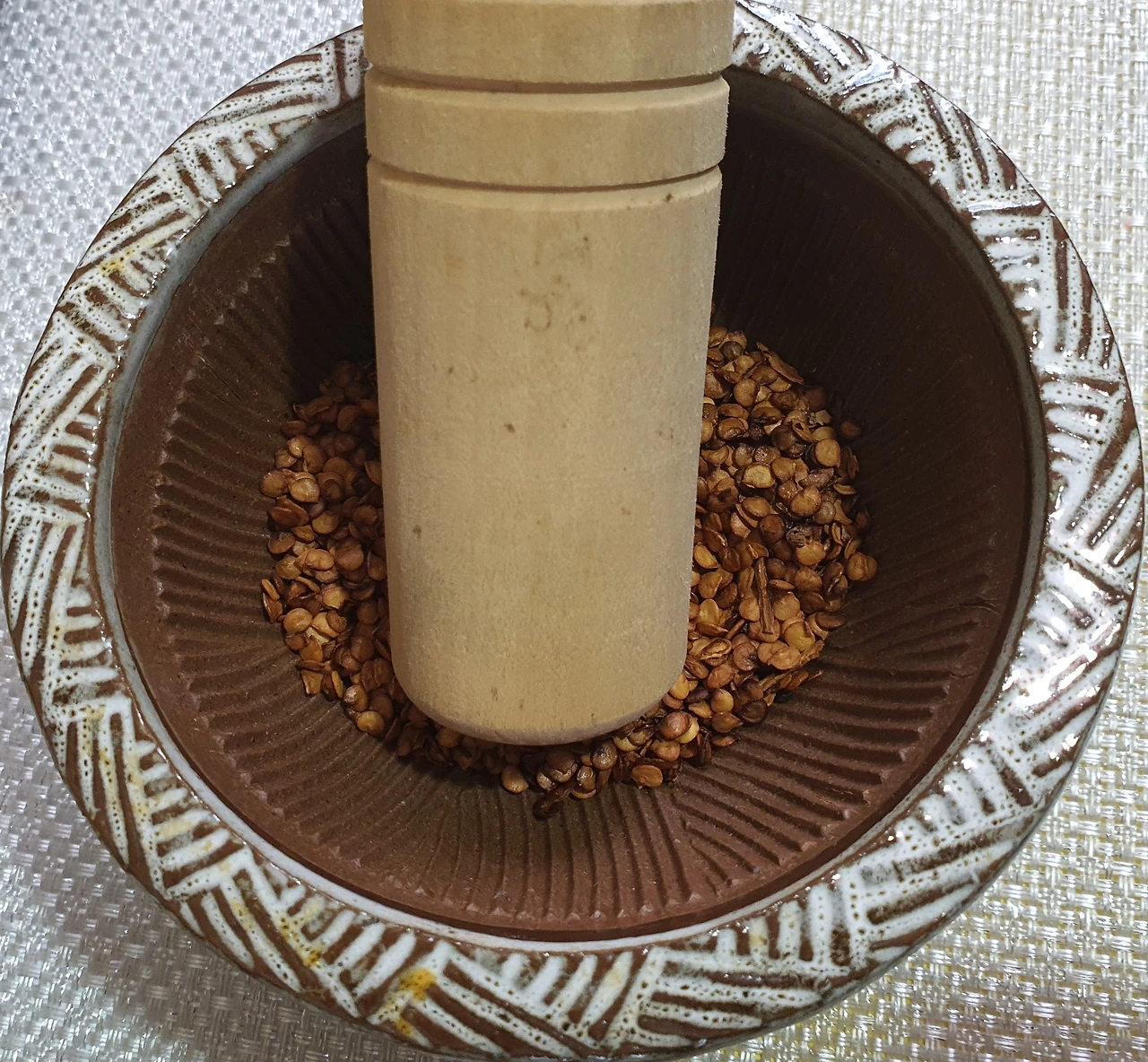 • 고추씨를 팬에 살짝 볶아서 절구에 곱게 빻아서 채에 걸러 둔다.
