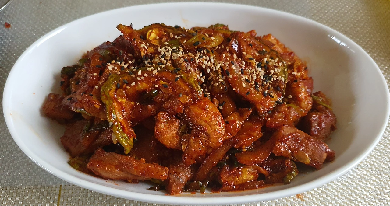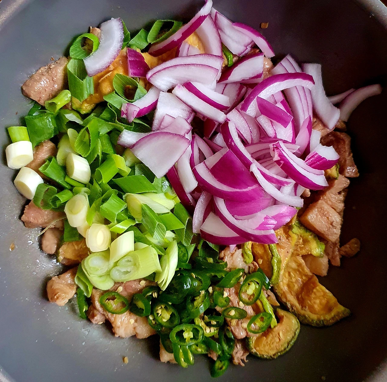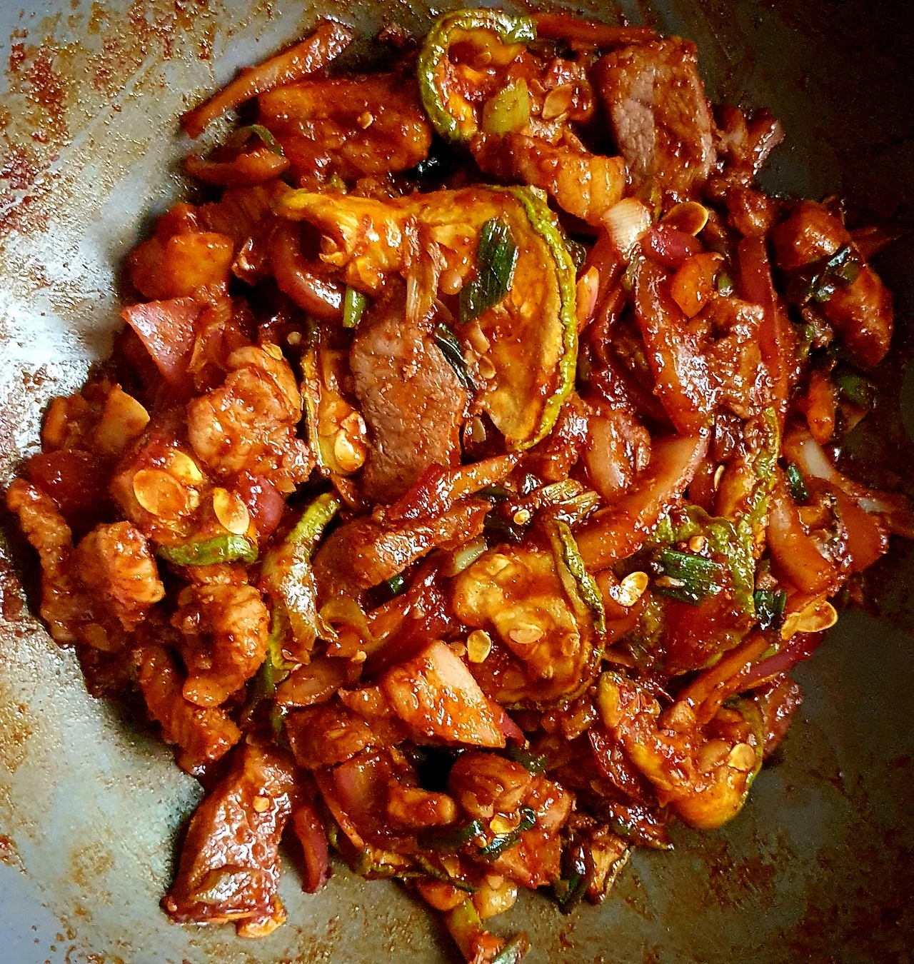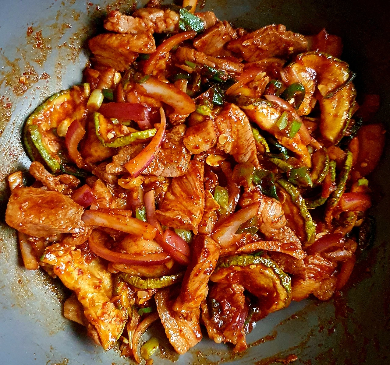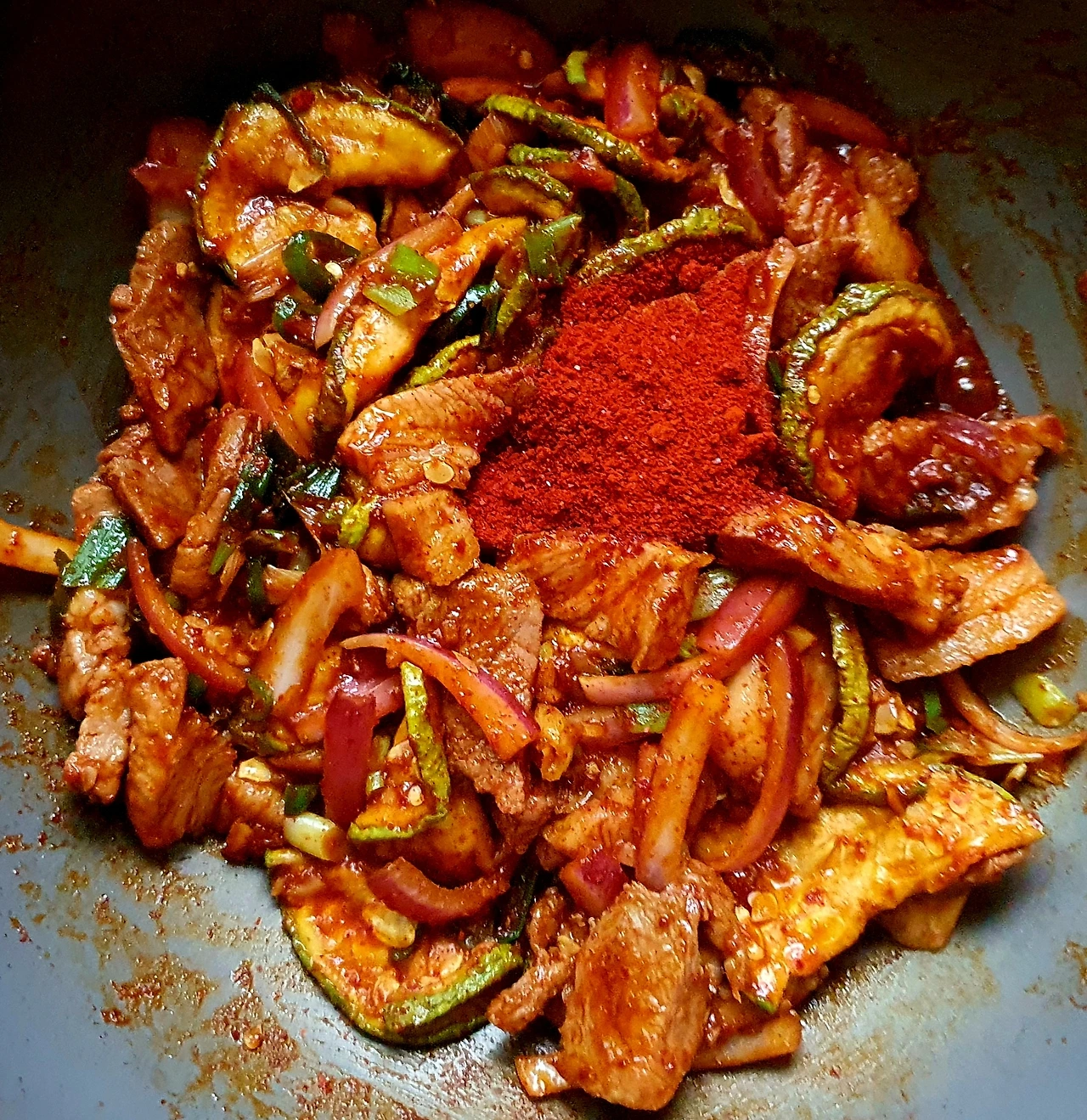• 고기색이 변하며 어느 정도 볶아지면 야채와 양념재료를 넣고 강불에서 볶아준다. 양념은 한 번에 다 넣지 말고 간을 봐 가면서 넣어준다.