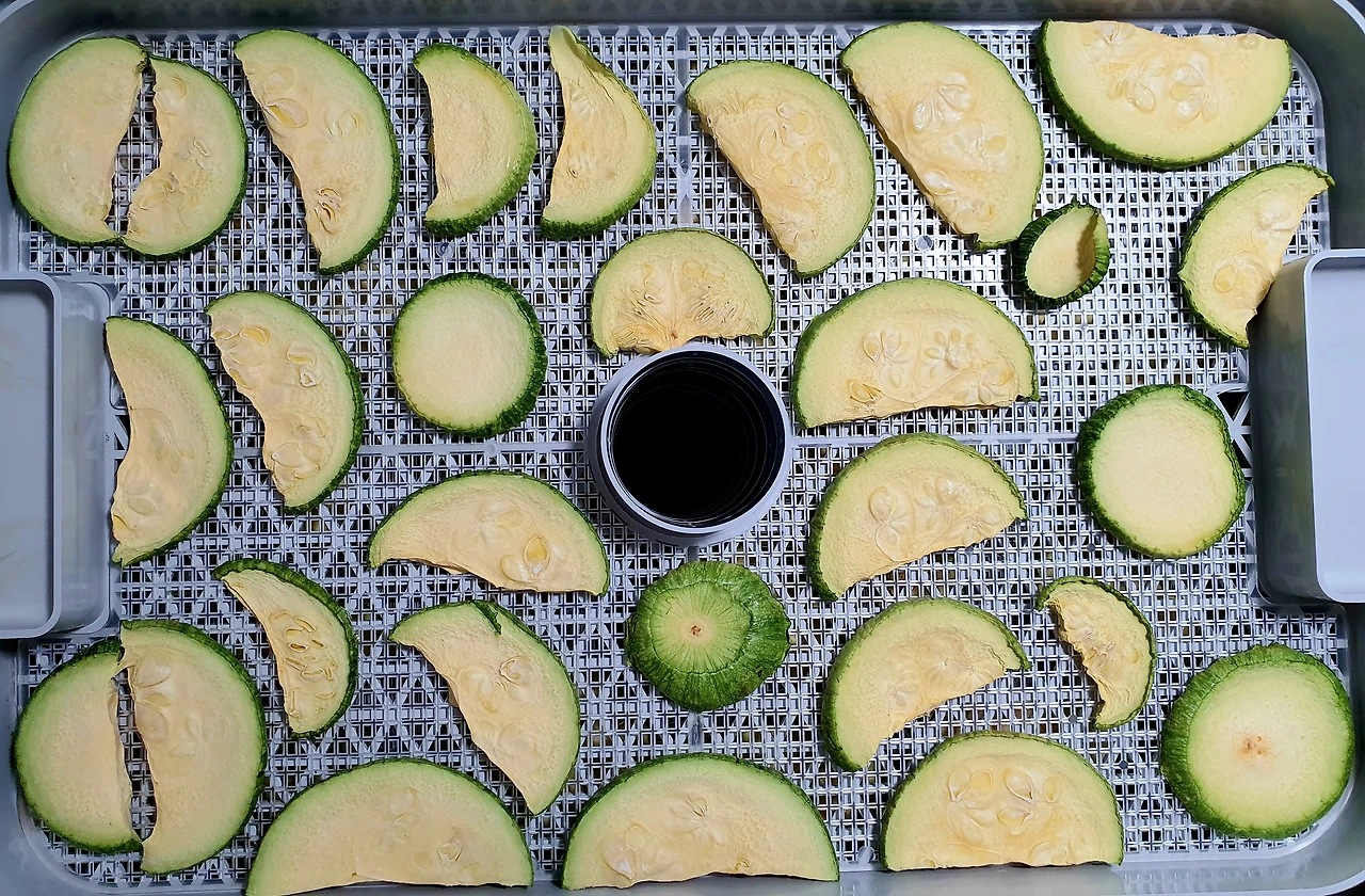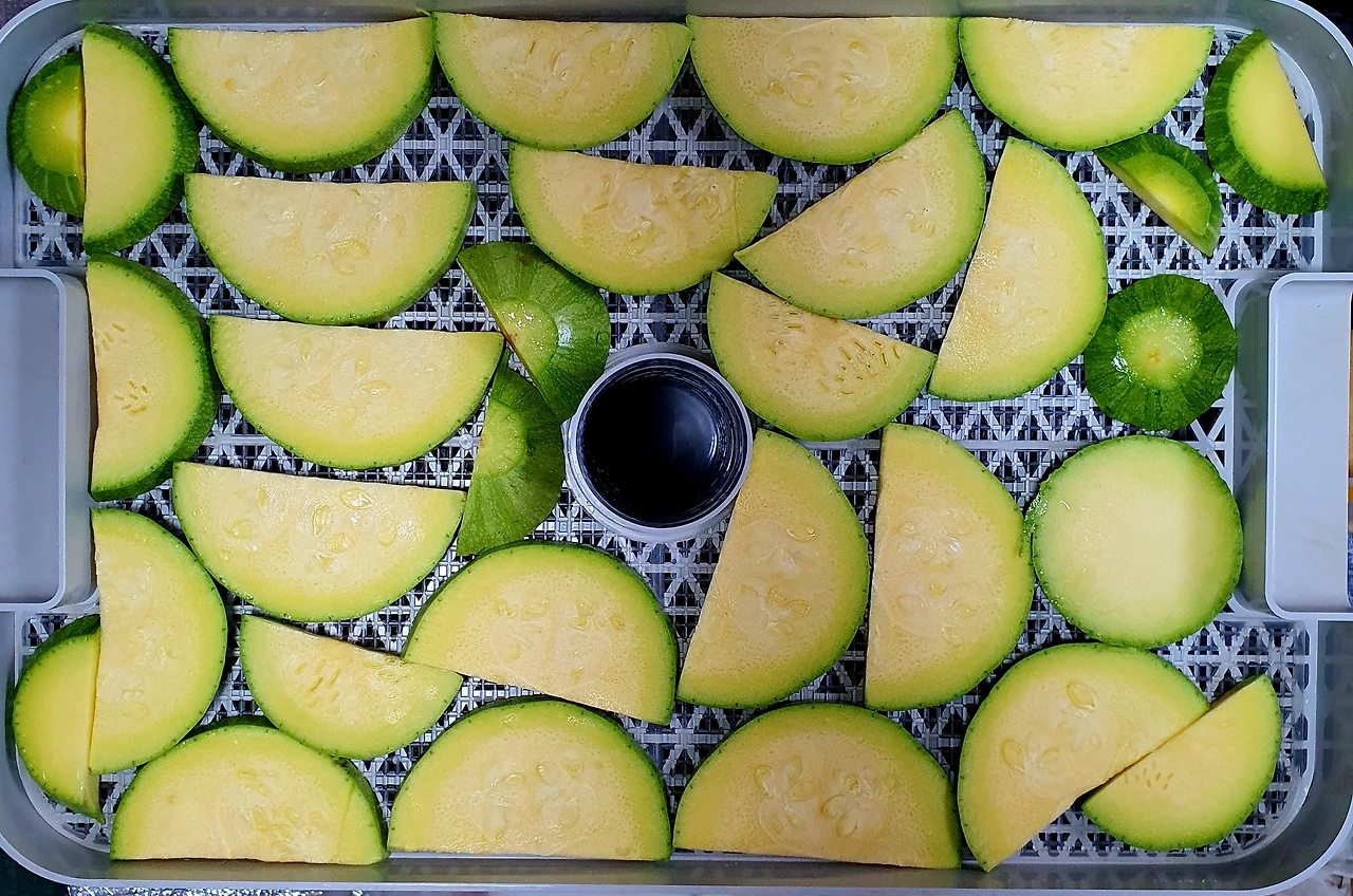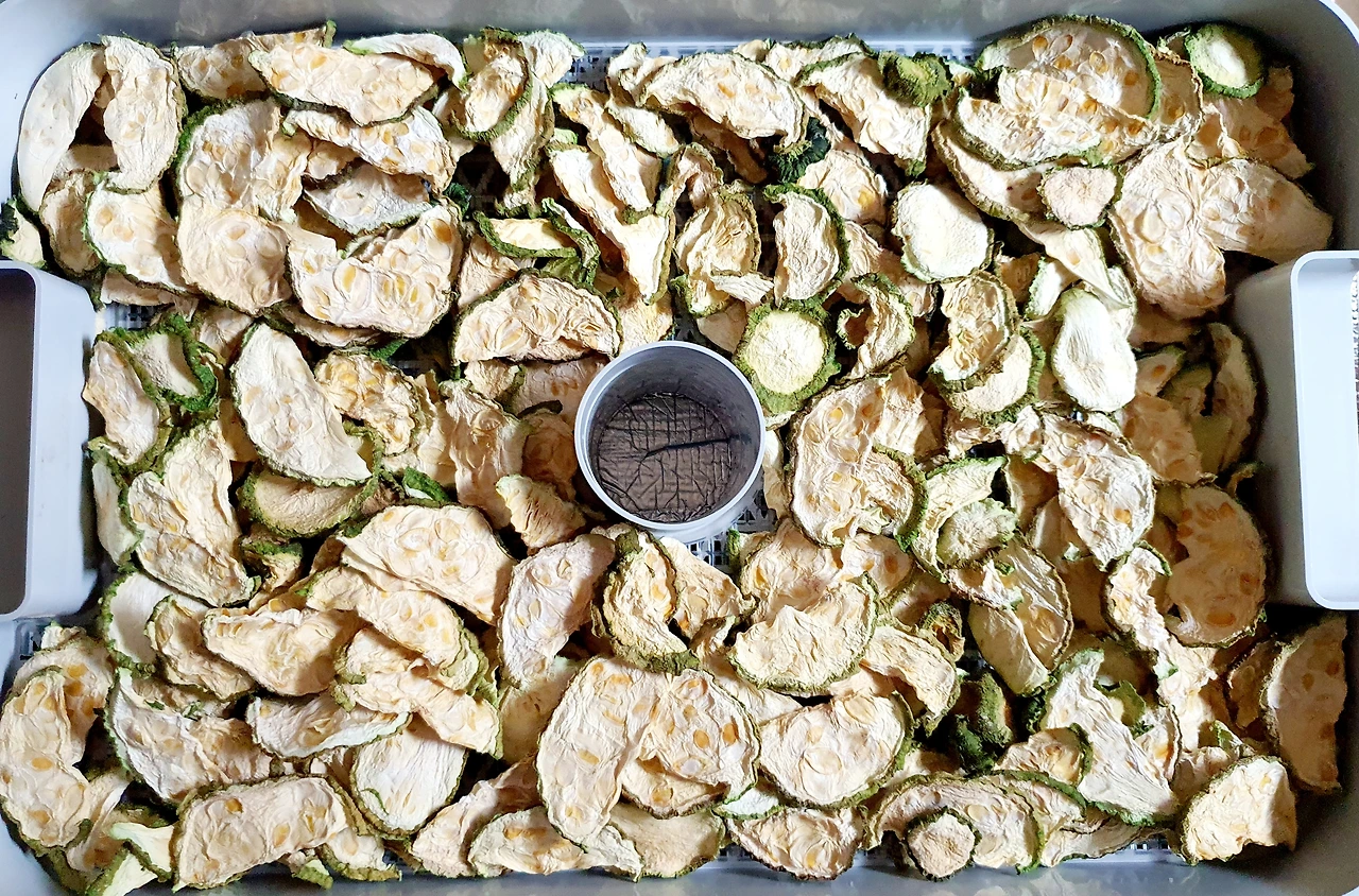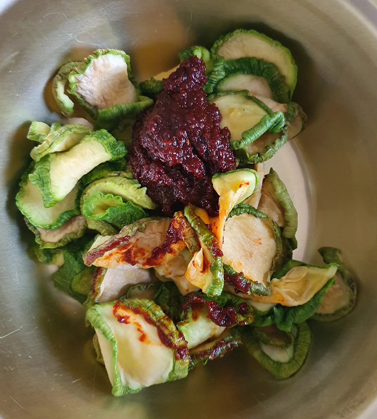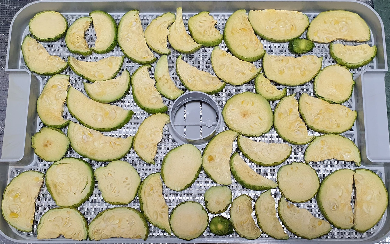 • 말리면 부피가 ⅓정도로 줄어드니 도톰하고 둥글게 또는 반달로 썰어 식품건조기에 펼쳐준다. 햇볕에 말리면 비타민D가 많아져 건강에 좋으나 요리헌터가 사는 곳이 대도시인지라 건조기로 말리기로 했음.