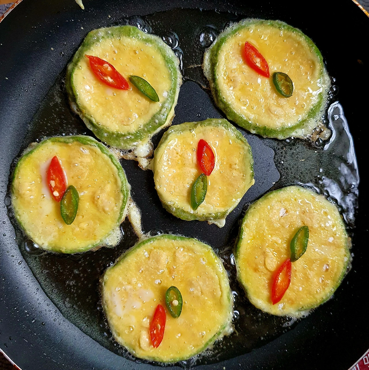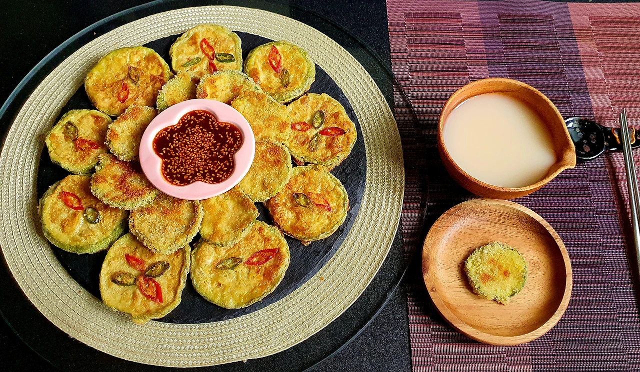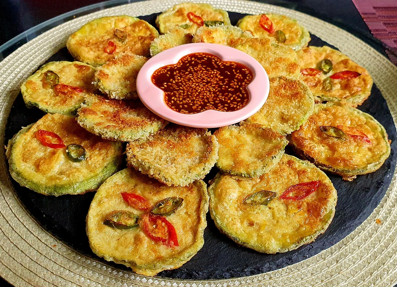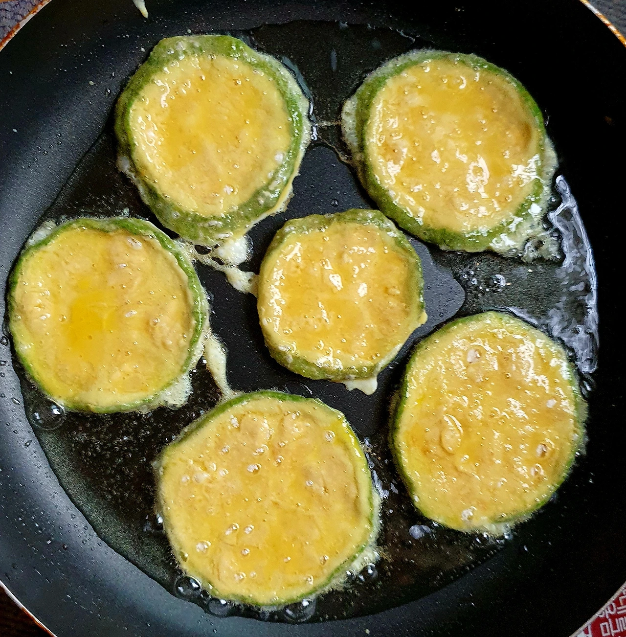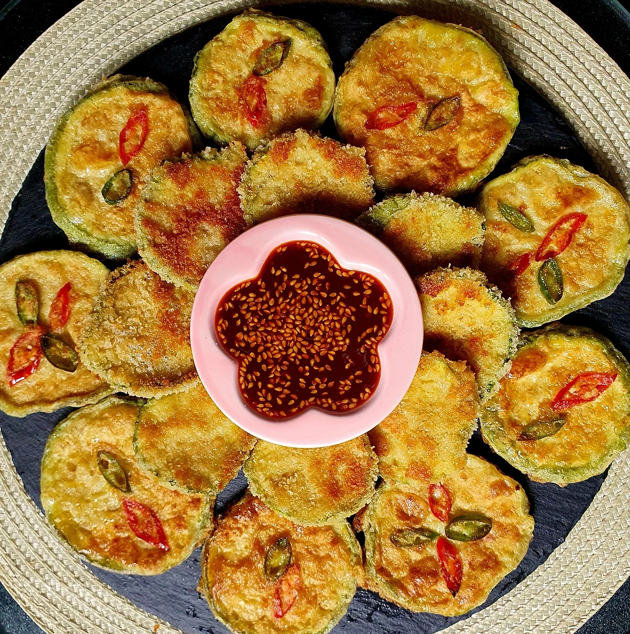 • 달군 팬에 기름을 두르고 부침가루를 입힌 호박 반은 달걀물에 담갔다가 팬에 올려 청. 홍고추를 위에 올려서 앞 뒤로 노릇하게 튀기듯 구워 주고 반은 빵가루를 입혀 구워 준다.