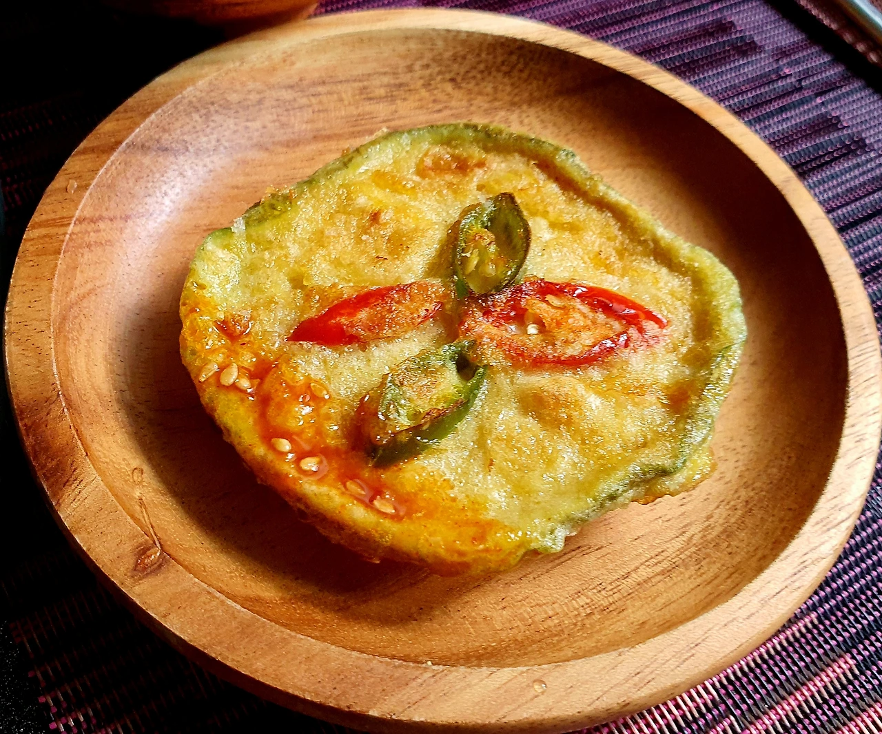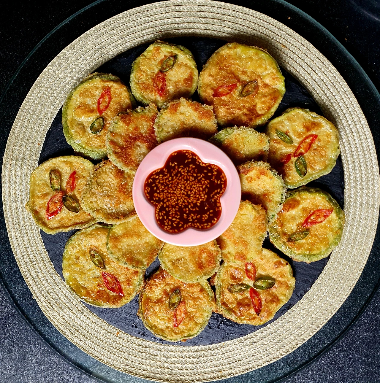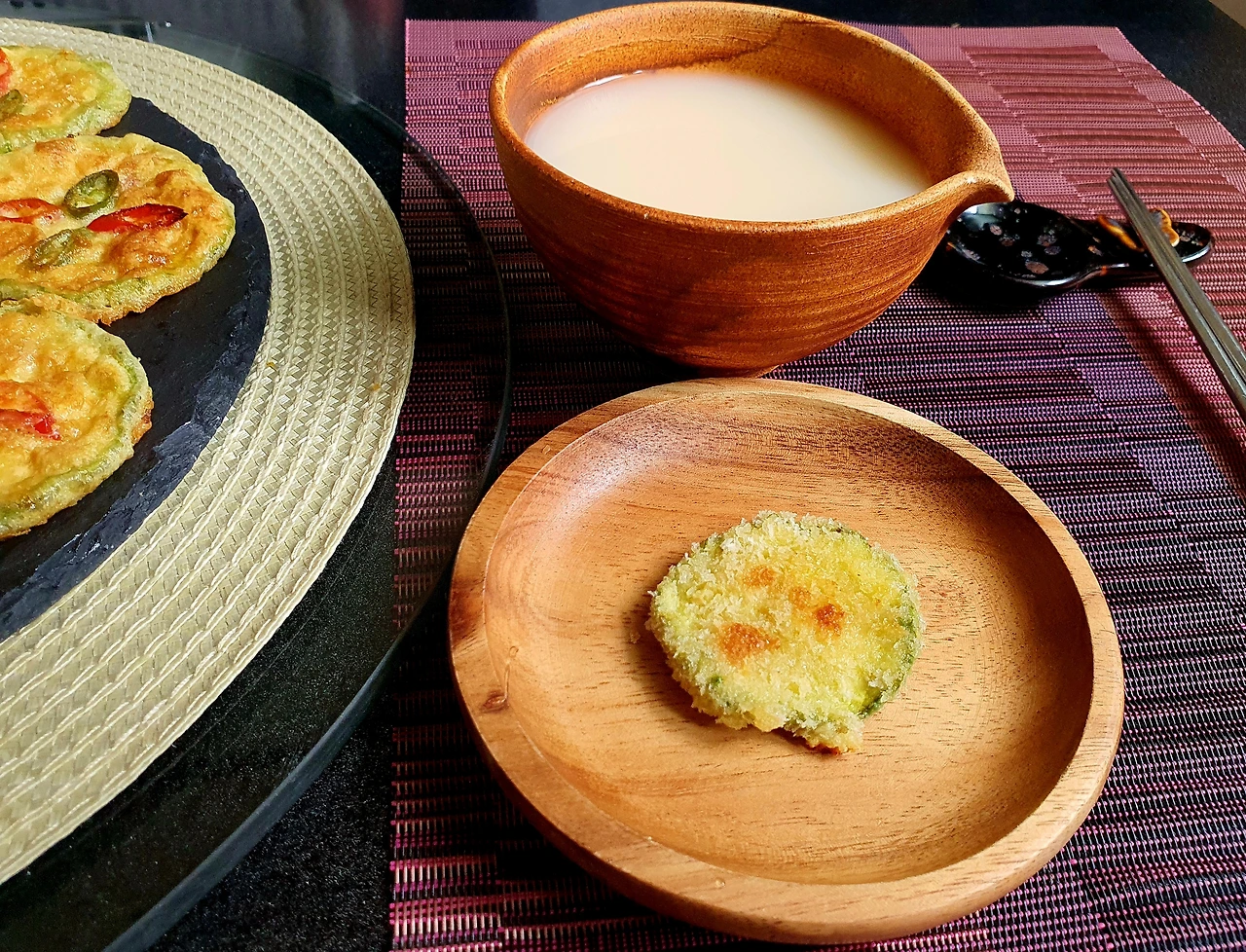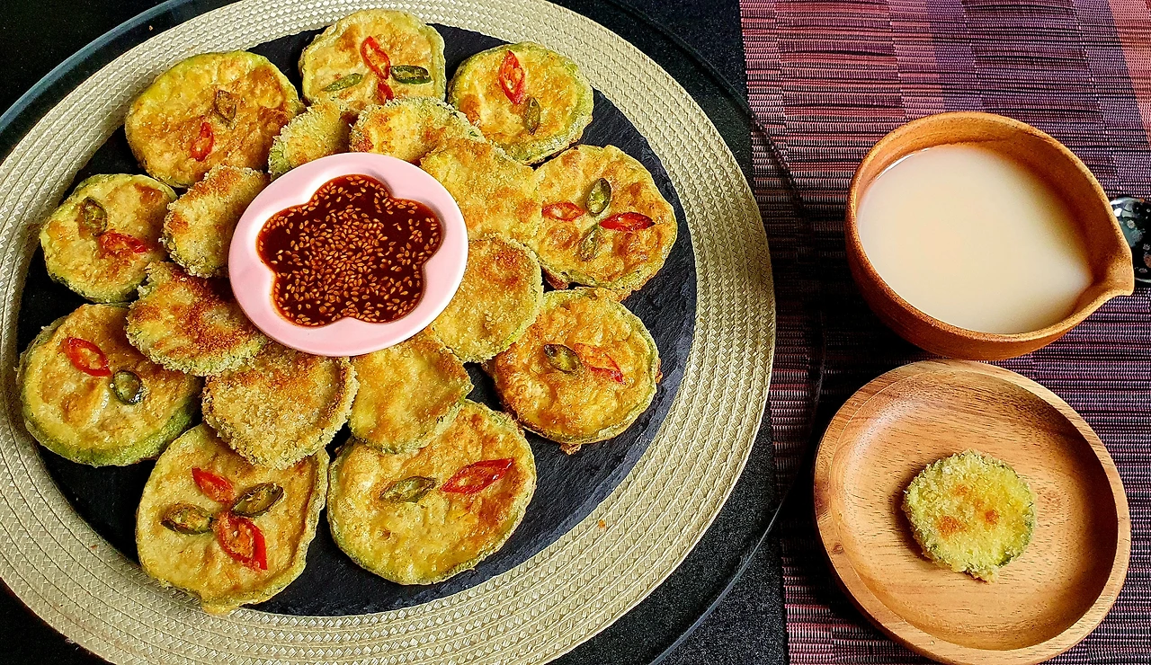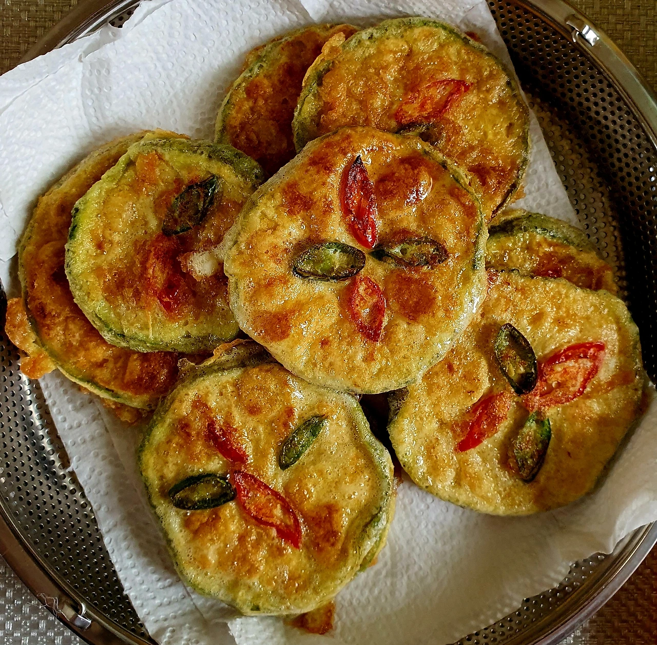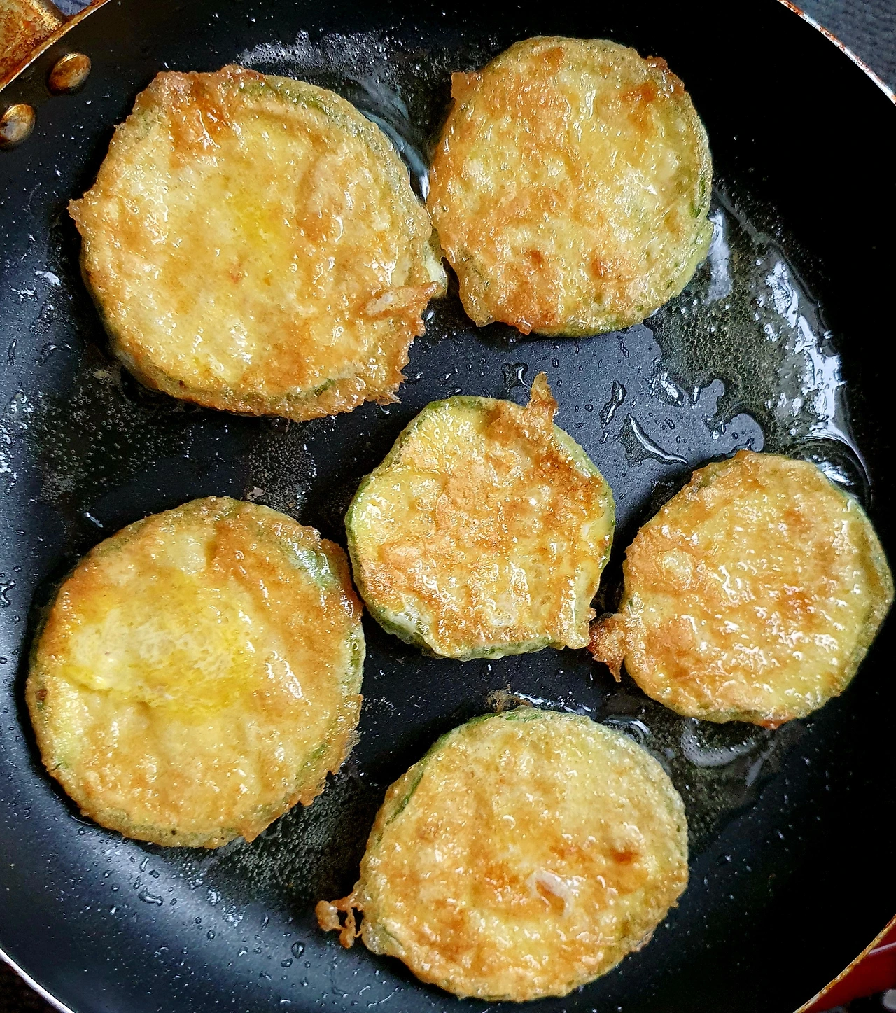 • 달군 팬에 기름을 두르고 부침가루를 입힌 호박 반은 달걀물에 담갔다가 팬에 올려 청. 홍고추를 위에 올려서 앞 뒤로 노릇하게 튀기듯 구워 주고 반은 빵가루를 입혀 구워 준다.