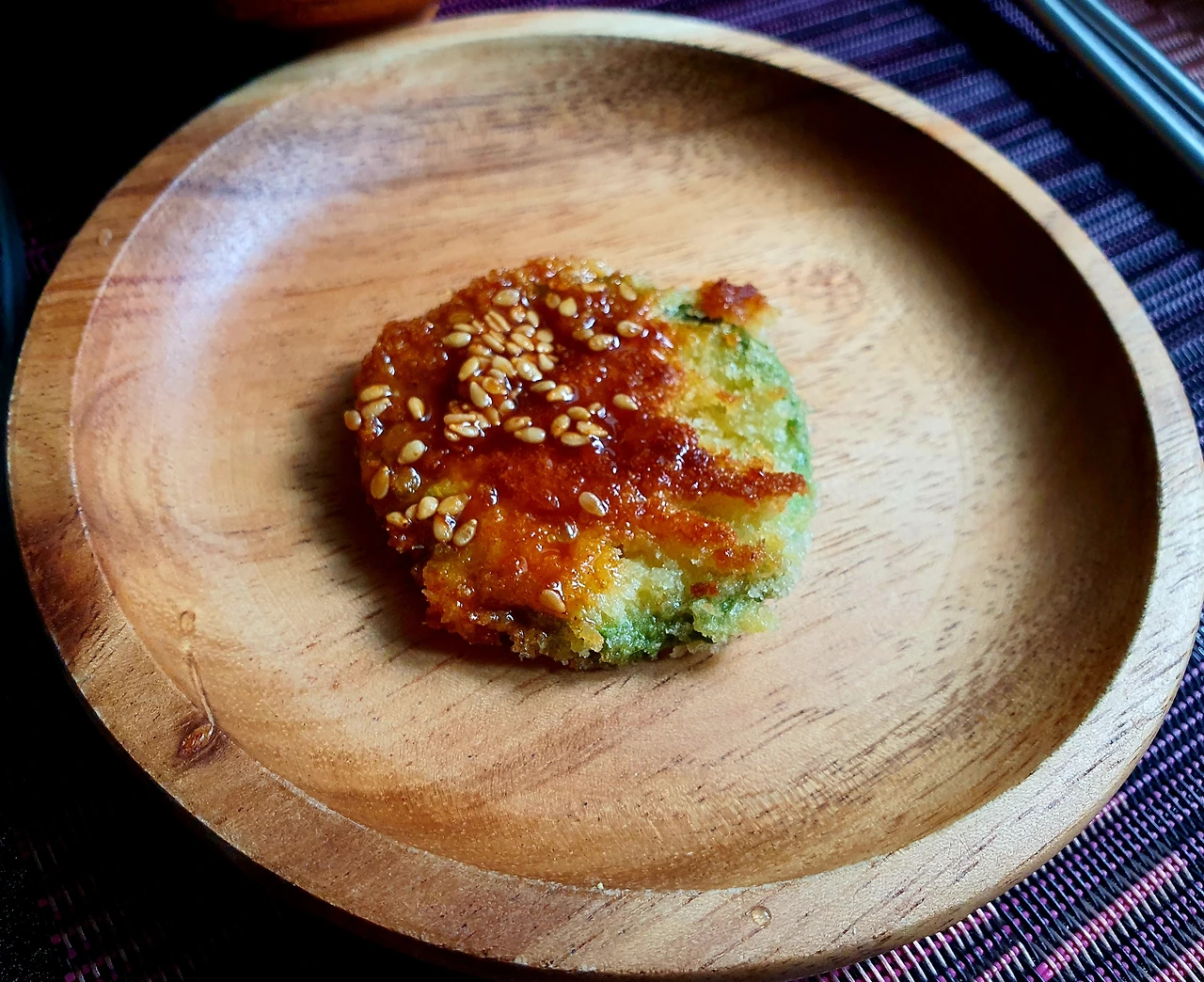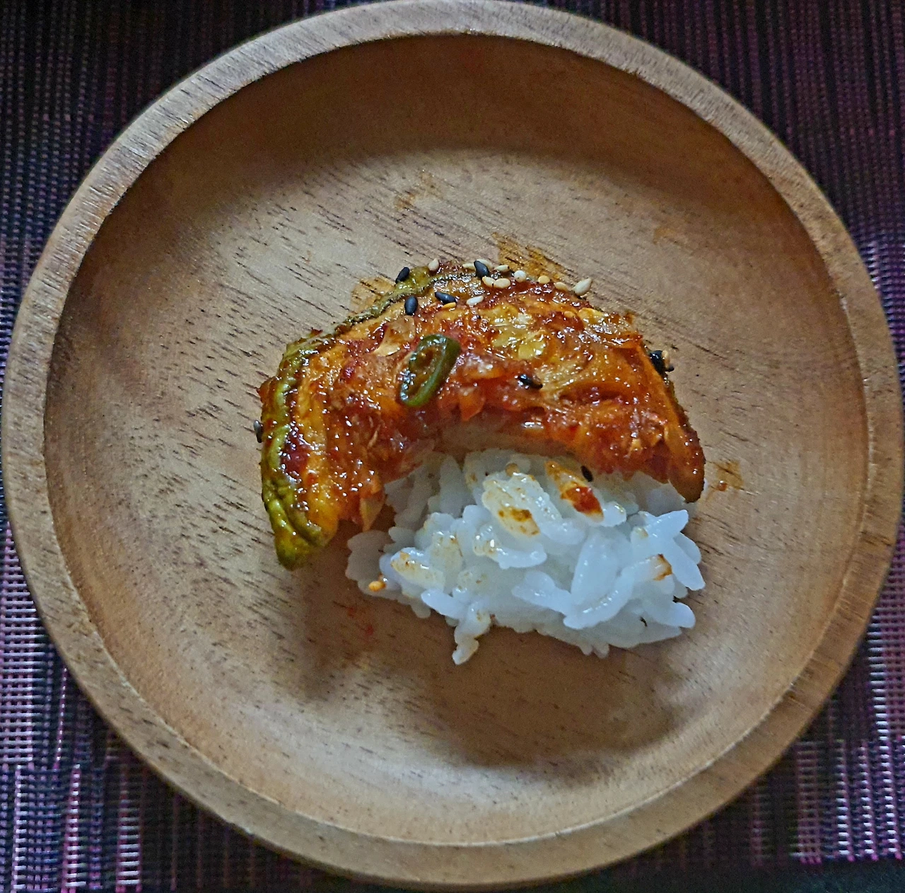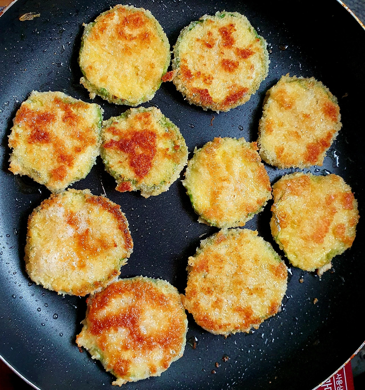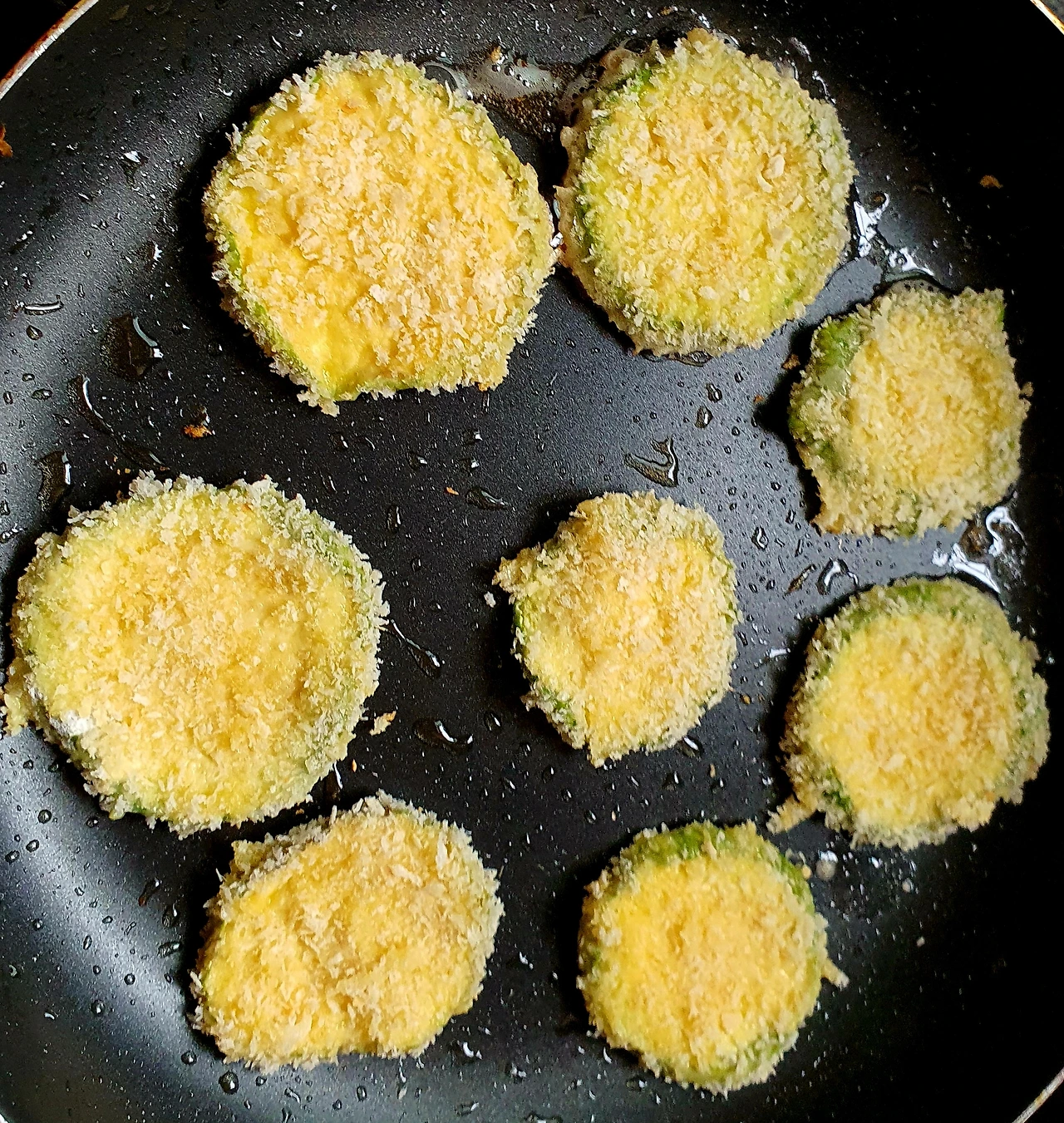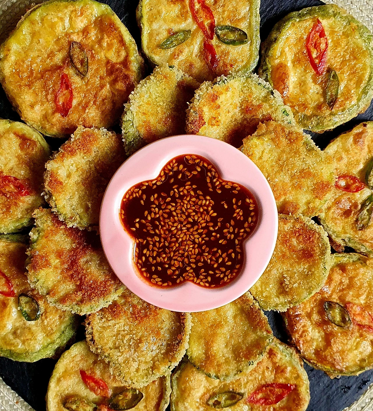 • 달군 팬에 기름을 두르고 부침가루를 입힌 호박 반은 달걀물에 담갔다가 팬에 올려 청. 홍고추를 위에 올려서 앞 뒤로 노릇하게 튀기듯 구워 주고 반은 빵가루를 입혀 구워 준다.