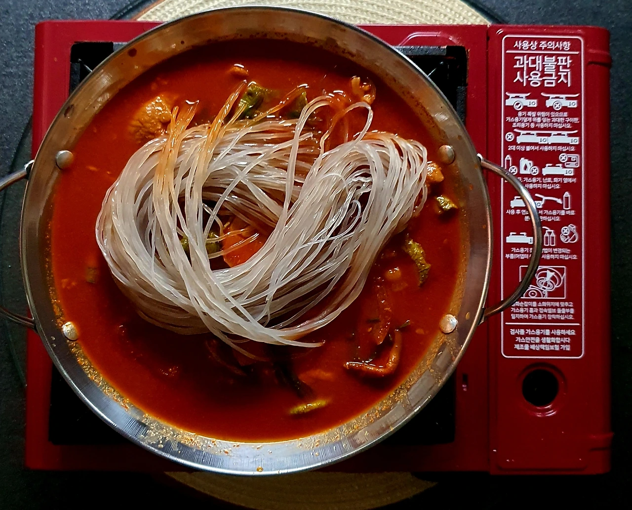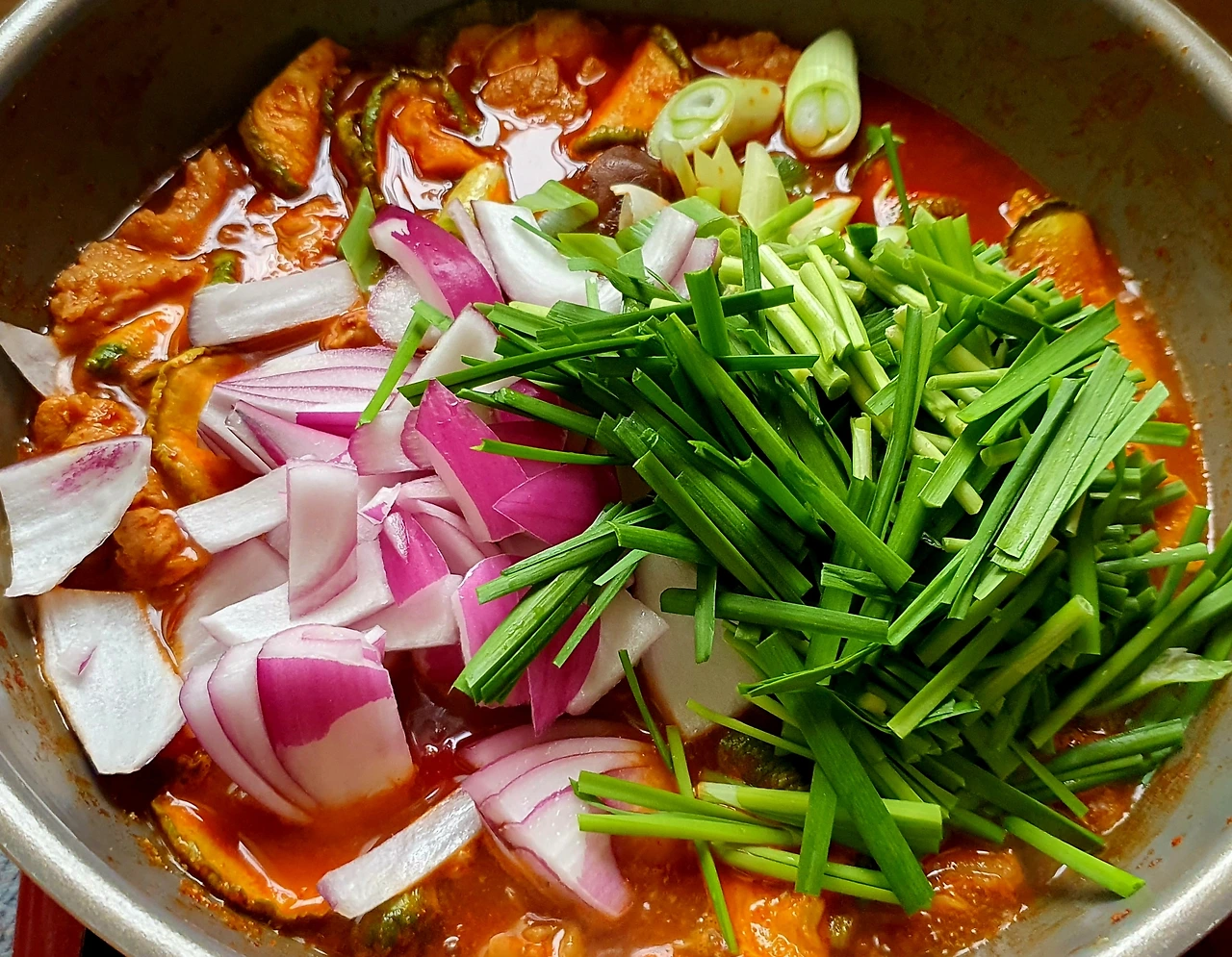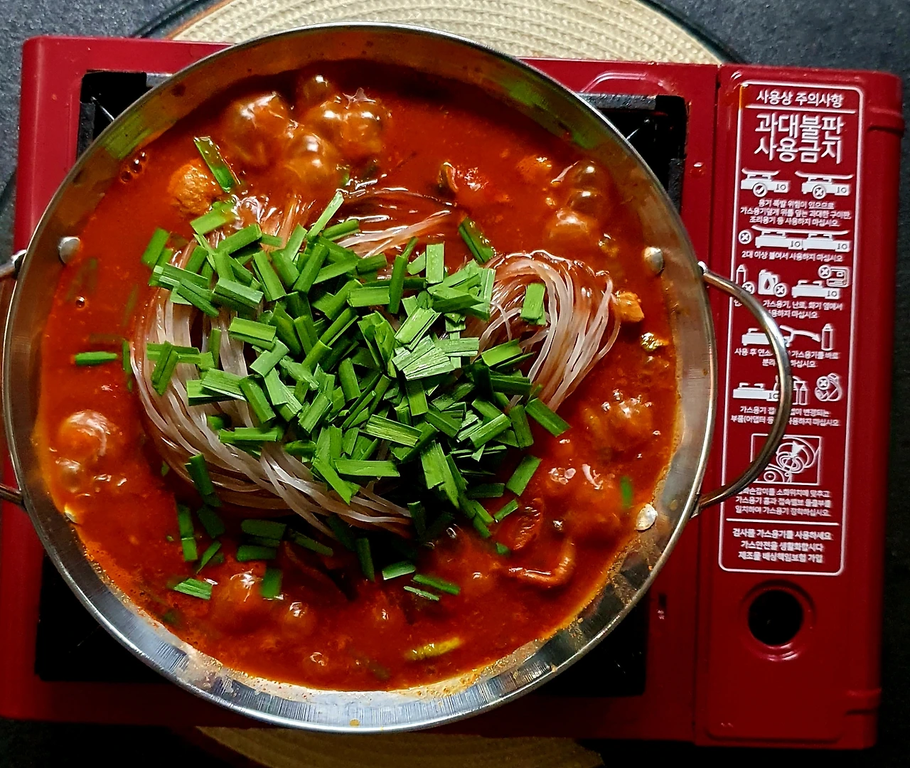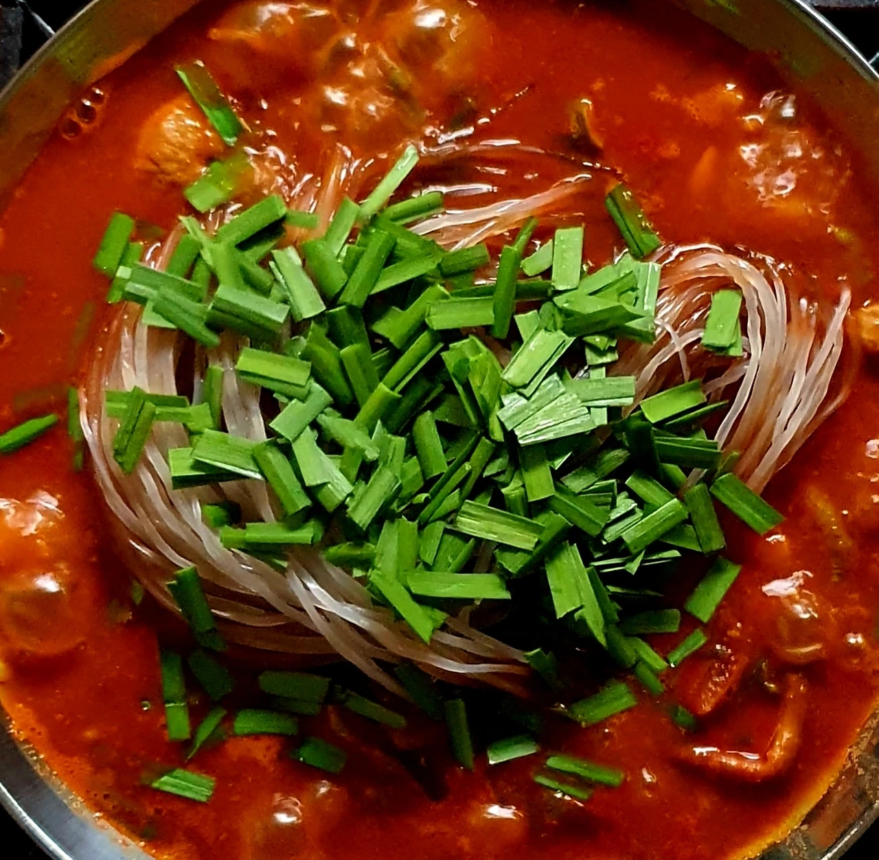 • 어느 정도 볶아지면 육수와 양파, 부추, 대파를 넣고 끓여주다가 부족한 간은 나머지 양념장으로 간을 보며 끓여 준 뒤 상위에 올리기 전 고명용 부추와 당면도 넣고 상위에서 자글자글 졸이면서 먹음 완성.