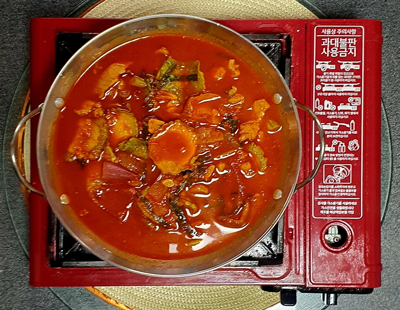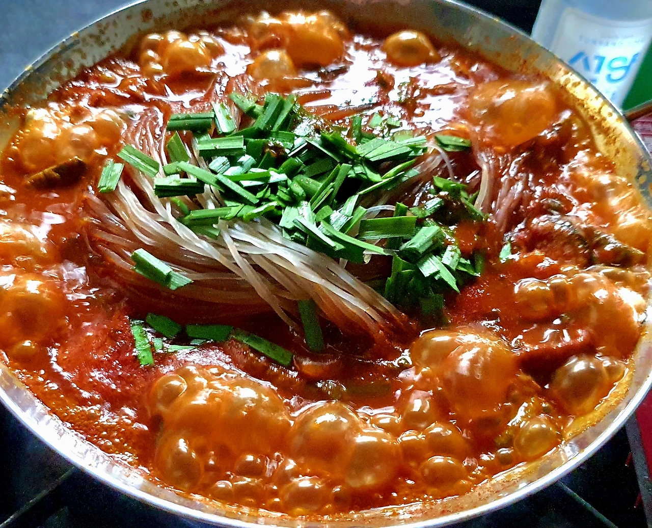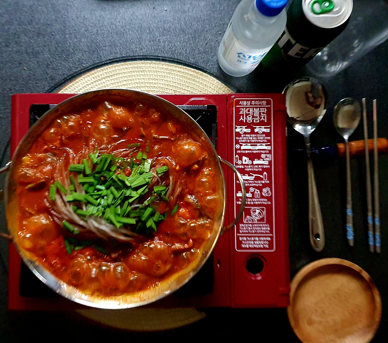 • 어느 정도 볶아지면 육수와 양파, 부추, 대파를 넣고 끓여주다가 부족한 간은 나머지 양념장으로 간을 보며 끓여 준 뒤 상위에 올리기 전 고명용 부추와 당면도 넣고 상위에서 자글자글 졸이면서 먹음 완성.