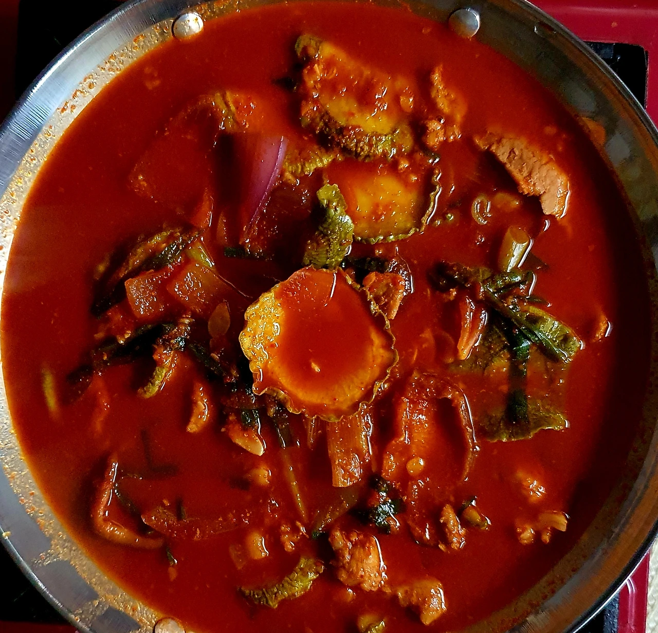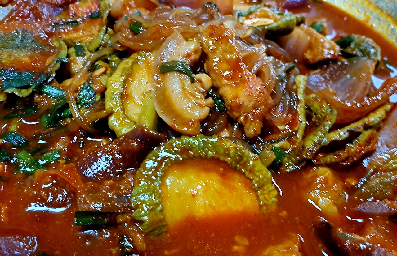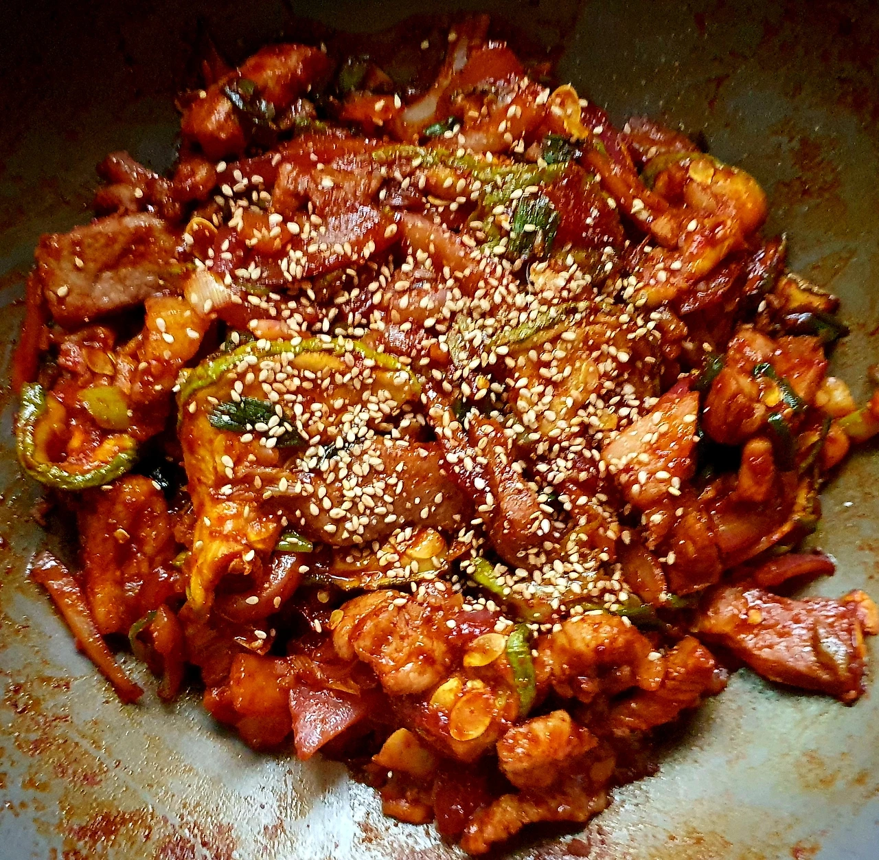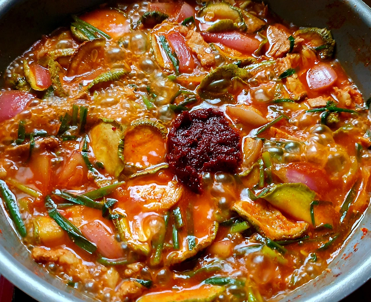 • 어느 정도 볶아지면 육수와 양파, 부추, 대파를 넣고 끓여주다가 부족한 간은 나머지 양념장으로 간을 보며 끓여 준 뒤 상위에 올리기 전 고명용 부추와 당면도 넣고 상위에서 자글자글 졸이면서 먹음 완성.