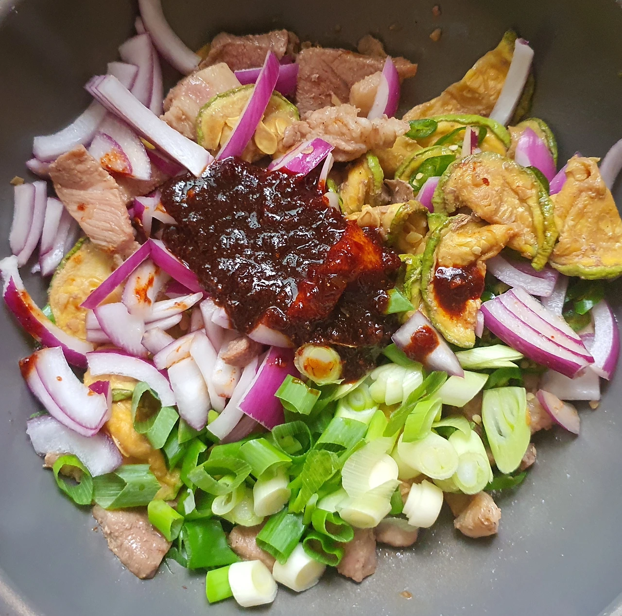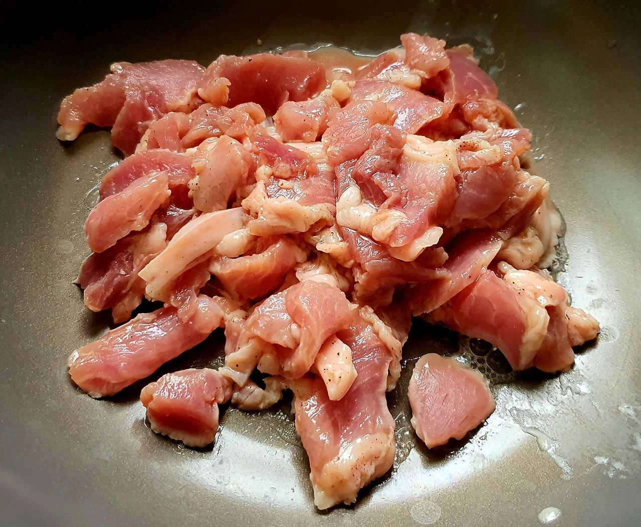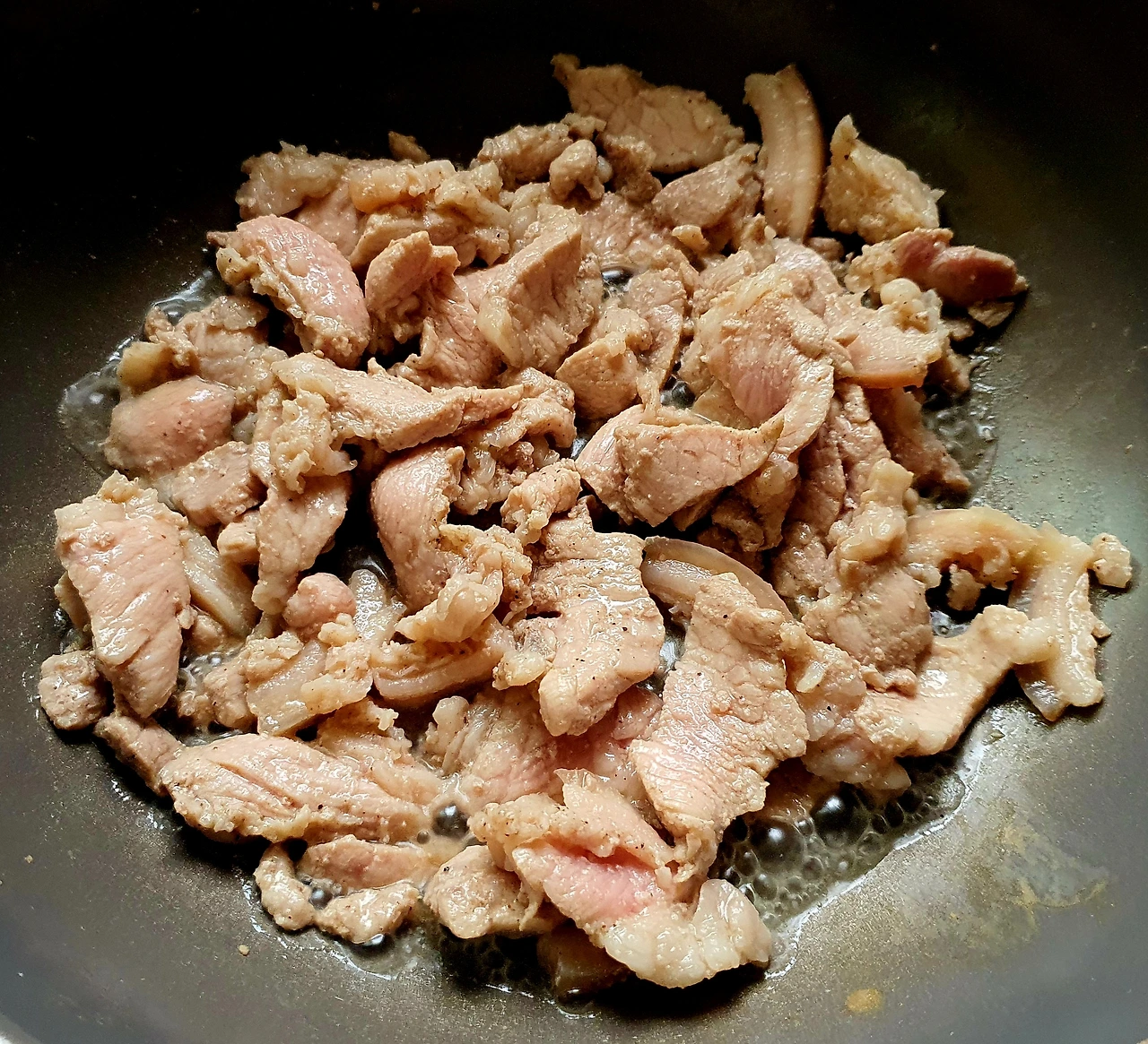• 달군 팬에 식용유를 조금만 두르고 중 약불에서 재워두었던 고기와 호박을 올리고 살짝 익을 때까지 볶아준다. 볶으면서 탈것 같으면 기름을 넣지 말고 물을 조금씩 넣어가며 볶아준다.