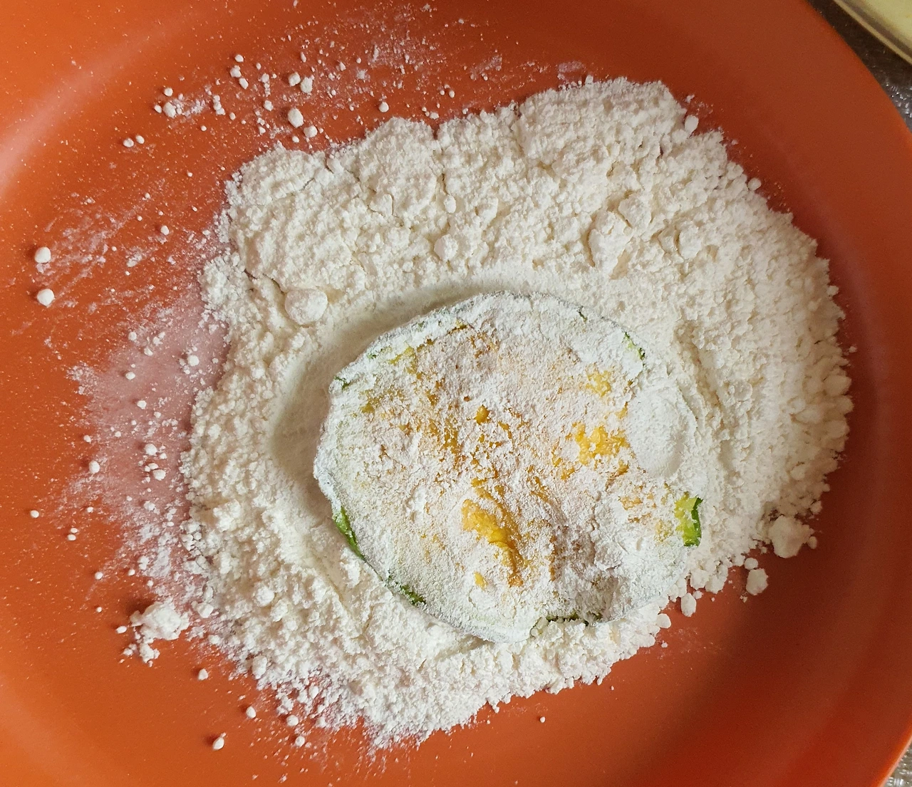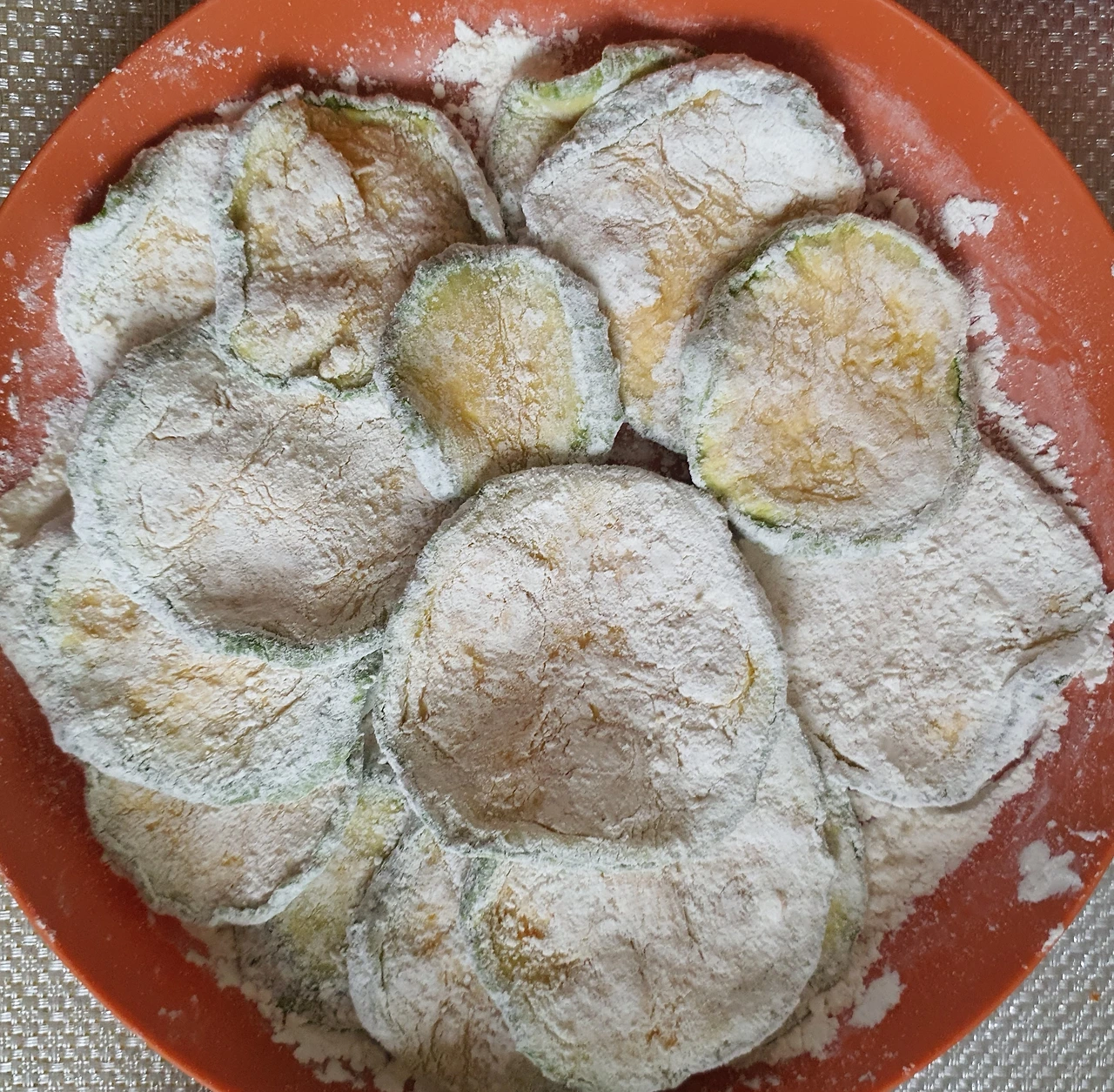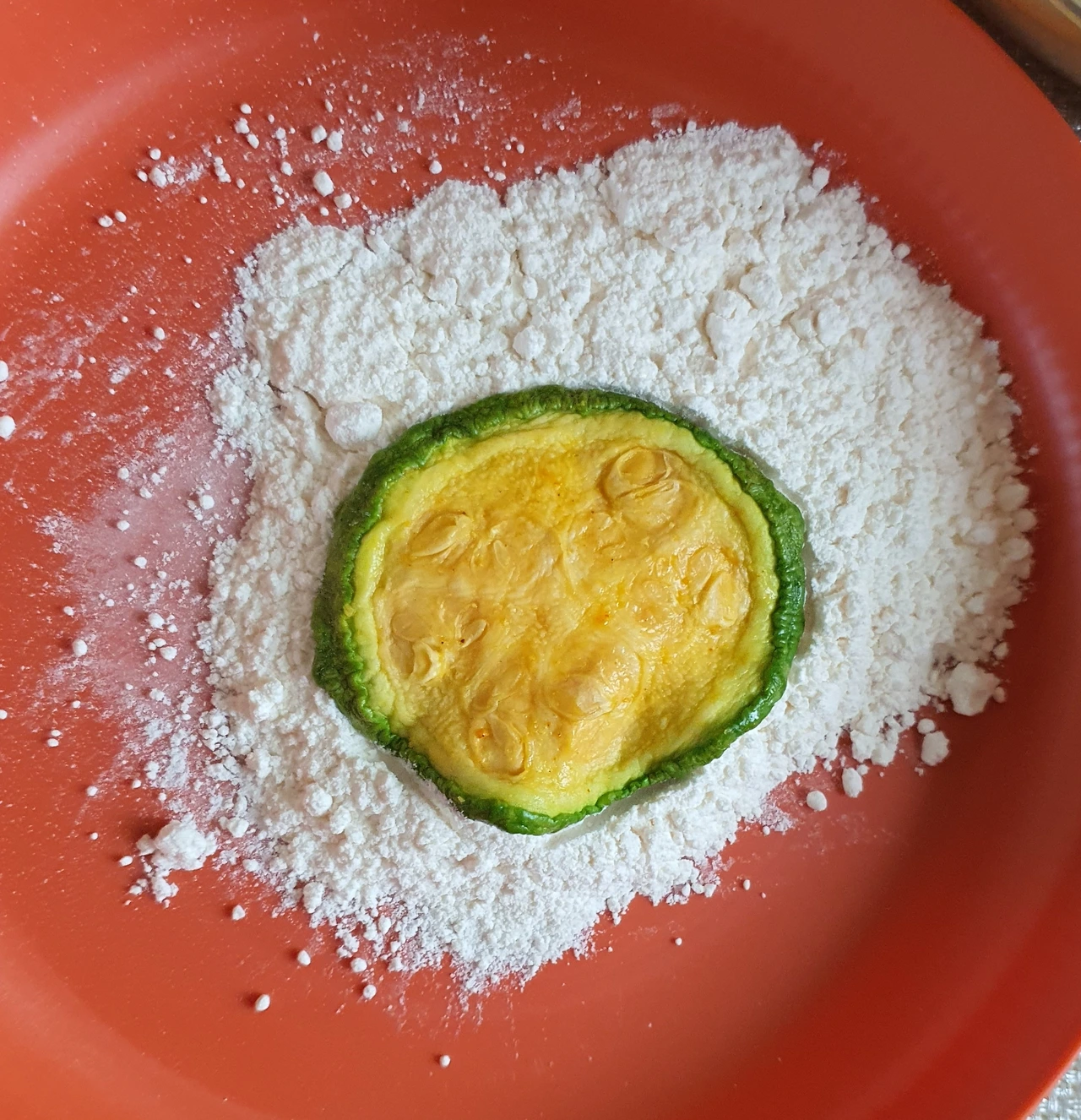 • 수분을 뺀 호박고지는 부침가루를 앞뒤로 굴려준다.