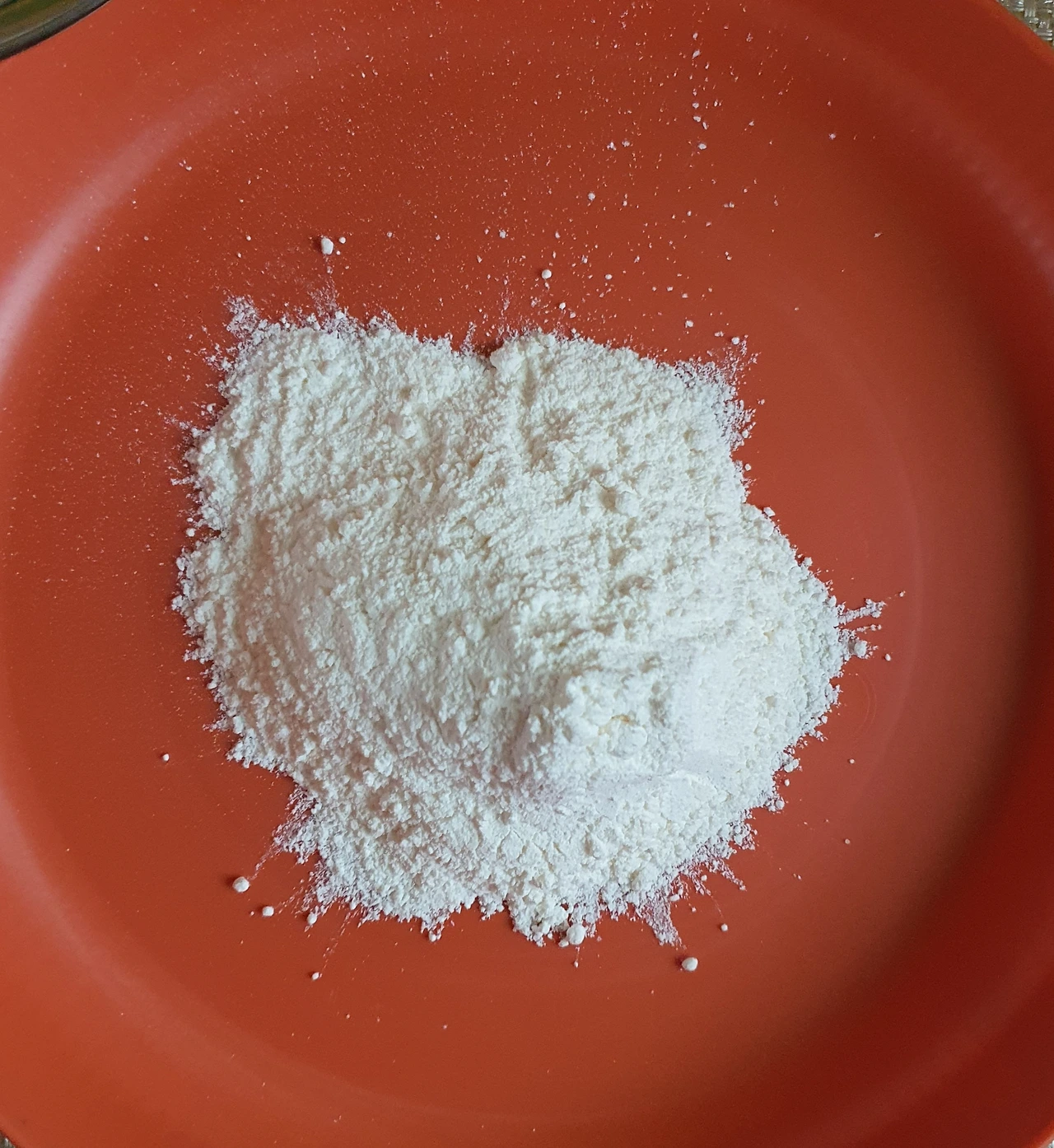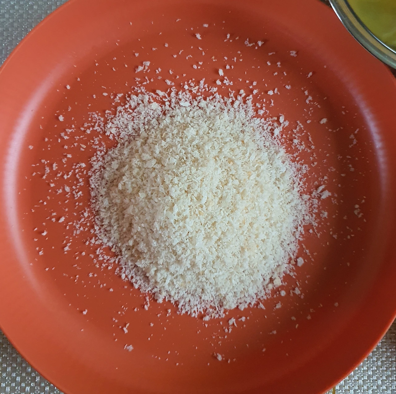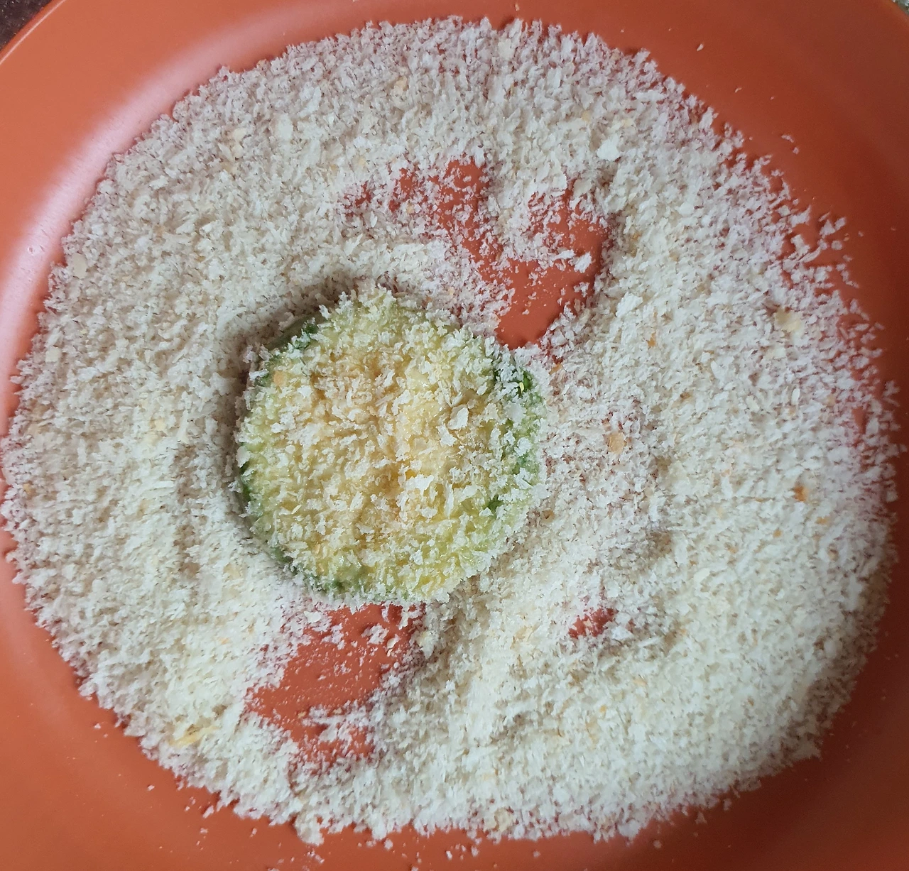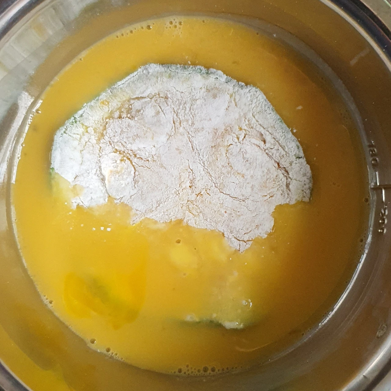 • 수분을 뺀 호박고지는 부침가루를 앞뒤로 굴려준다.