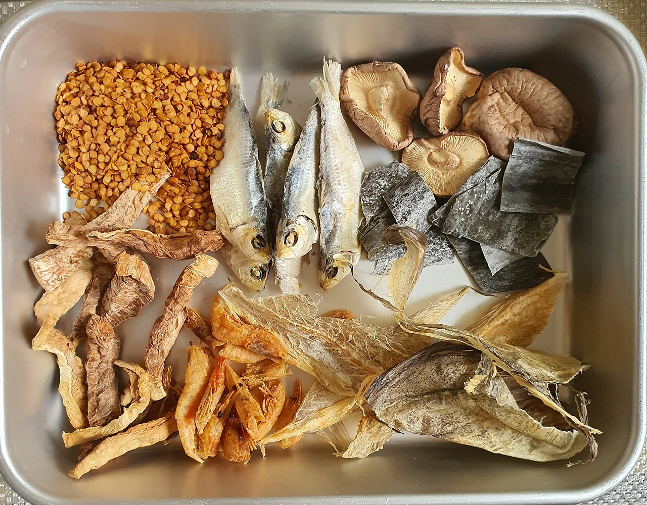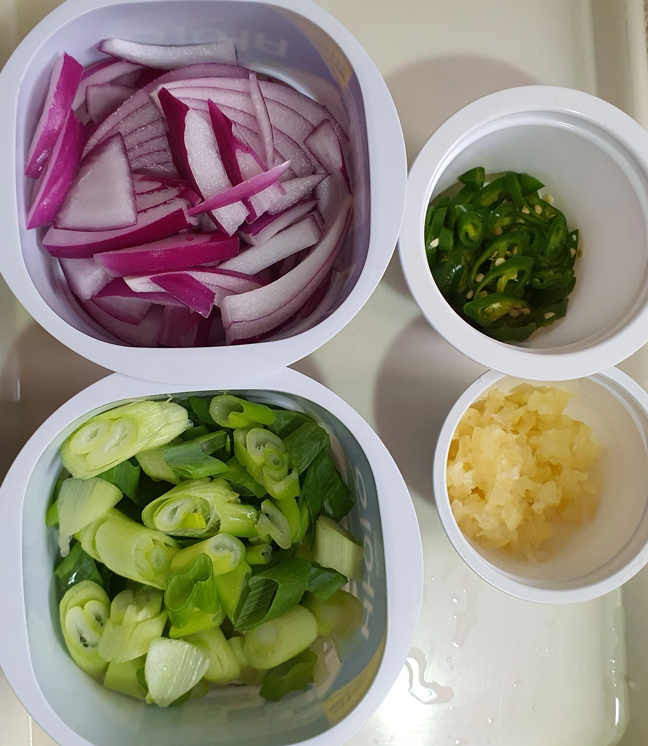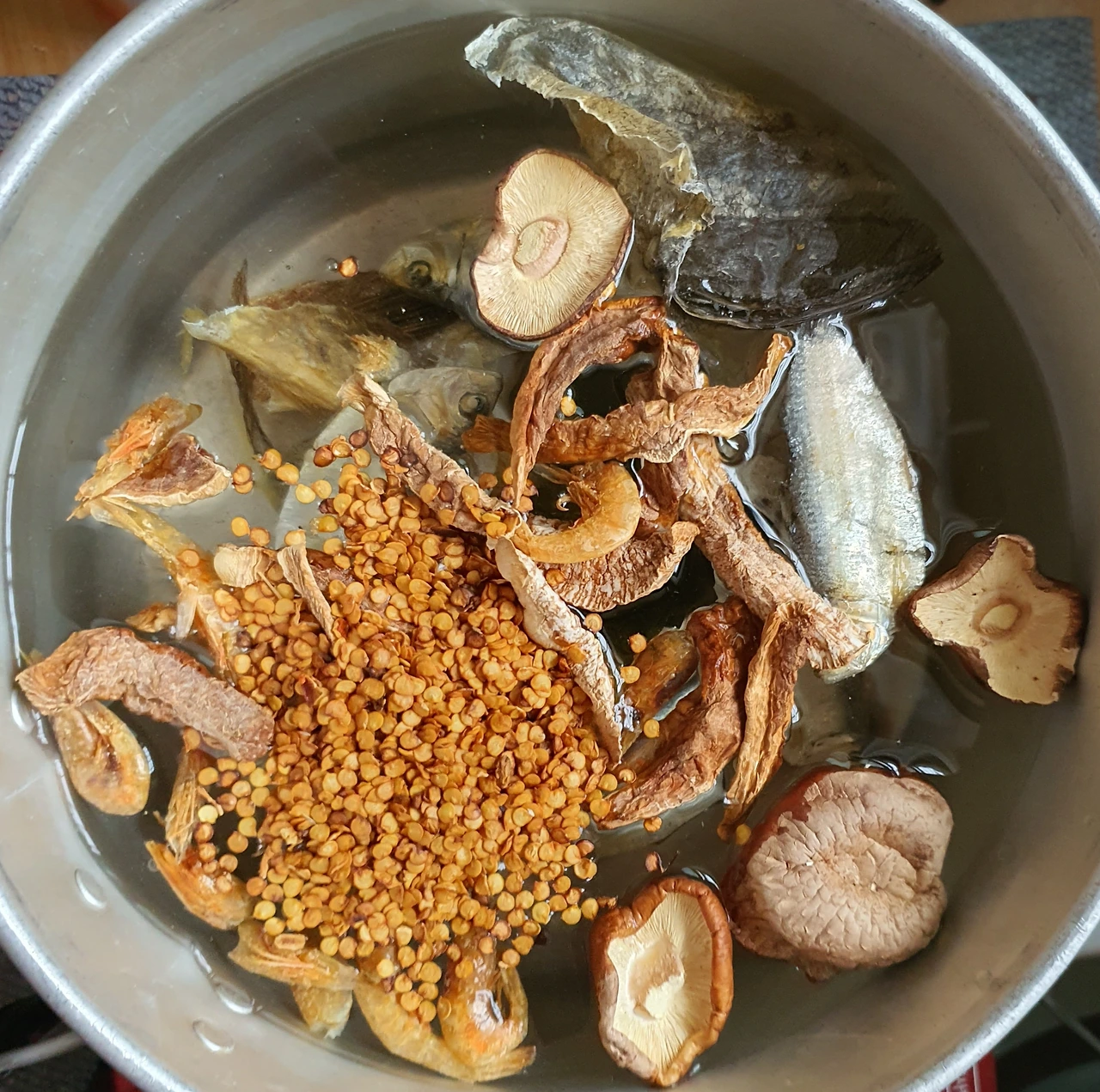 ■ 육수 : 디포리 5마리, 다시마 10조각, 건표고버섯 6개, 고추씨 3큰술, 건새우 1줌, 명태껍질 1줌, 무말랭이 1줌 등으로 육수 2리터 만들어 냉장 보관.