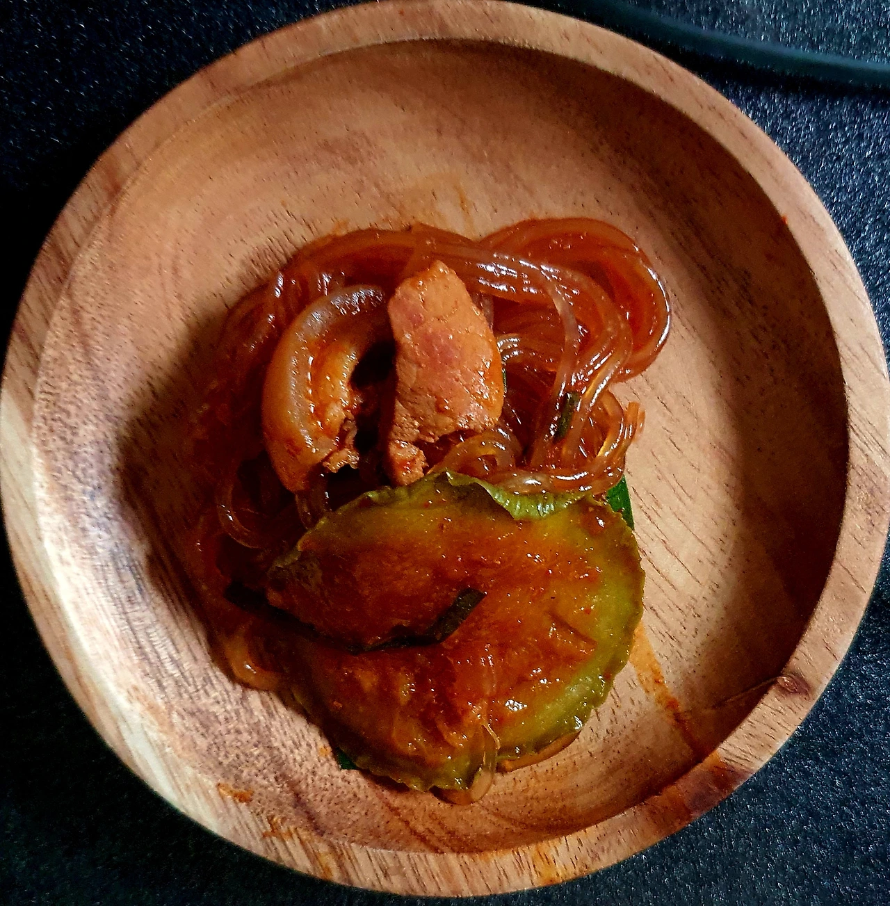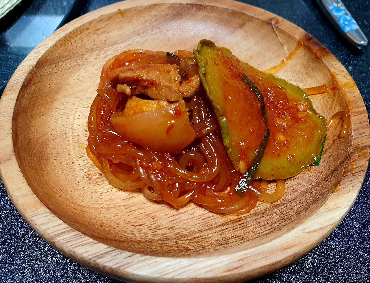 ■ 재료 : 호박고지 1컵, 돼지 앞다리살 200g, 대파 1대, 양파 ½개. 당면 1줌. 부추 조금. 육수 800ml
