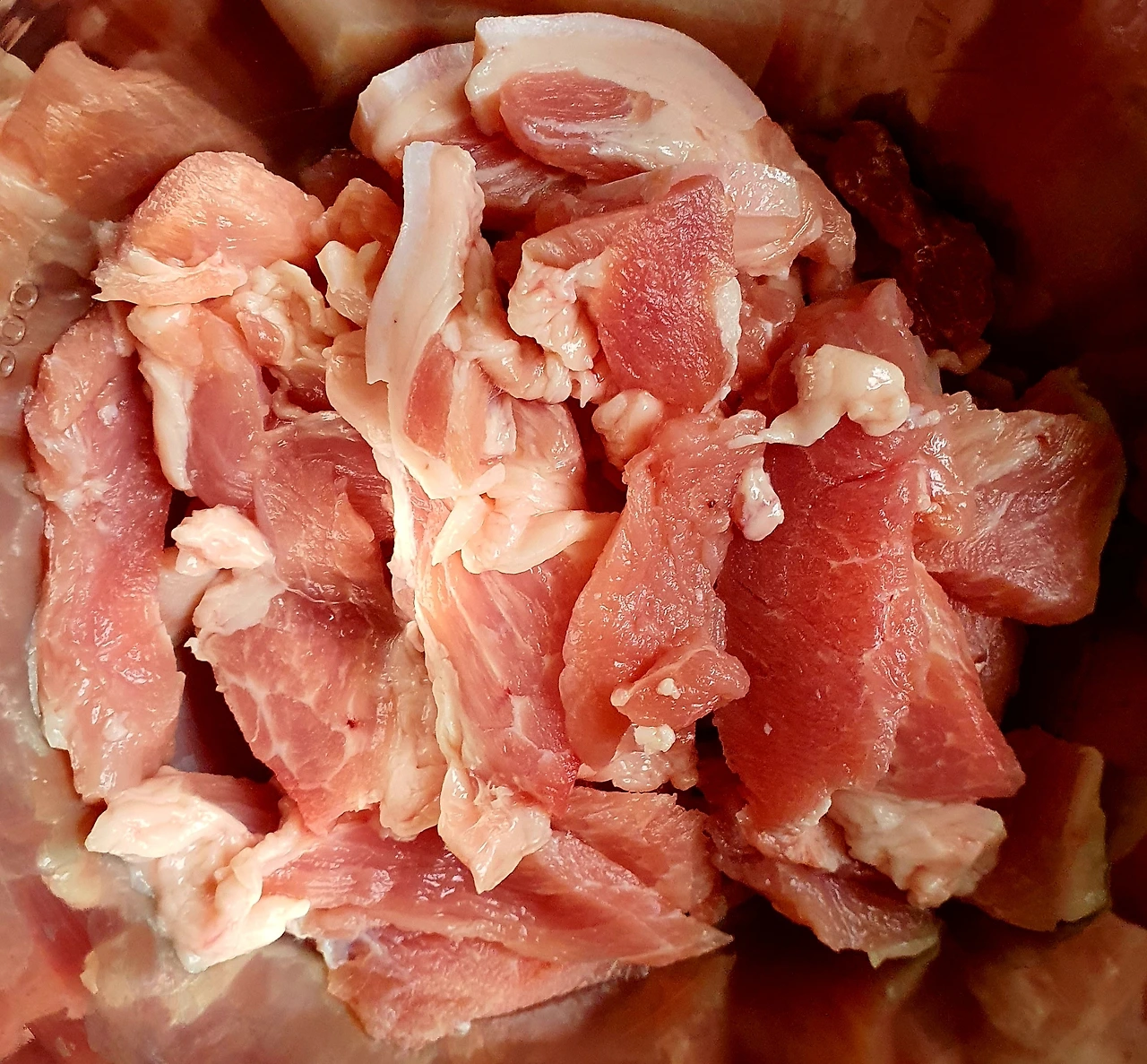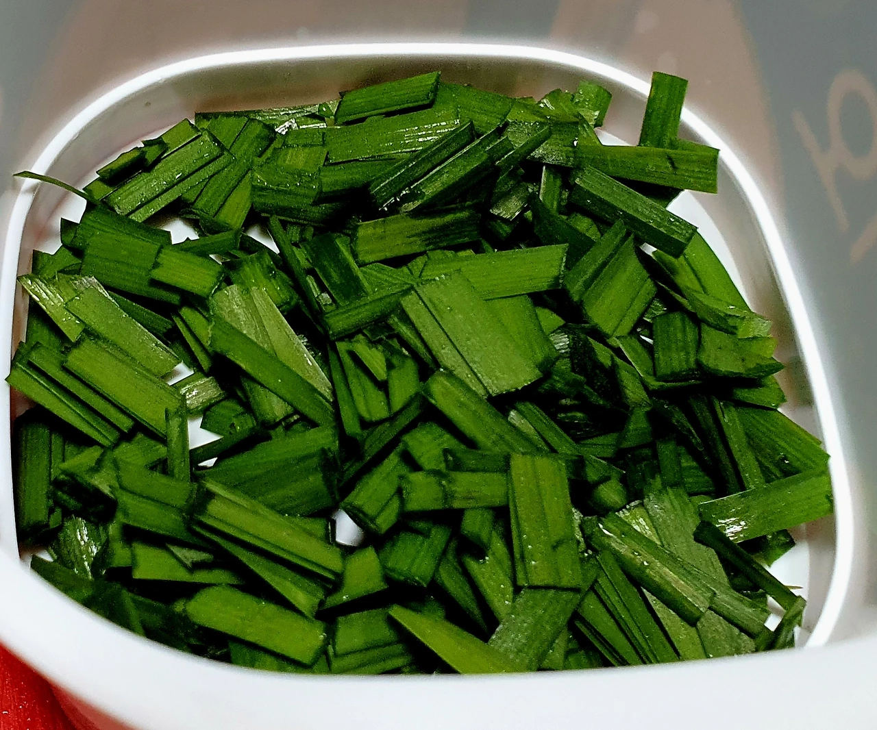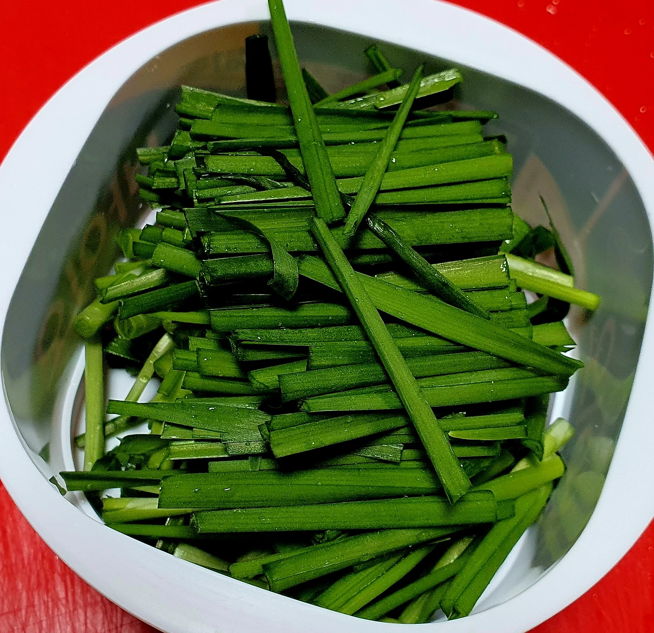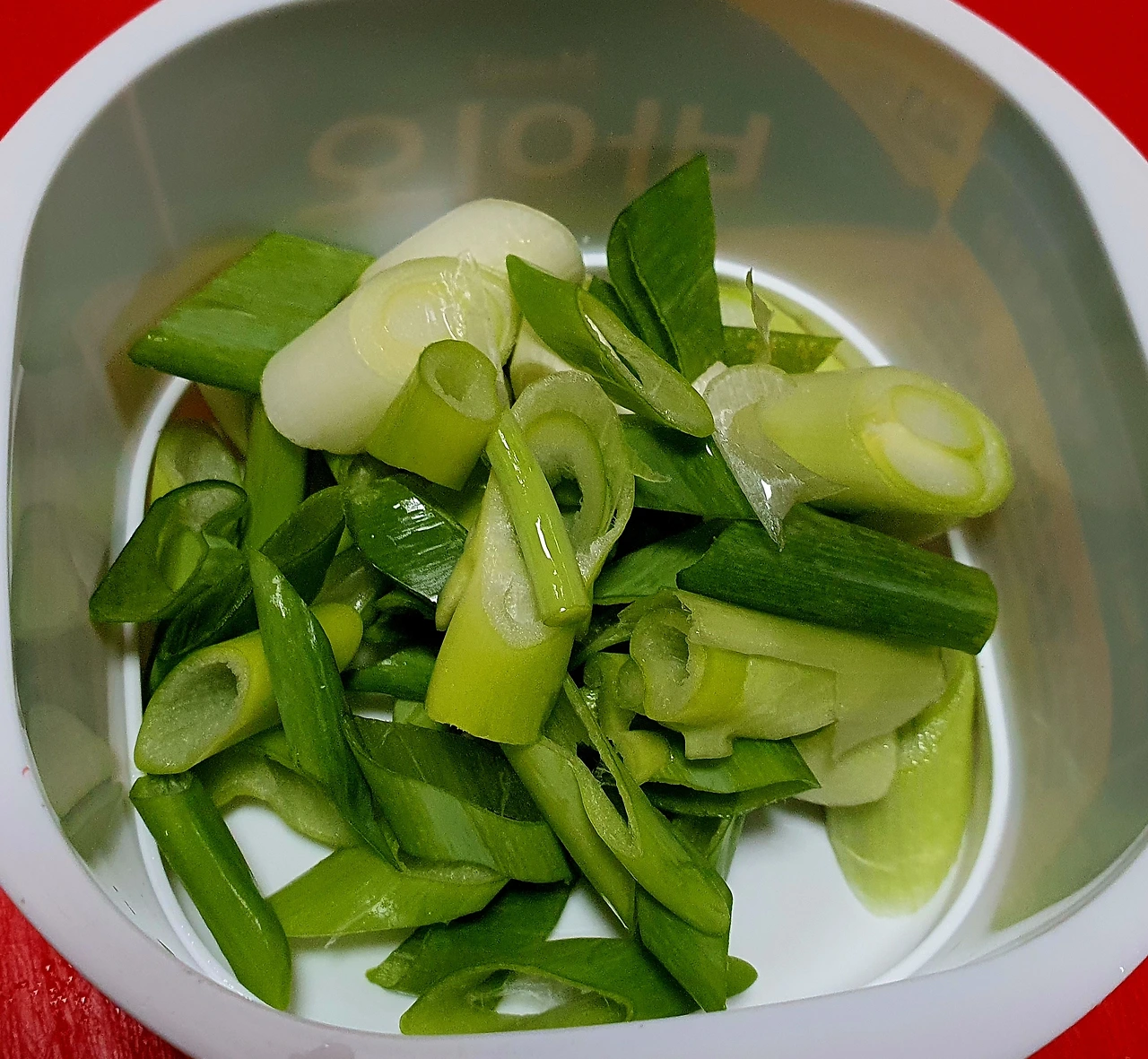 • 호박고지는 물에 30분 정도 담가서 불려준다. 앞다리살은 먹기 좋은 크기로 숨덩숨덩 썰어두고, 양파는 깍둑 썰고, 대파는 쫑쫑 썰어둔다. 부추는 5cm 길이로 썰어준다. 장 봐 놓은 부추가 많아 한 줌. 쫑쫑 썬 부추 조금은 고명용.
