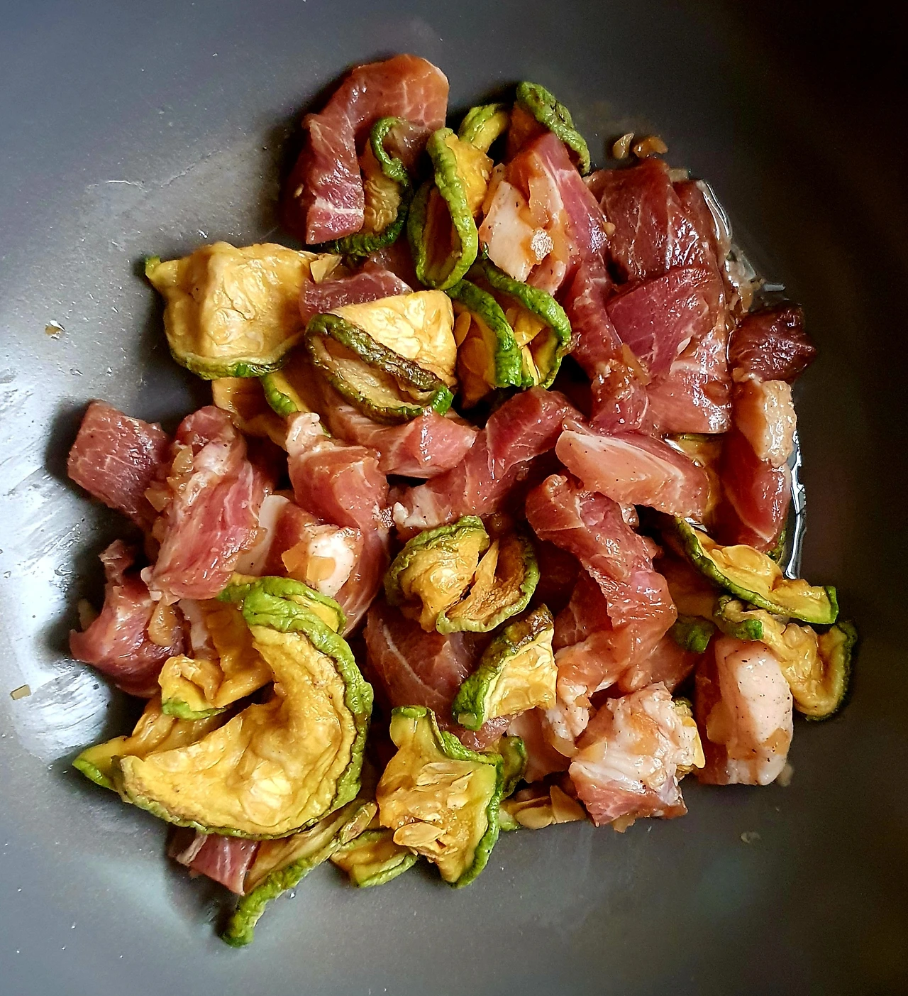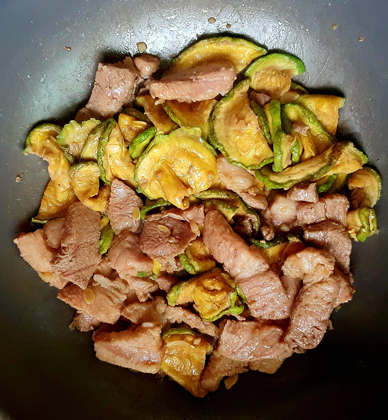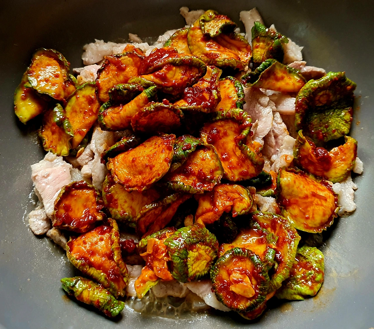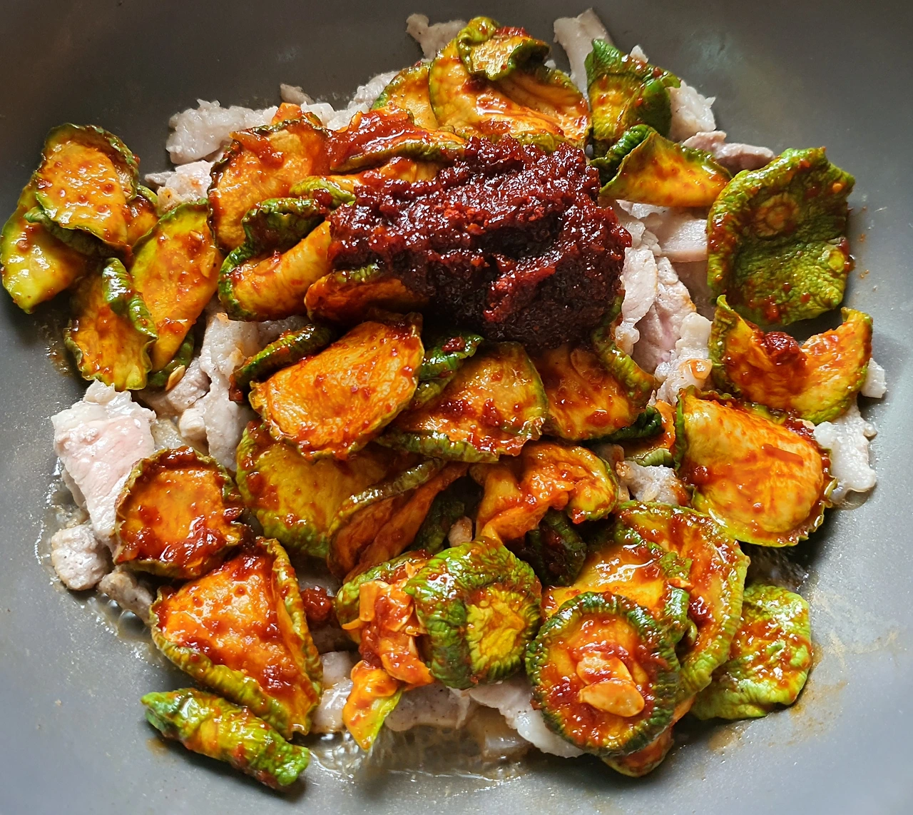 • 밑간을 한 고기를 달군 팬에 넣고 볶다가 고기가 익으면 불린 호박고지와 양념 반을 넣고 같이 볶아준다.