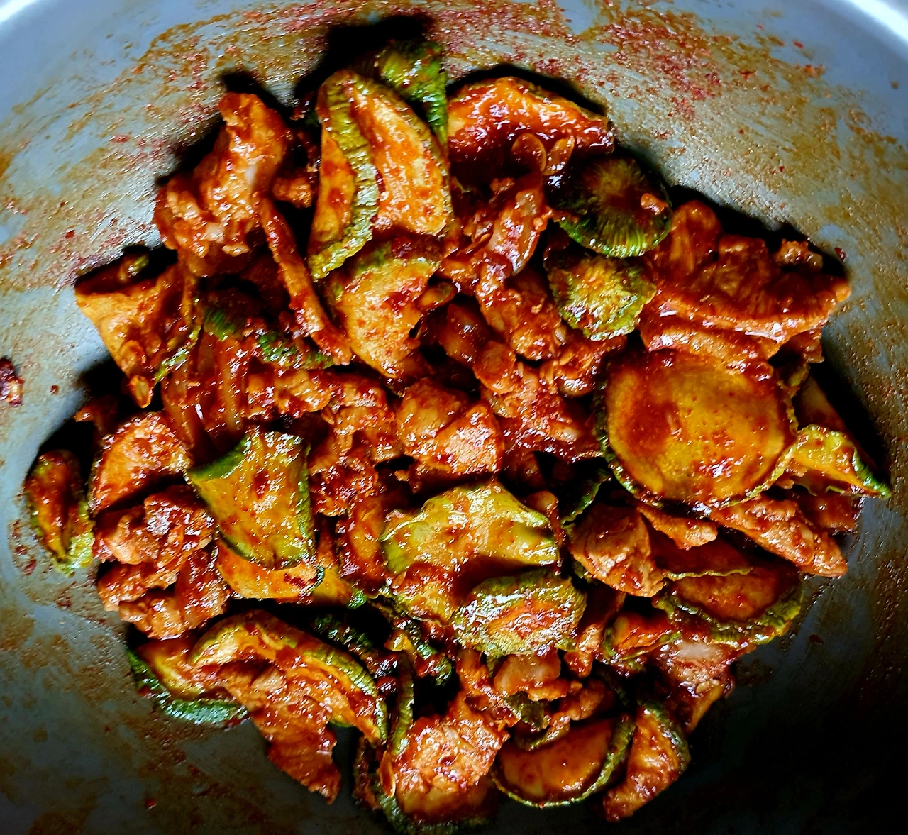 ■ 양념 : 다진 마늘 ½큰술. 다진 청양고추 1큰술, 원당 ½큰술, 고춧가루 3큰술, 고추장 ½큰술, 진간장 2큰술, 국간장 1큰술, 국물진다시 2큰술, 매실청 1큰술, 맛술 1큰술, 후춧가루 조금