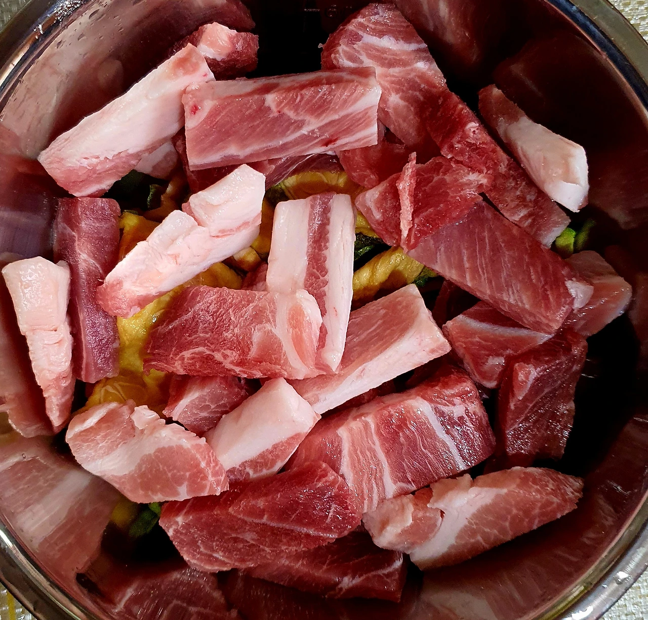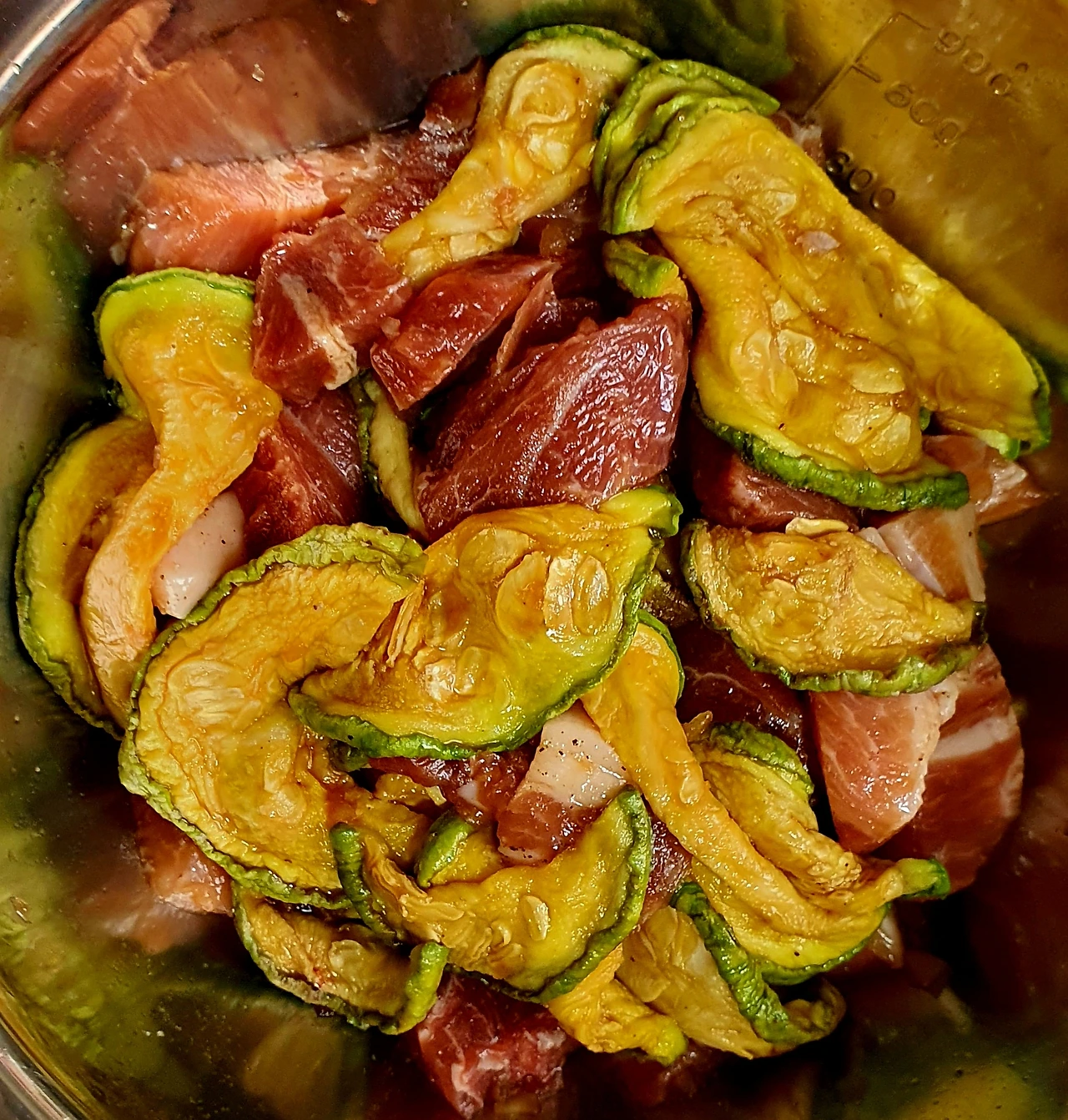 • 돼지고기는 먹기 좋은 크기로 썰어주고, 불린 호박고지는 꼭 짜서 수분을 뺀 다음 고기와 함께 볼에 담고 밑간 재료를 넣고 주물러 30분간 재워둔다.