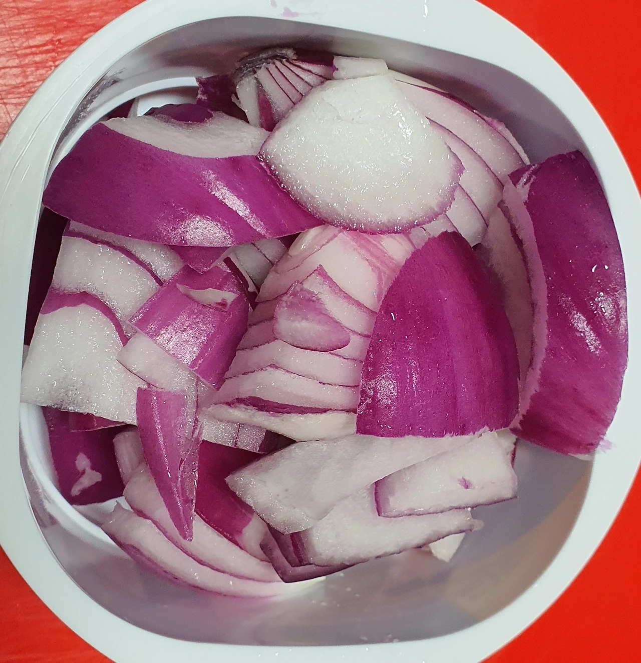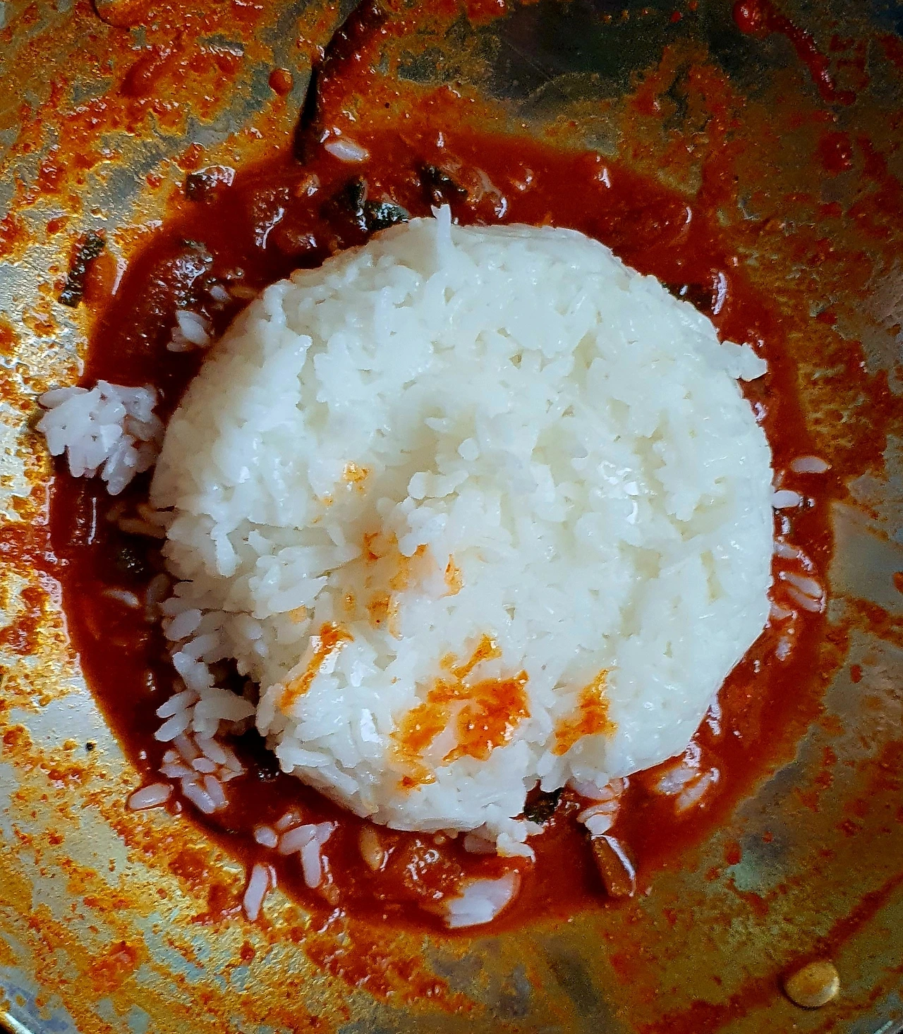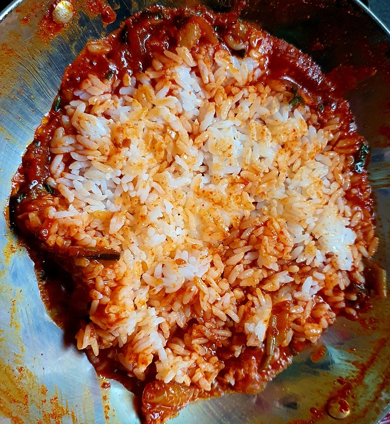• 양파가 다 볶아지면 고춧가루를 1큰술 더 넣고 30초가 더 볶아준다.