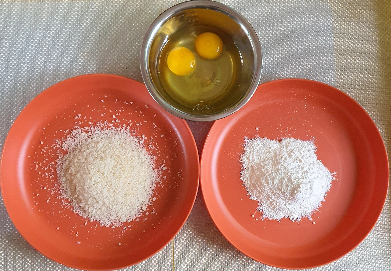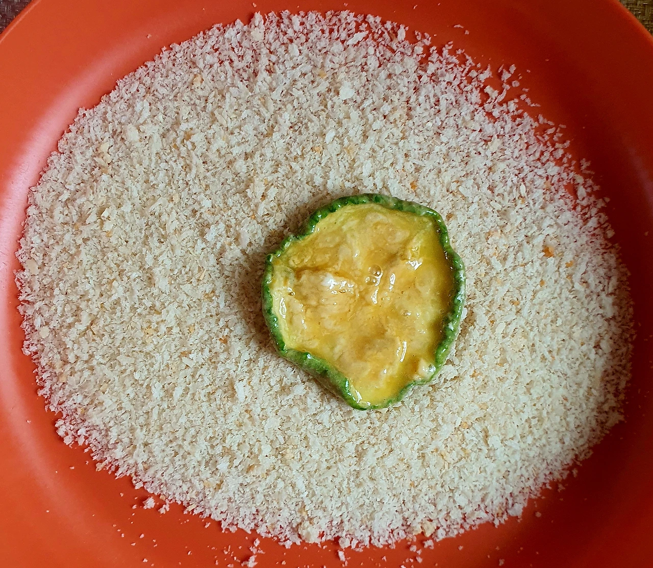 ■ 재료 : 둥글게 썬 호박고지 1컵, 부침가루 조금, 달걀 2개, 소금 조금. 청. 홍고추(고명). 빵가루 조금