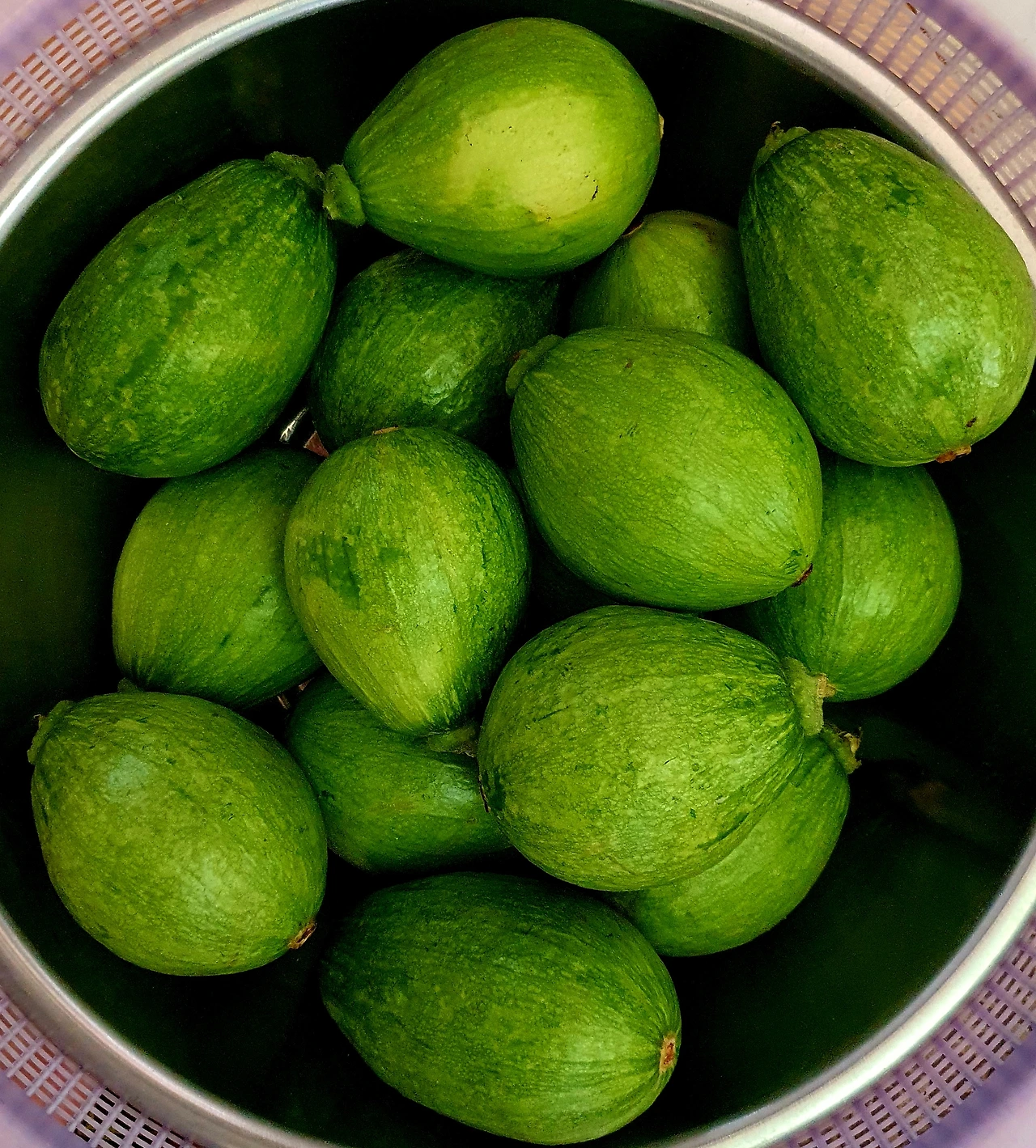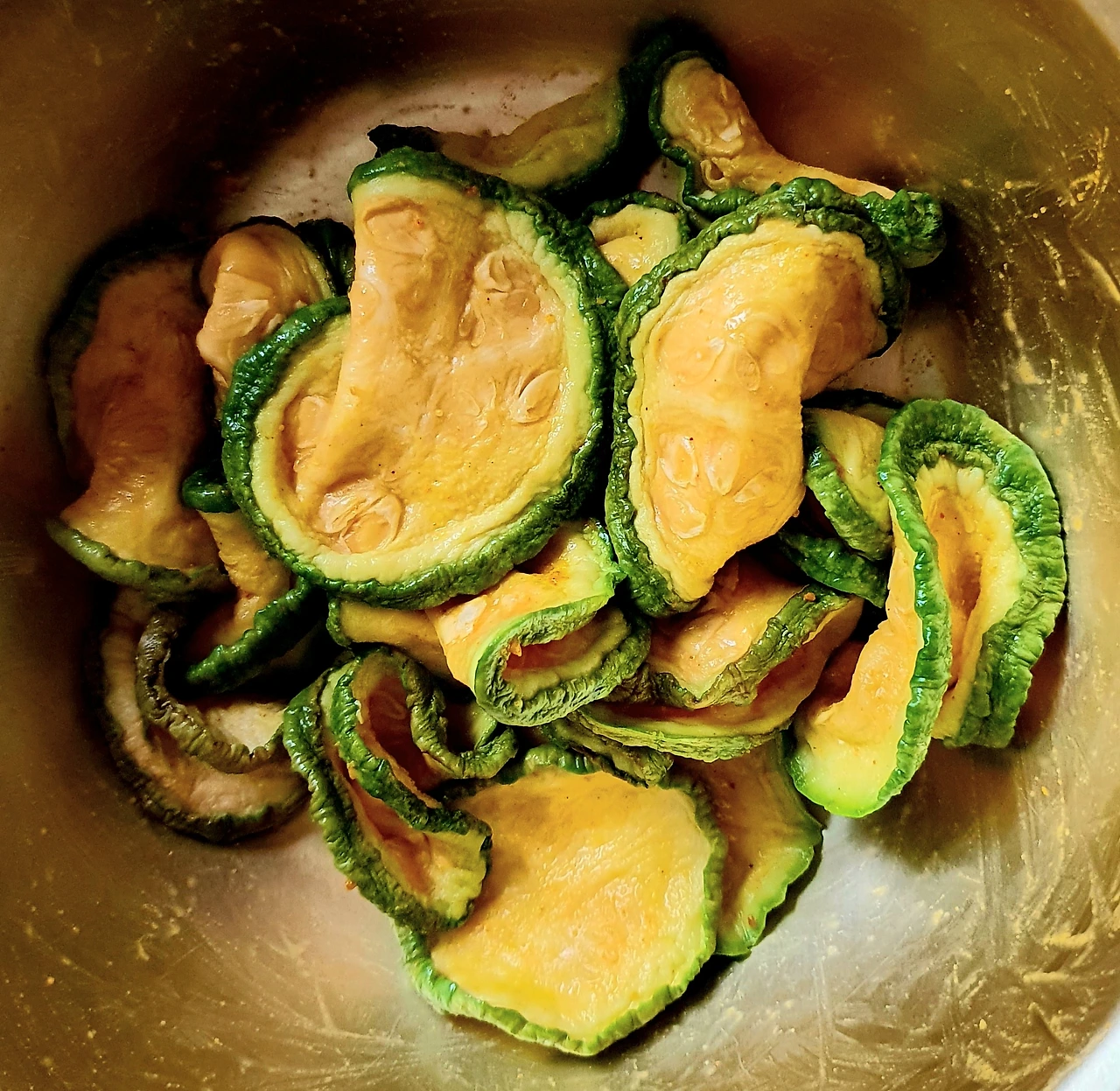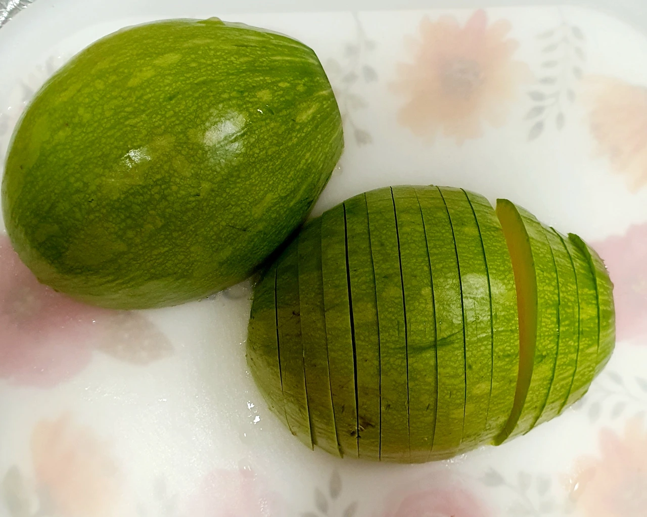 • 하우스재배를 많이 하는 길쭉한 일반 애호박보단 맛이 좋은 노지 둥근 호박으로 구입해서 말리는 것이 호박고지를 만들어서도 맛이 좋아 재래시장에서 둥근 호박을 구입 후 겉을 씻어 먹기 좋게 썰어 준비한다.