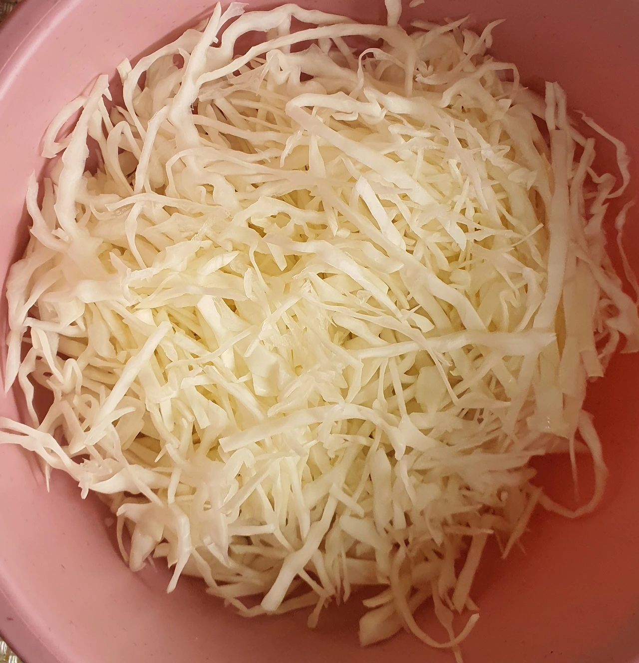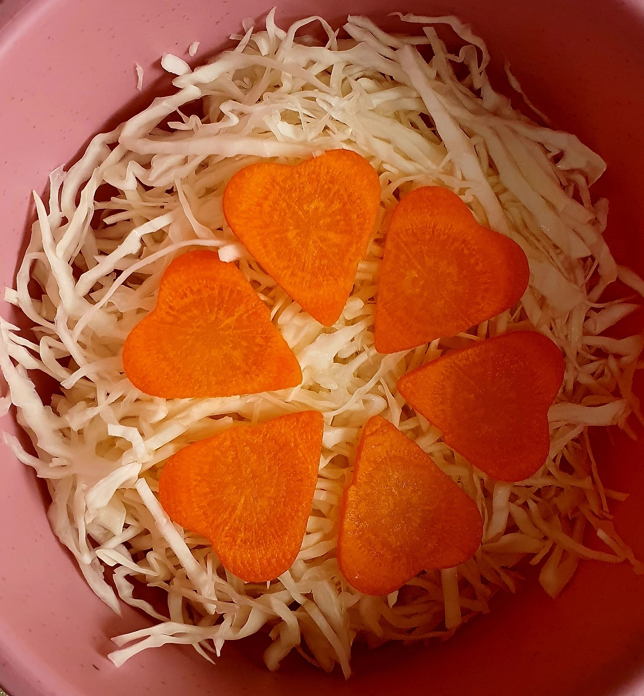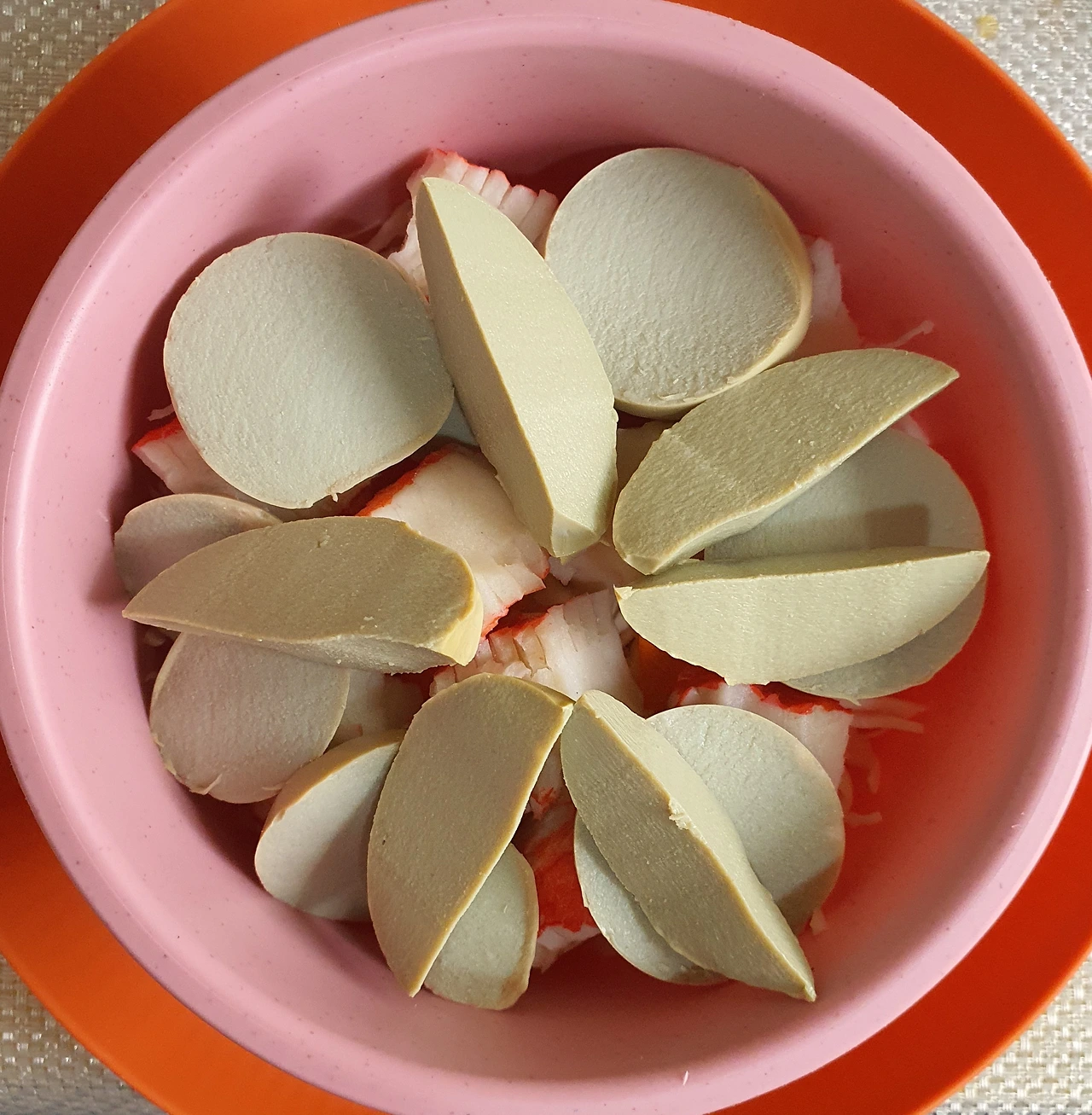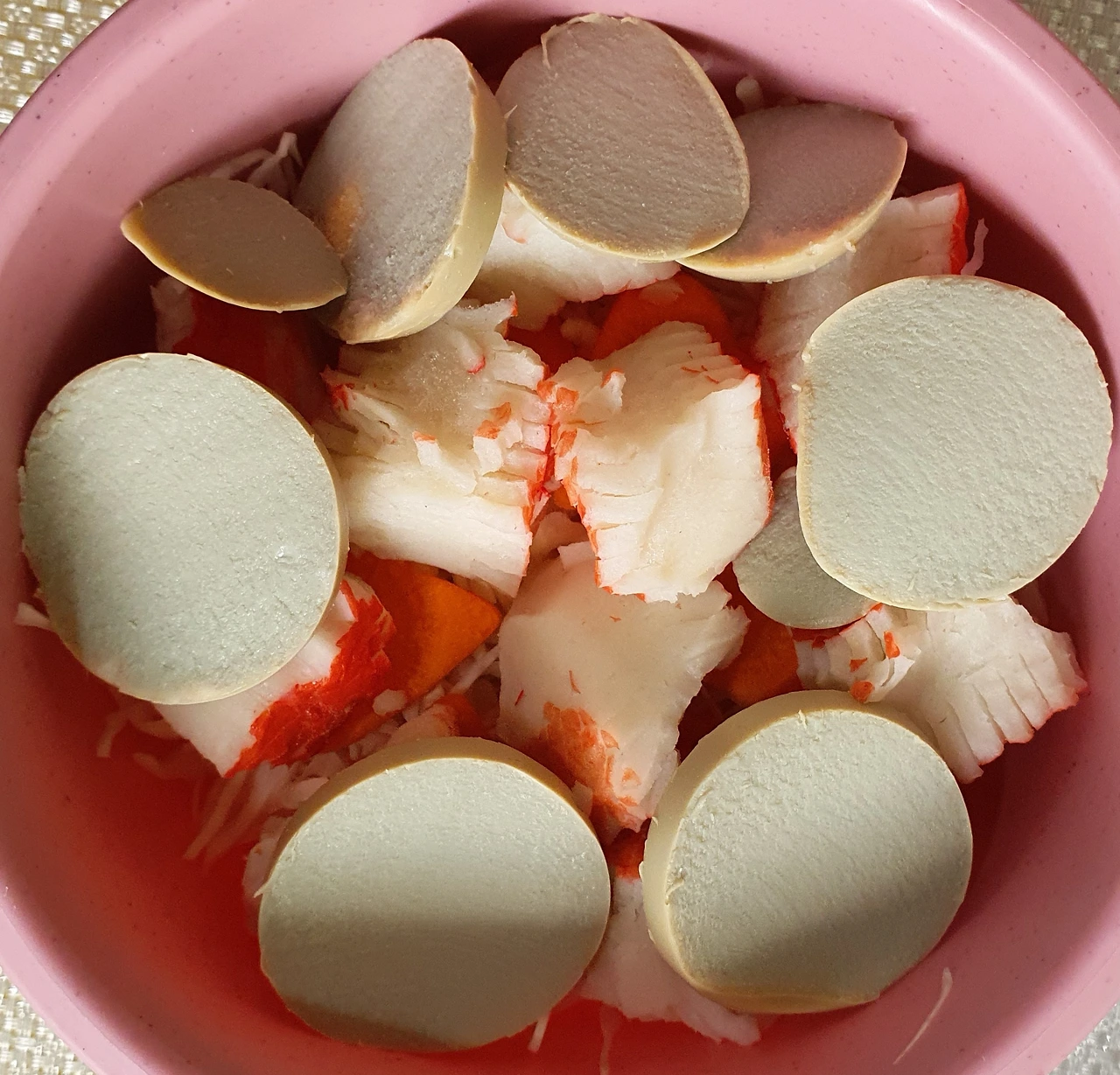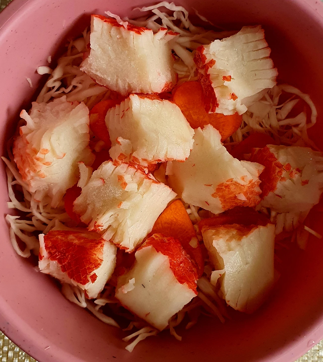 • 양배추를 채 썰어 깔고, 위에 당근도 썰어 올리고, 꽃맛살도 올리고, 군달걀도 썰어 올려준다.