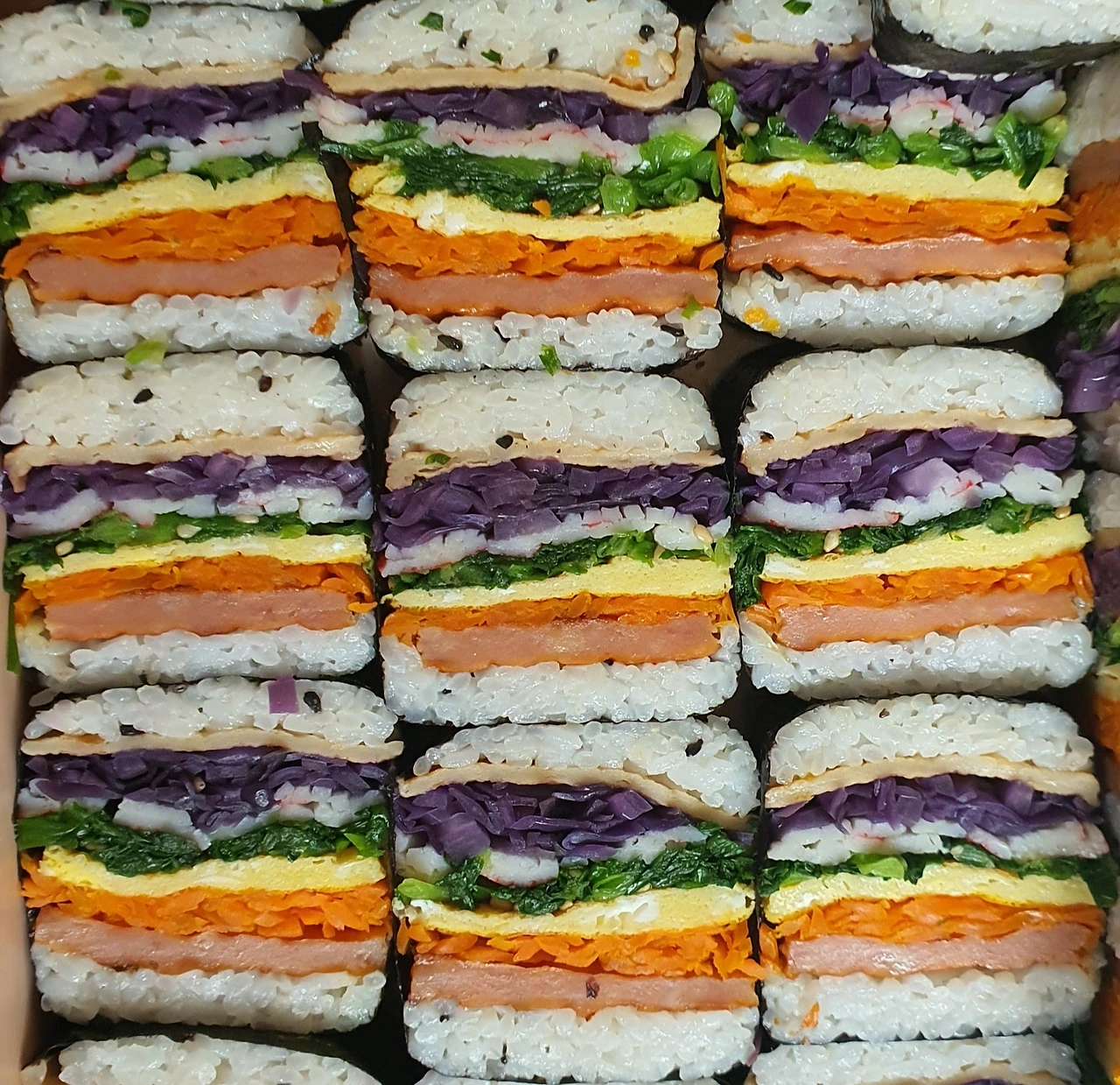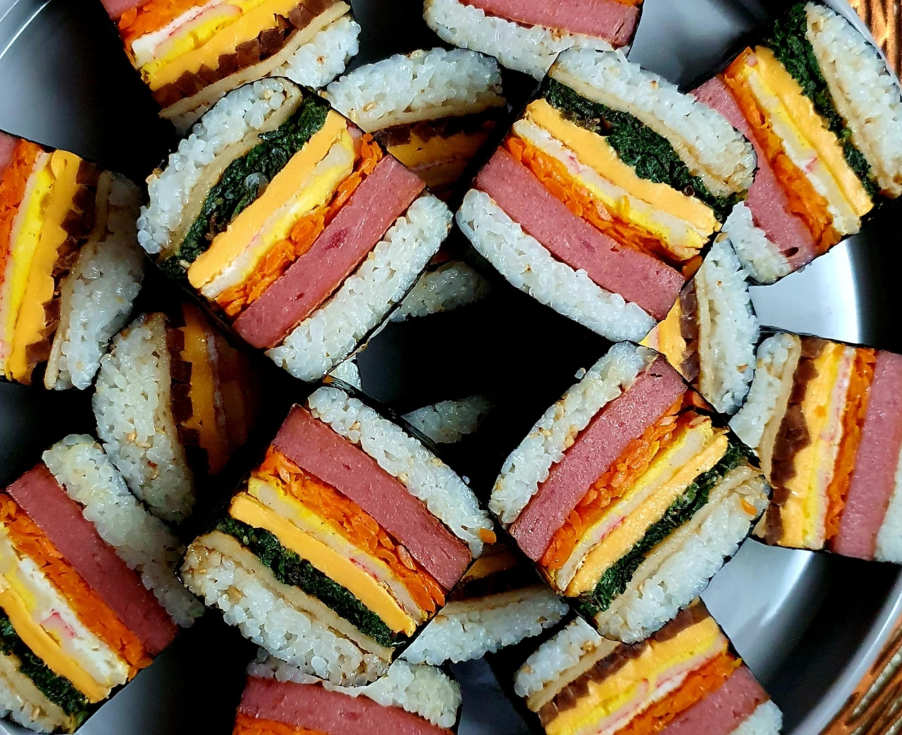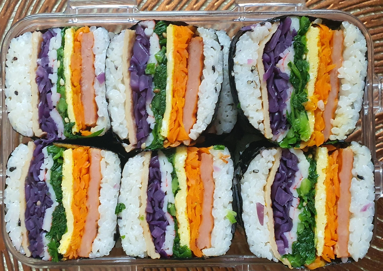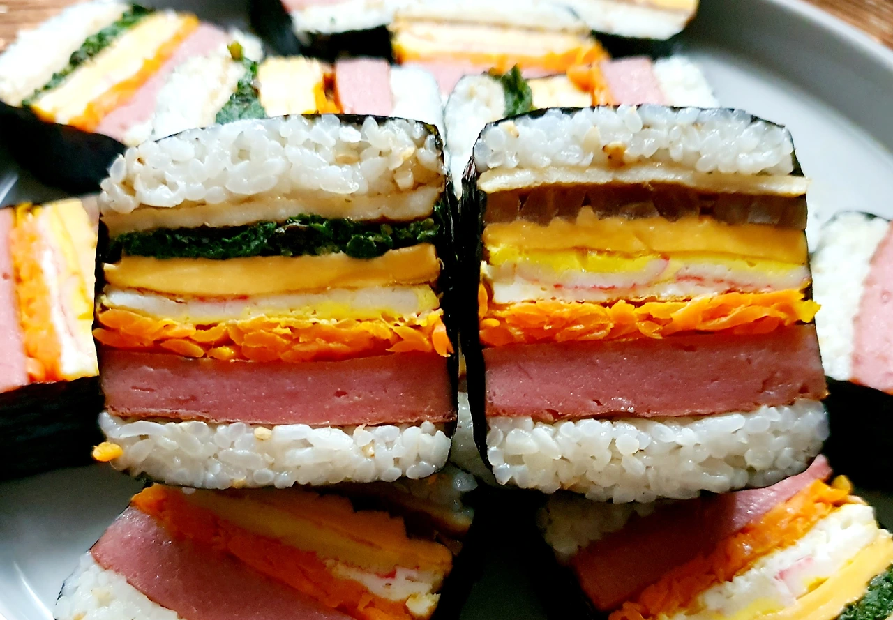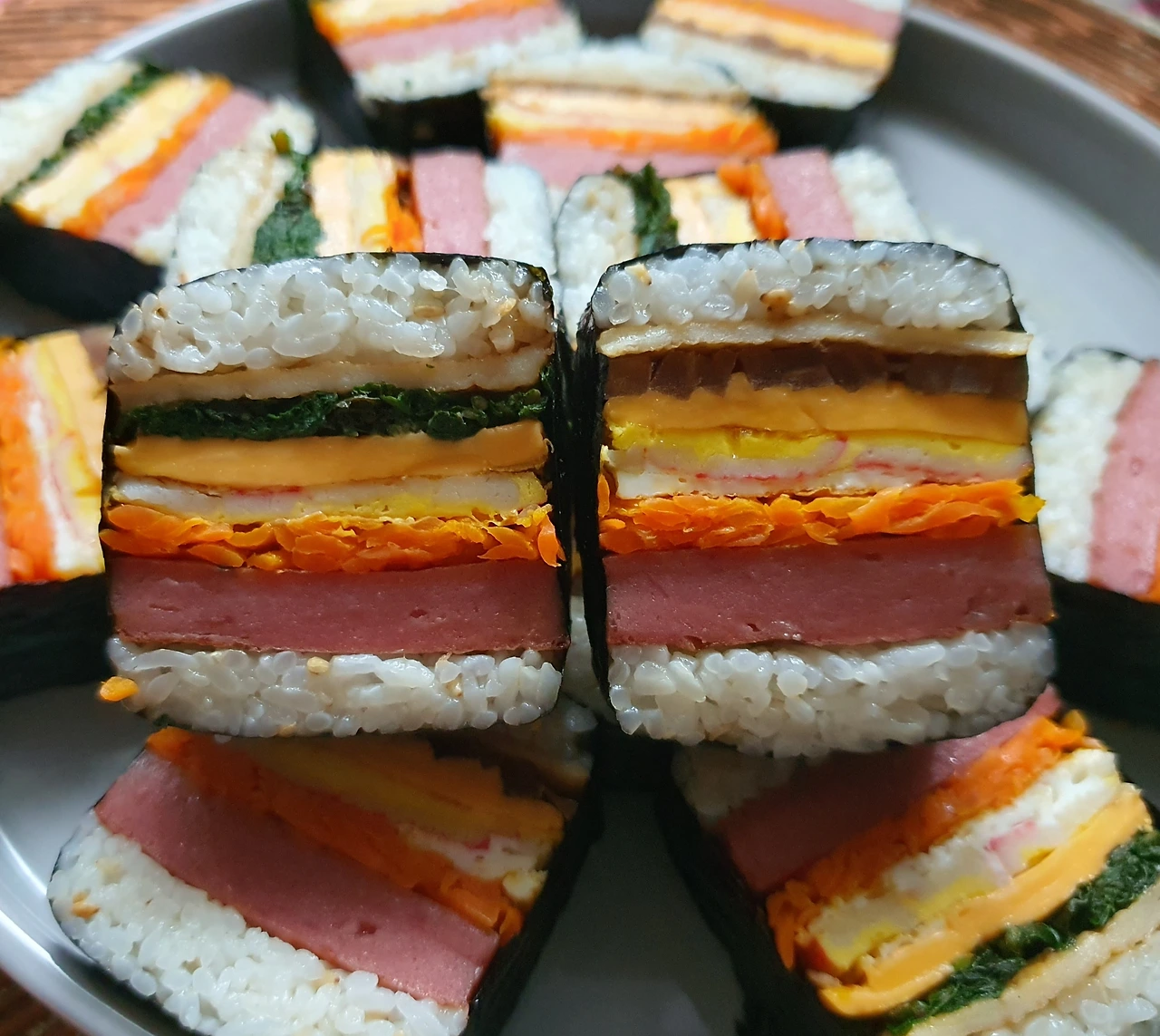 • 김을 반으로 잘라 바닥에 깔고 김 ⅓지점에 무스비틀을 올리고 단촛물에 버무린 밥-햄-당근-달걀-치즈-부추-맛살-어묵-적채-밥 순으로 넣고 무스비틀을 벗겨 내고 김으로 말아 준다.