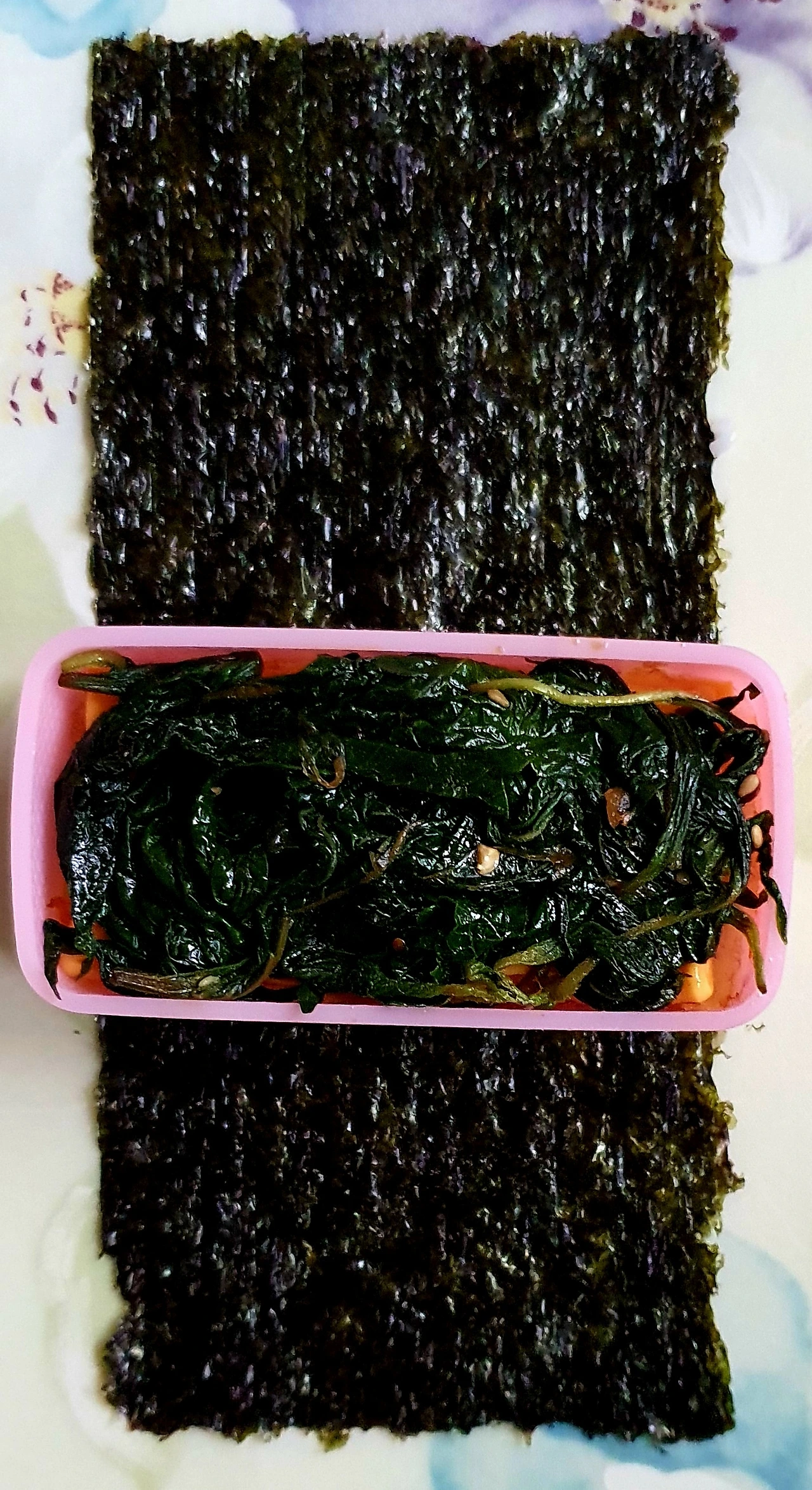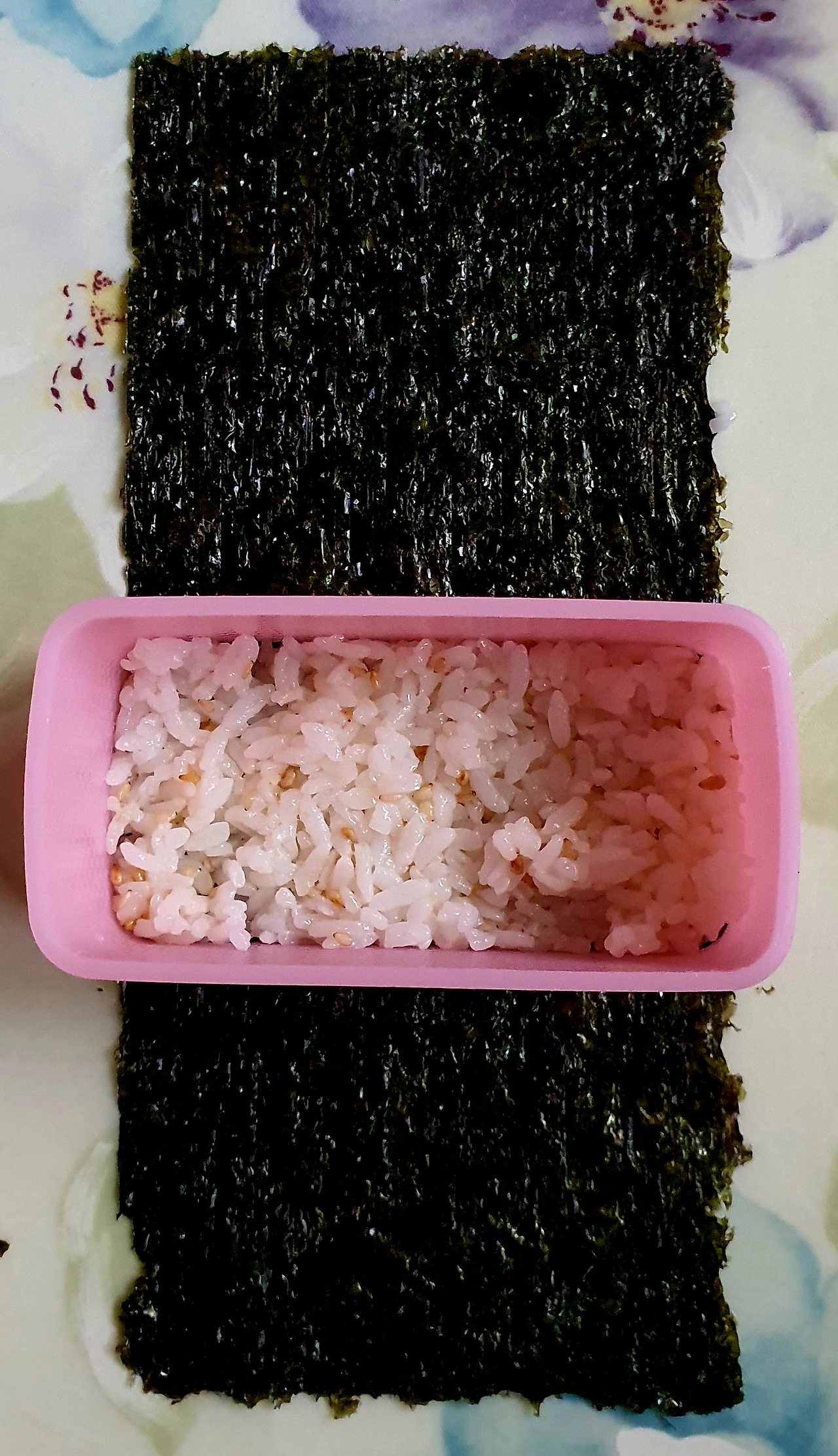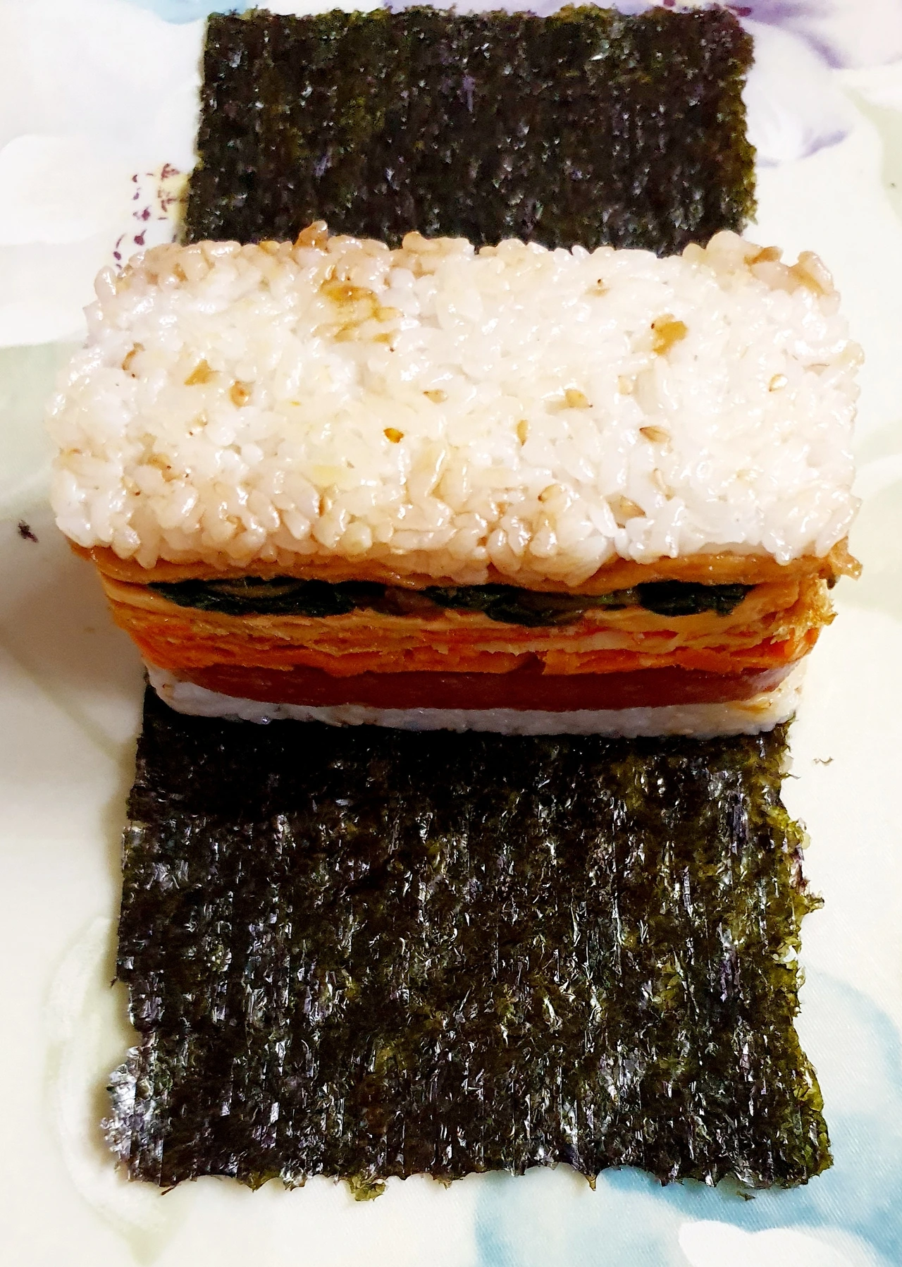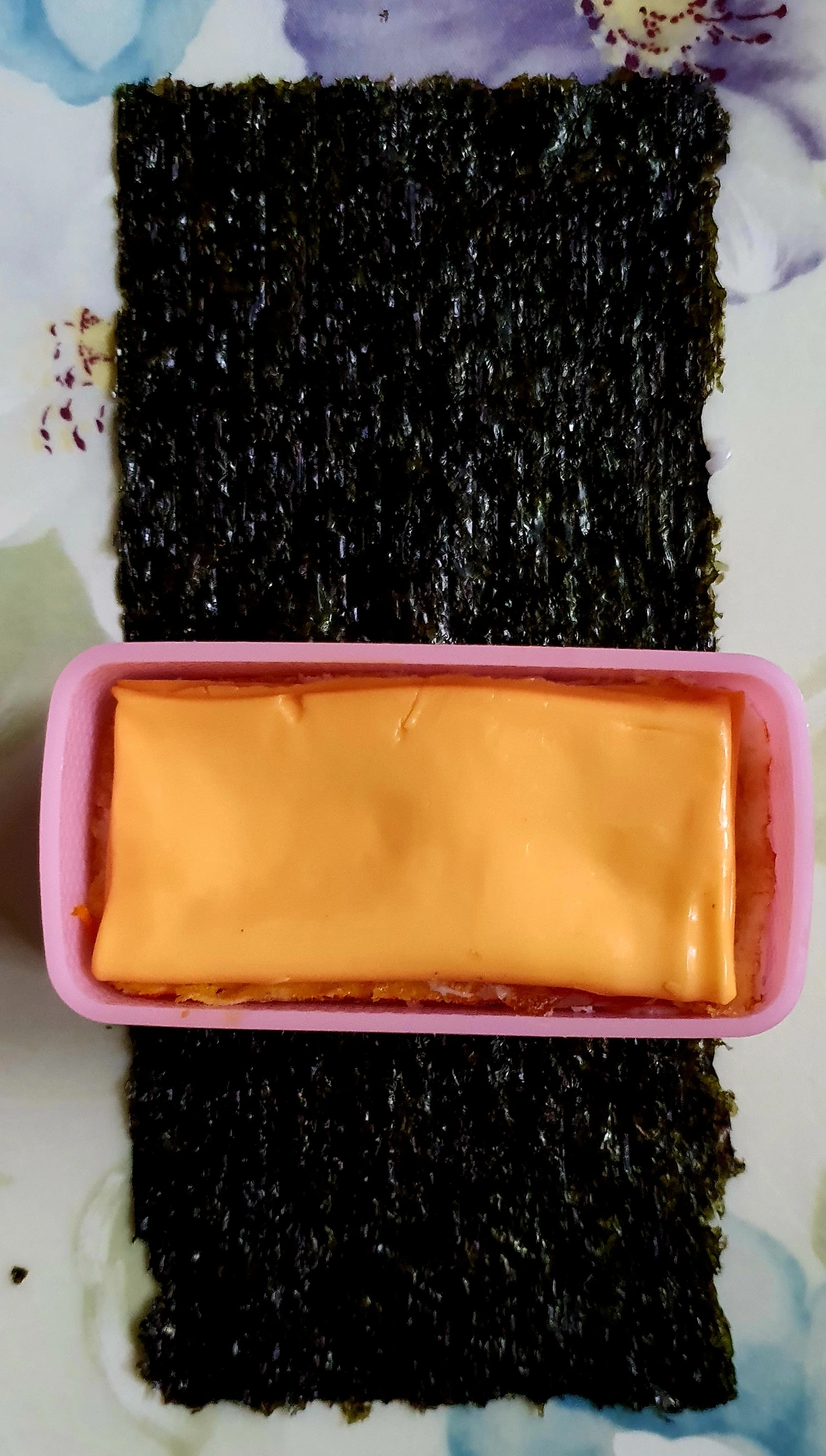 • 김을 반으로 잘라 바닥에 깔고 김 ⅓지점에 무스비틀을 올리고 단촛물에 버무린 밥-햄-당근-달걀-치즈-부추-맛살-어묵-적채-밥 순으로 넣고 무스비틀을 벗겨 내고 김으로 말아 준다.