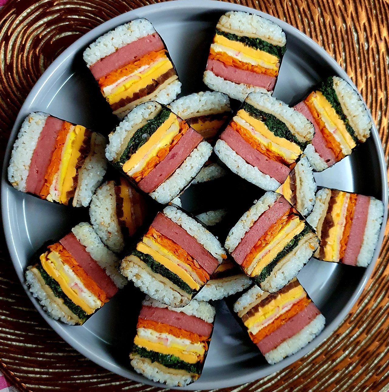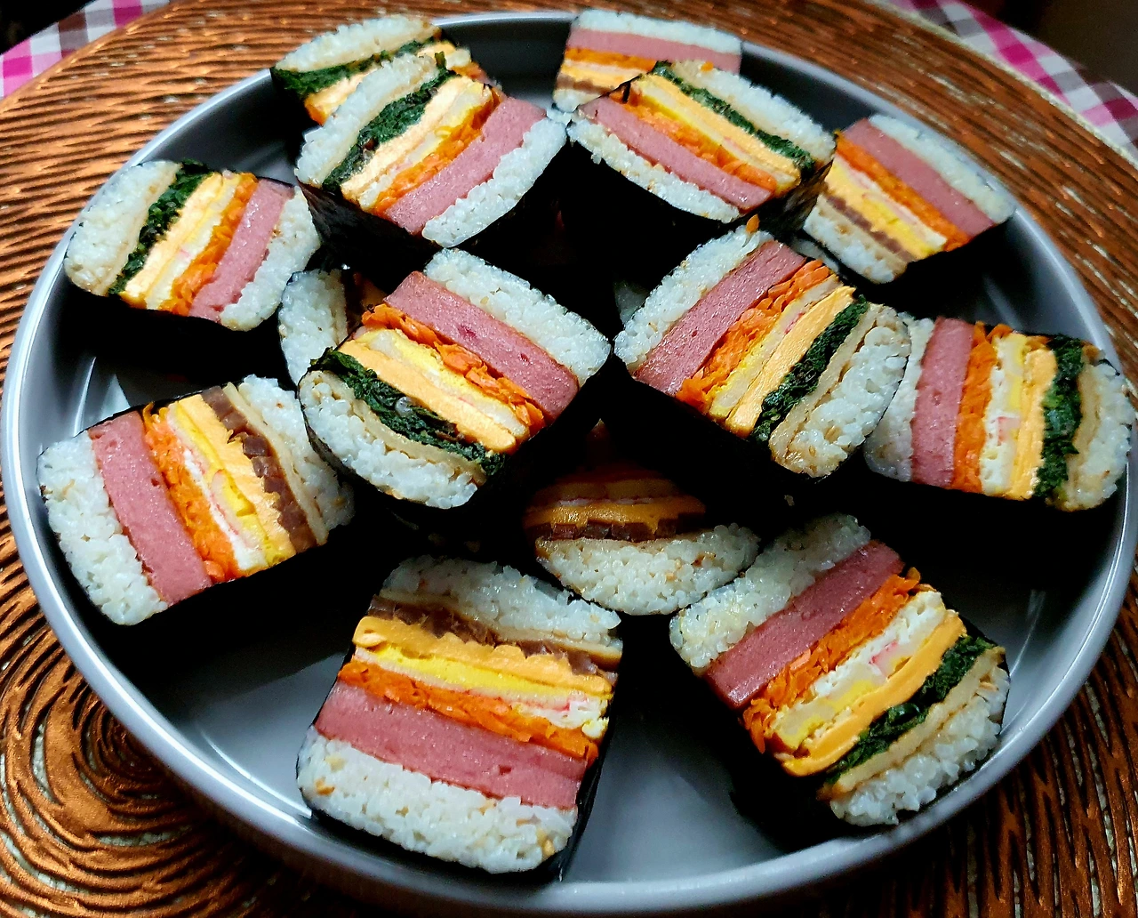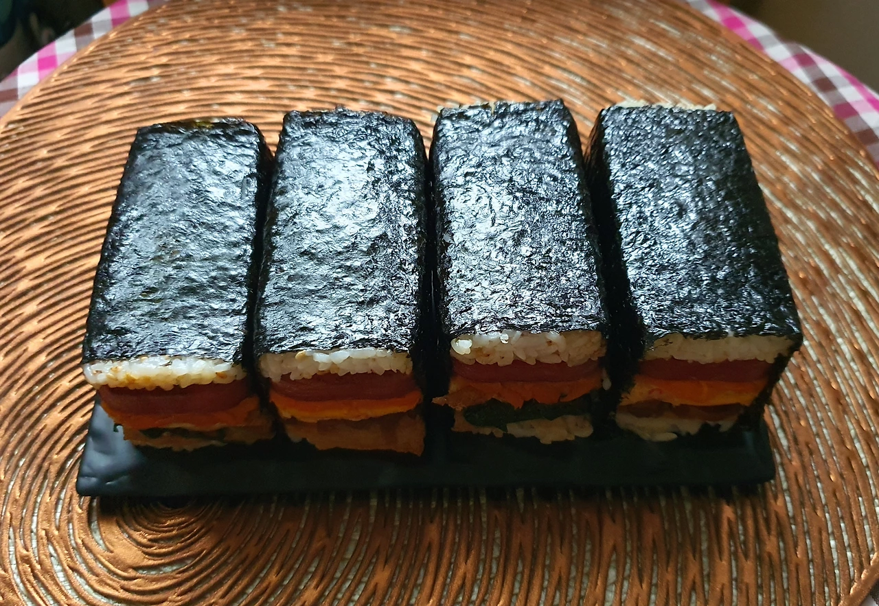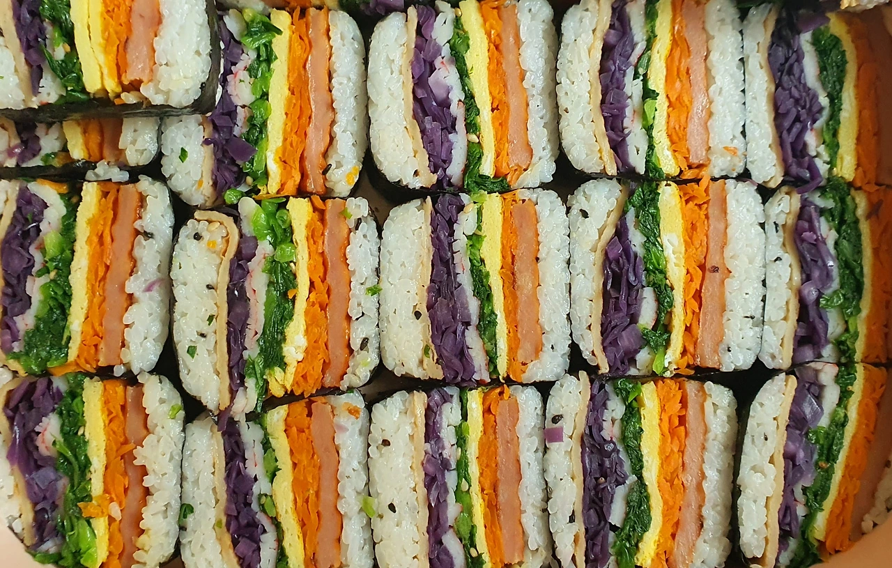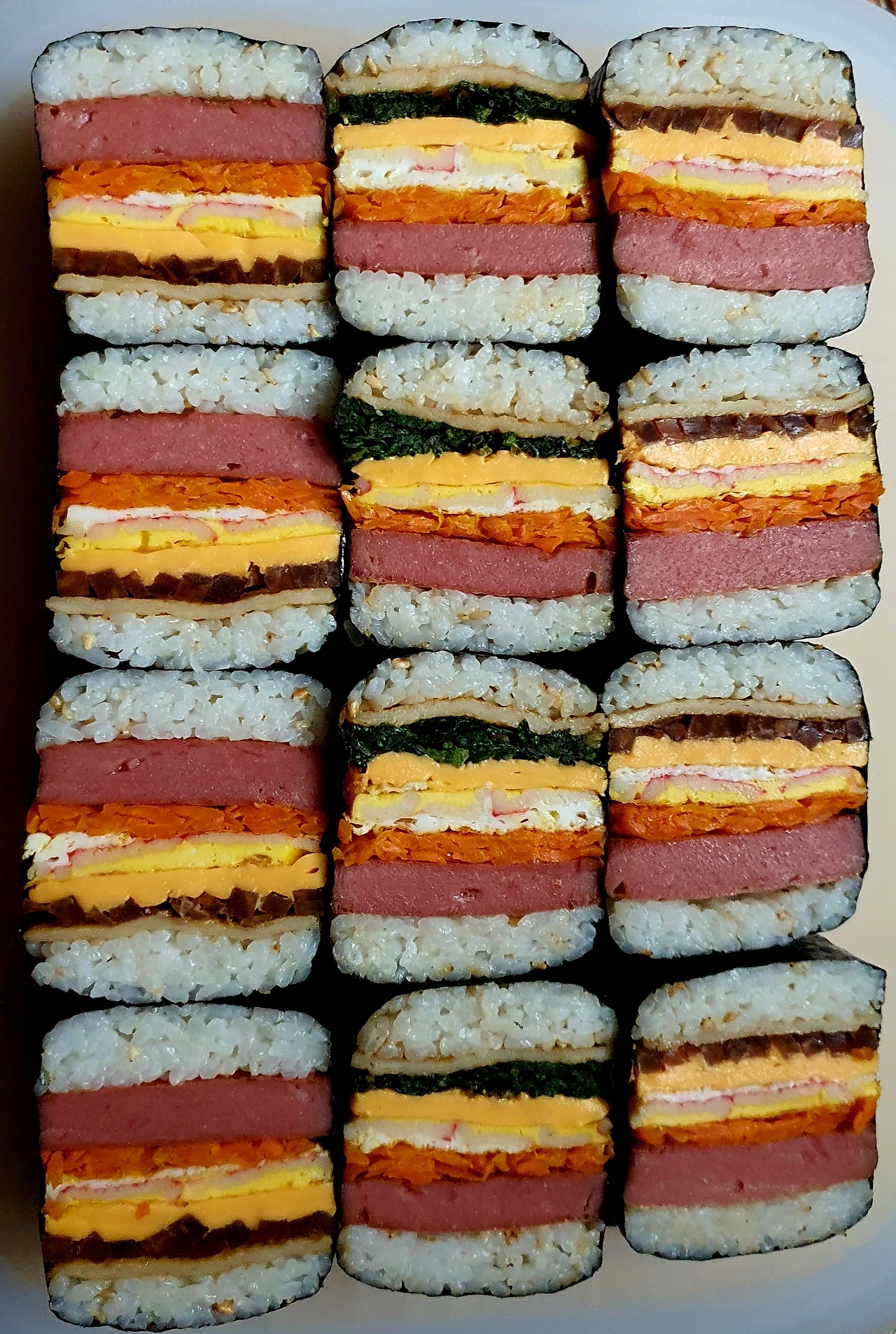 • 김을 반으로 잘라 바닥에 깔고 김 ⅓지점에 무스비틀을 올리고 단촛물에 버무린 밥-햄-당근-달걀-치즈-부추-맛살-어묵-적채-밥 순으로 넣고 무스비틀을 벗겨 내고 김으로 말아 준다.