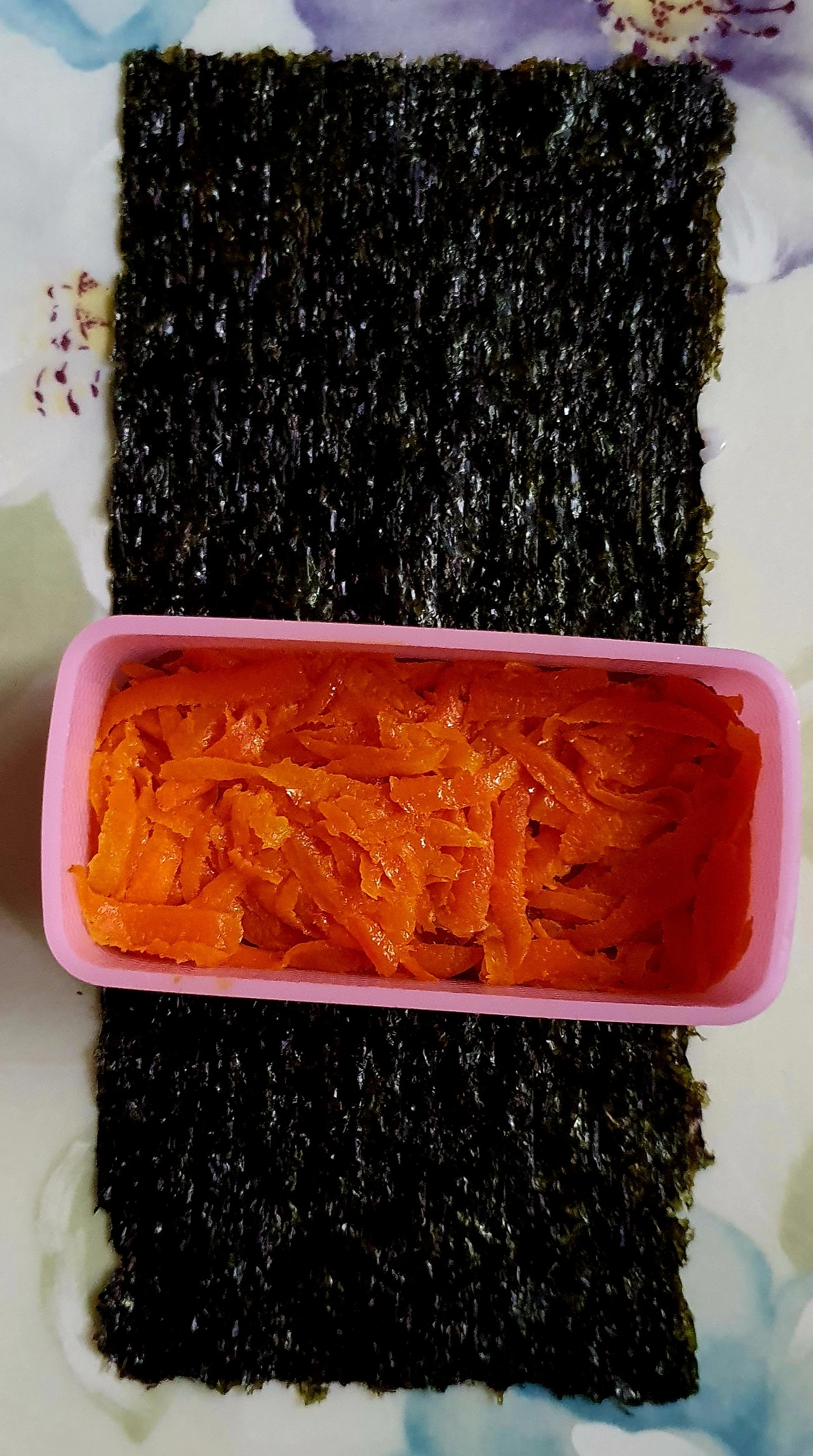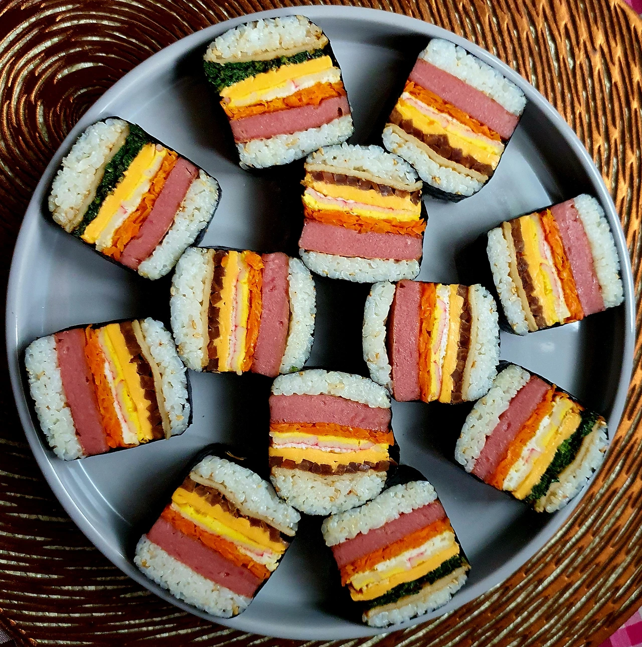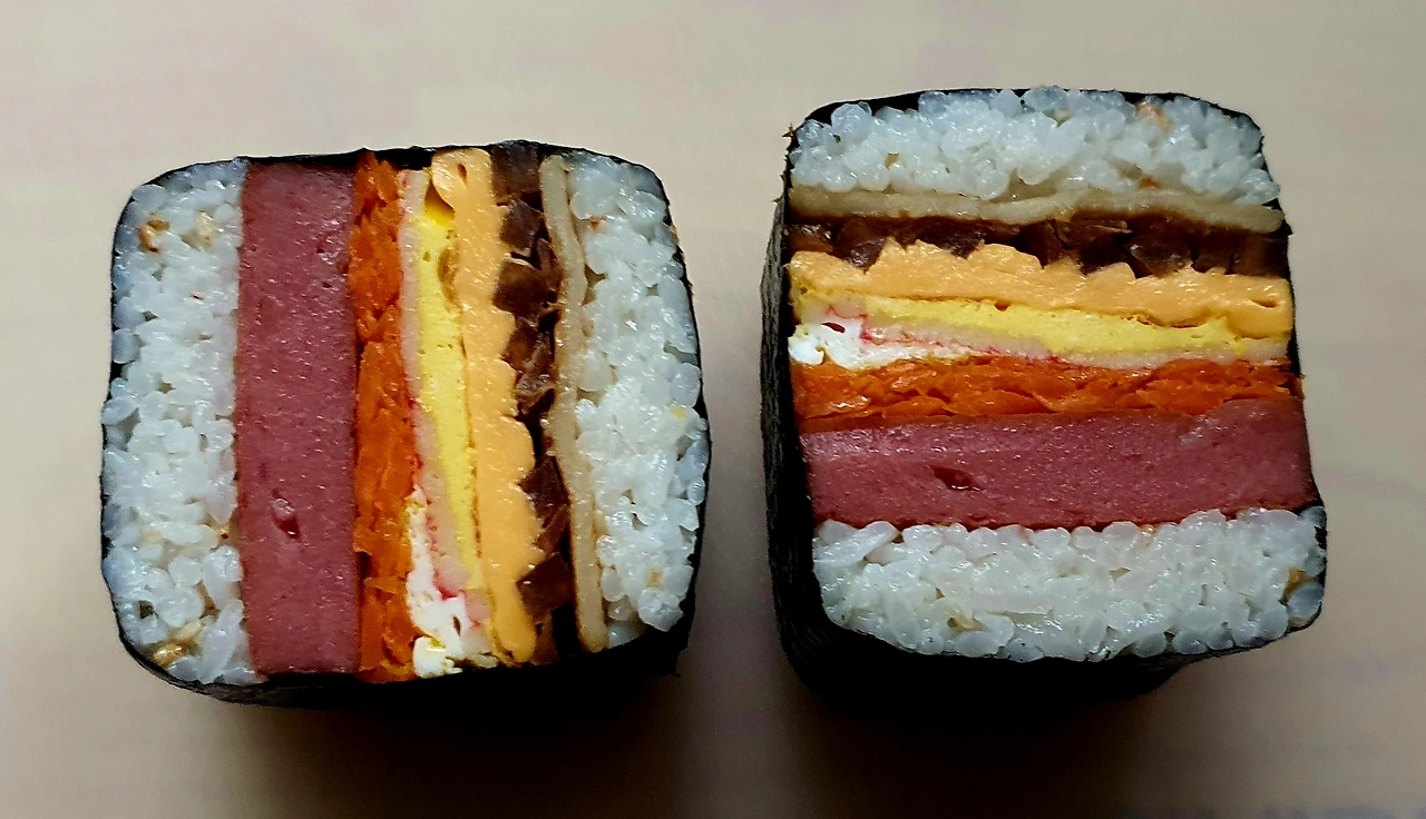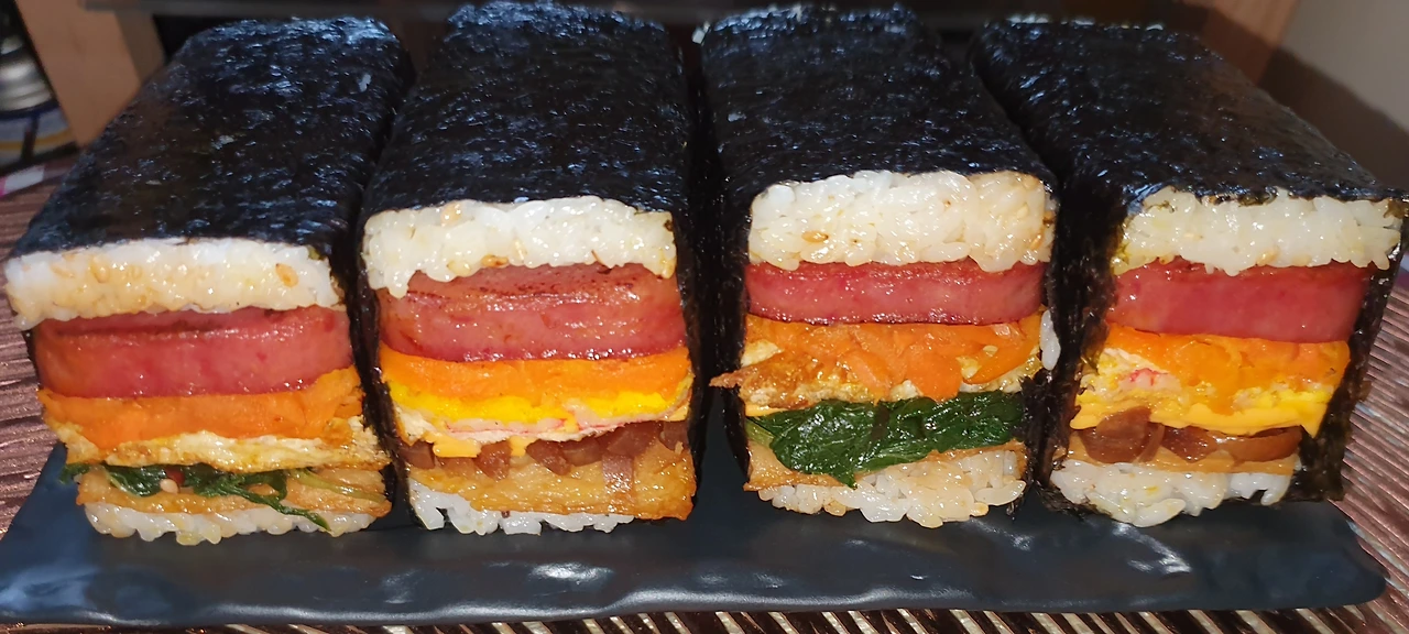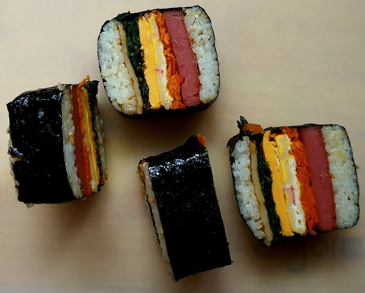 • 김을 반으로 잘라 바닥에 깔고 김 ⅓지점에 무스비틀을 올리고 단촛물에 버무린 밥-햄-당근-달걀-치즈-부추-맛살-어묵-적채-밥 순으로 넣고 무스비틀을 벗겨 내고 김으로 말아 준다.