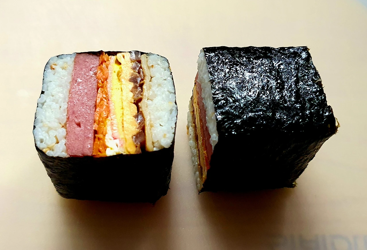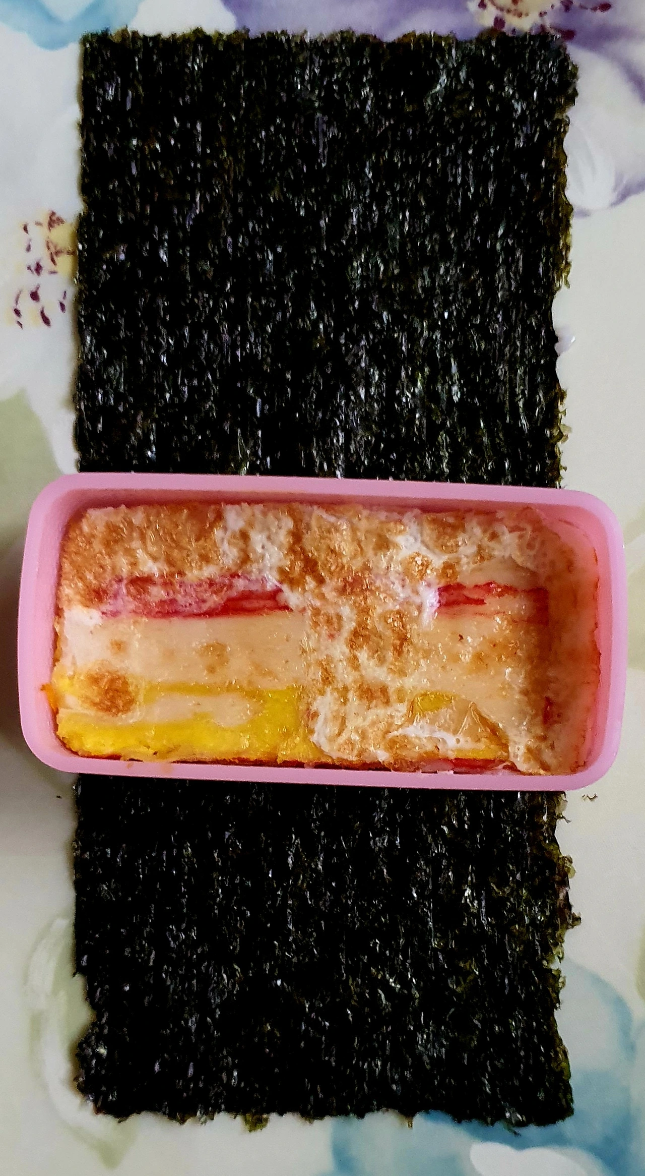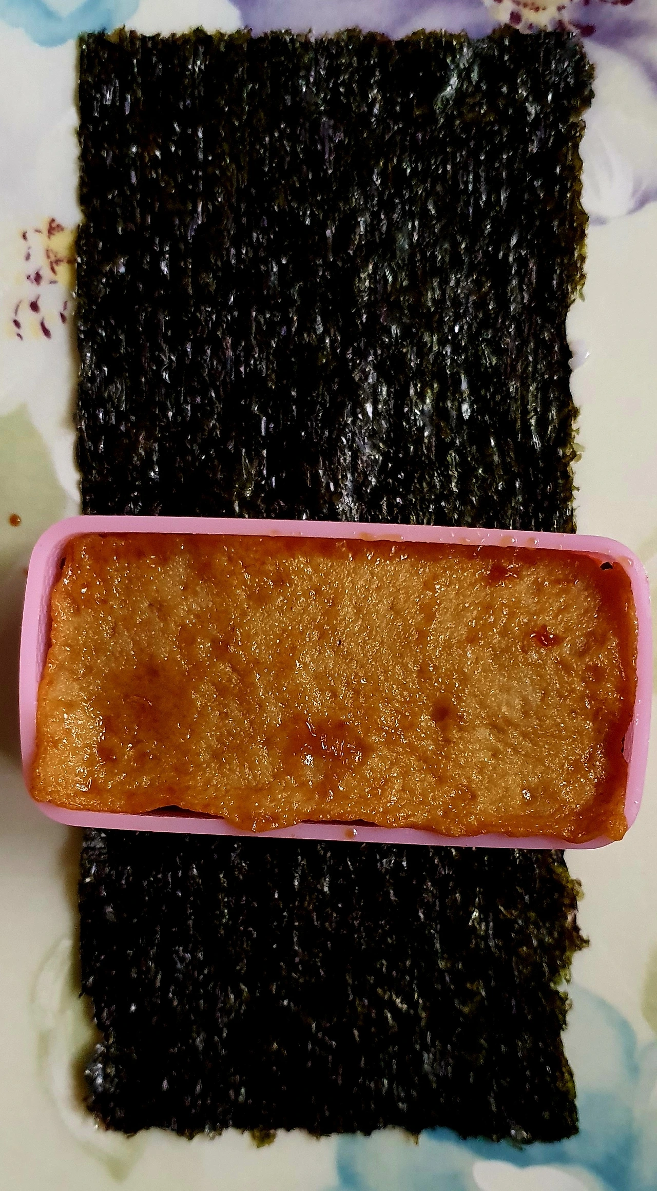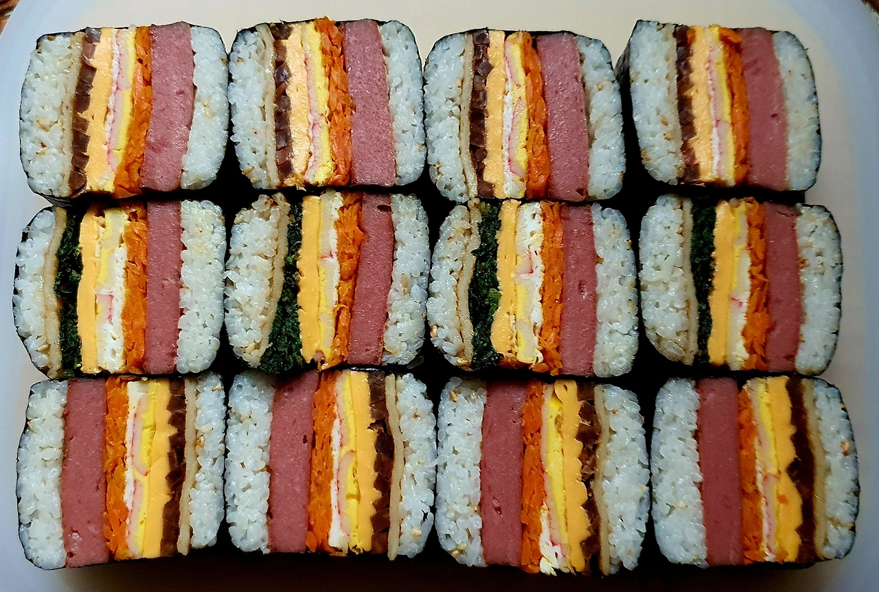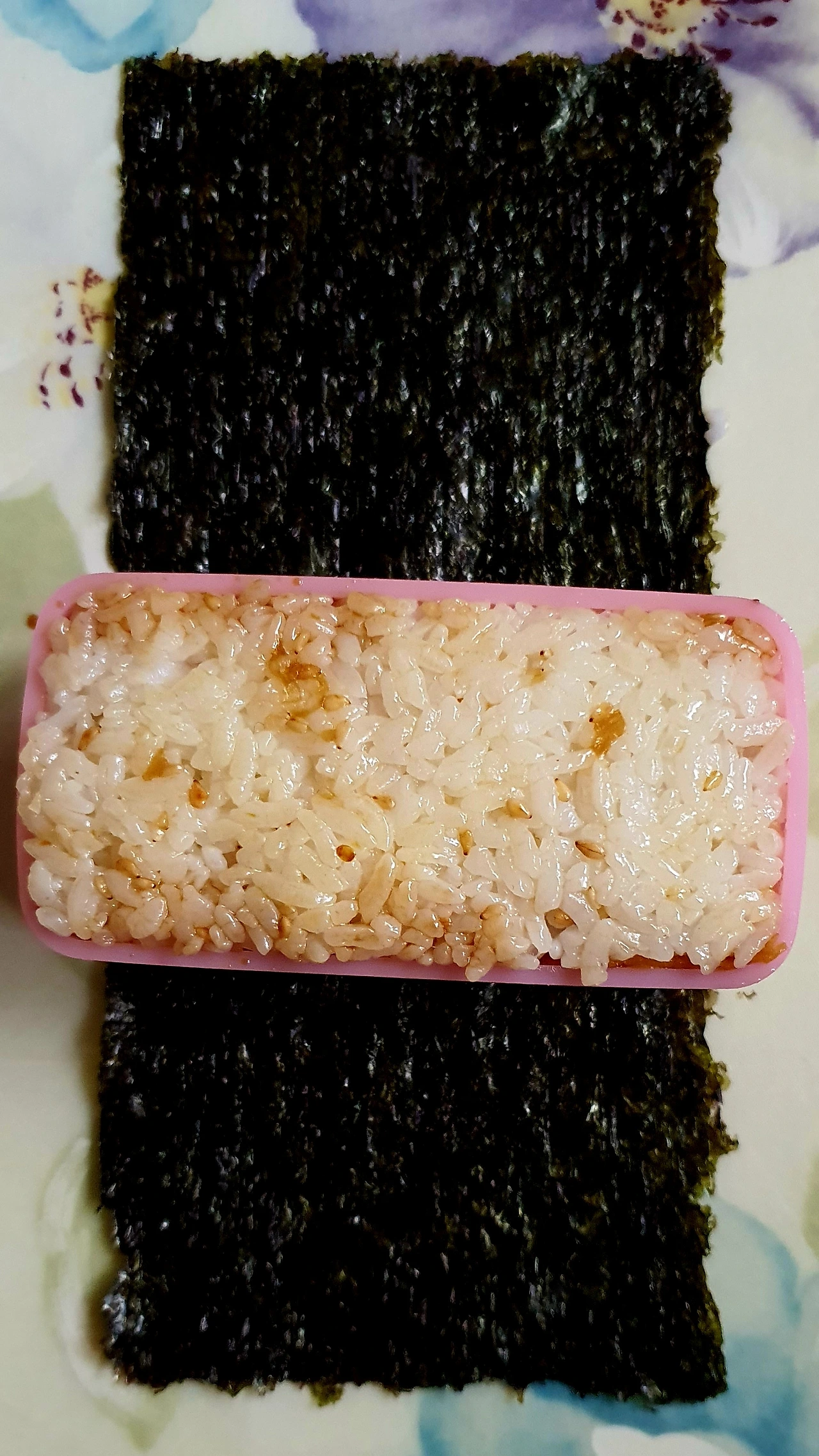 • 김을 반으로 잘라 바닥에 깔고 김 ⅓지점에 무스비틀을 올리고 단촛물에 버무린 밥-햄-당근-달걀-치즈-부추-맛살-어묵-적채-밥 순으로 넣고 무스비틀을 벗겨 내고 김으로 말아 준다.