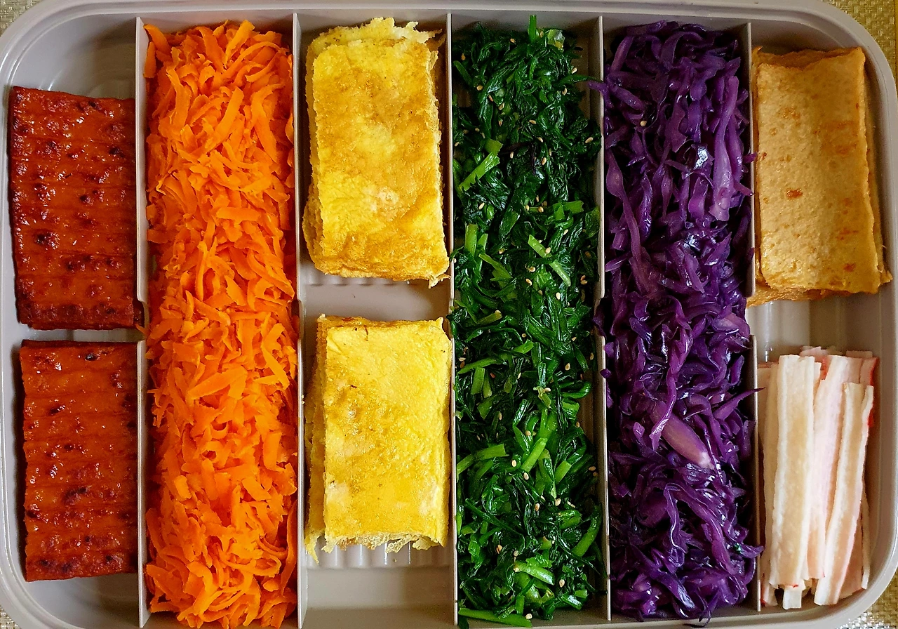 ■ 재료 : 김밥김 2장. 김밥용 햄 1개. 맛살 2개. 사각어묵 2장. 치즈 2장. 달걀 2개. 당근 ½개. 적채 조금. 부추무침 조금. 밥 1공기