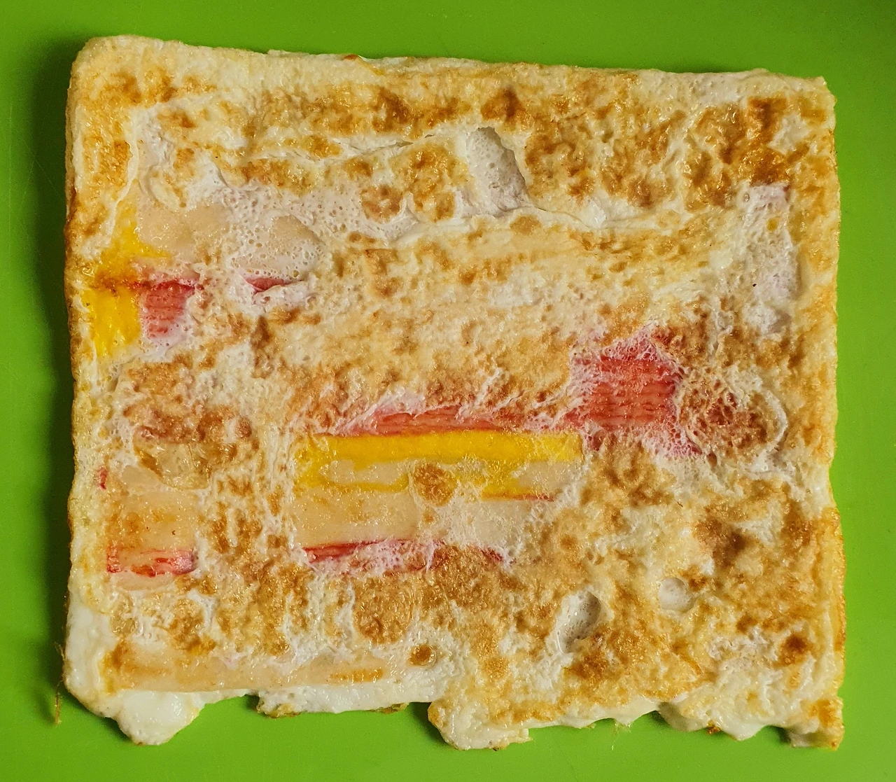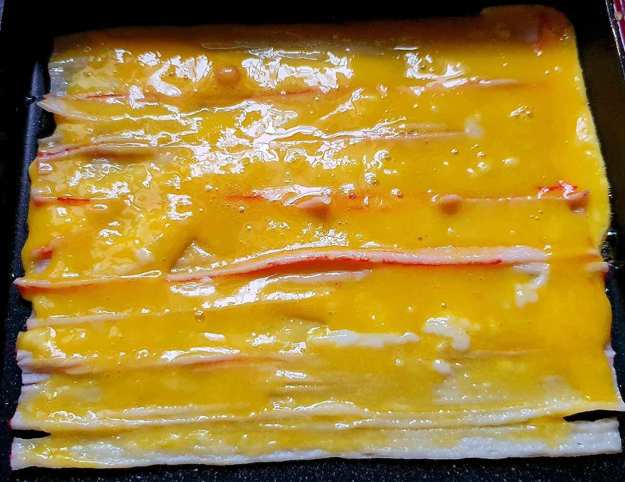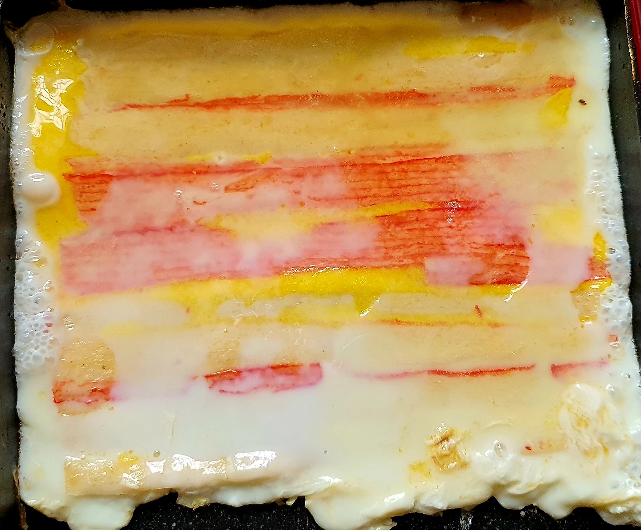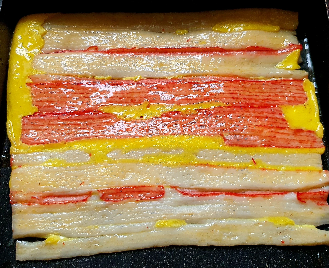• 달걀은 흰자와 노른자를 분리해서 소금 조금 넣고 풀어주고, 맛살은 끓는 물에 데쳐서 넓게 펼쳐 앞면은 노른자를 뒷면은 흰자위를 입혀 전을 부쳐 썰어준다.