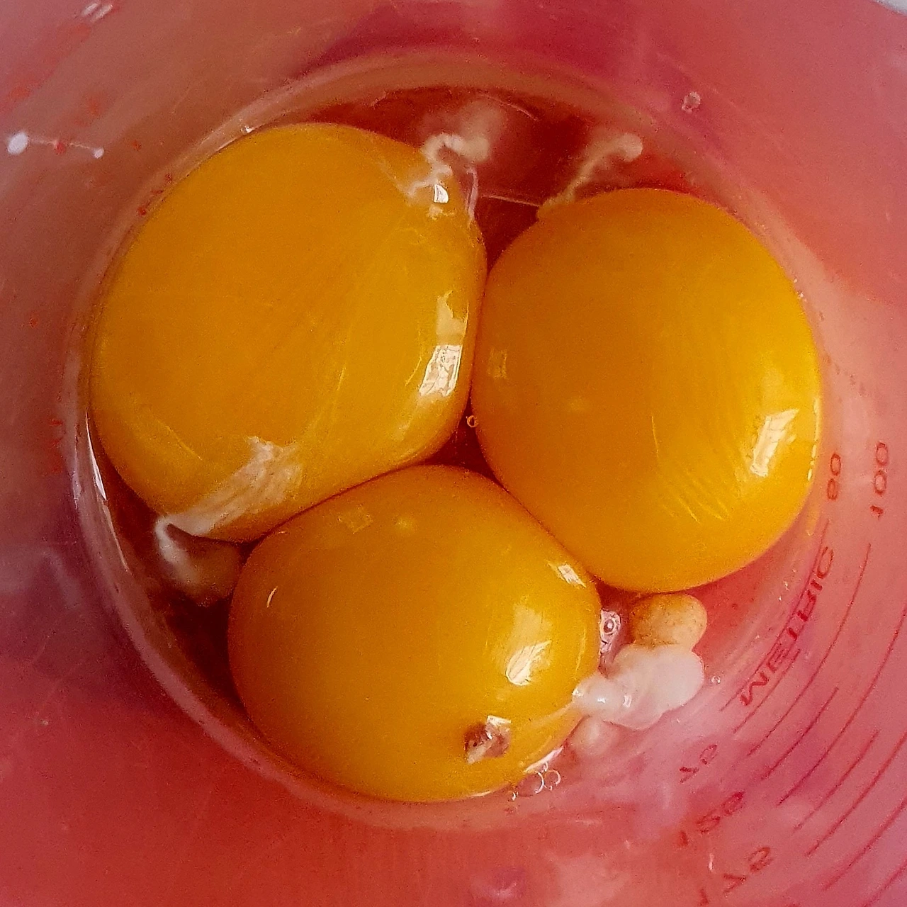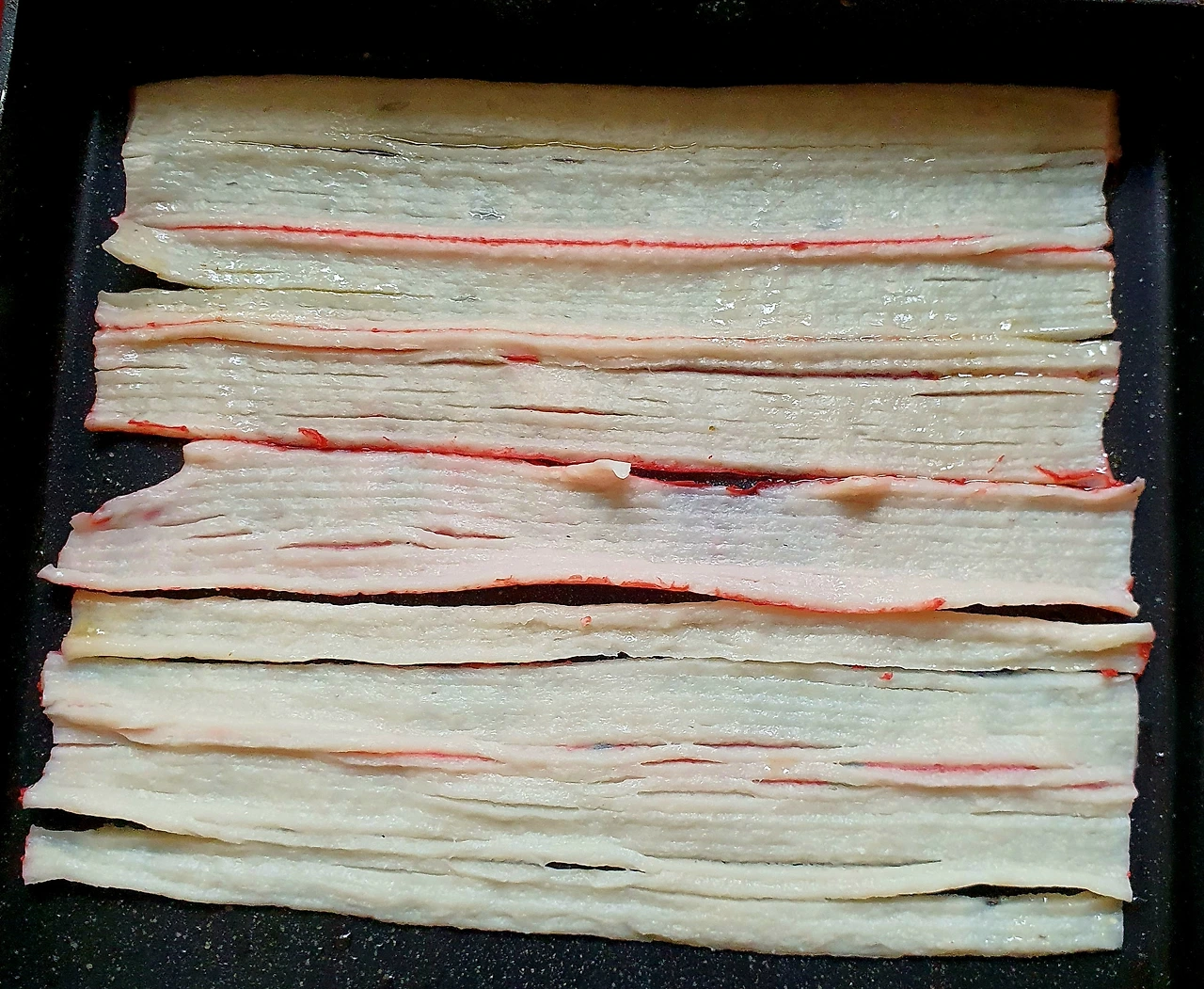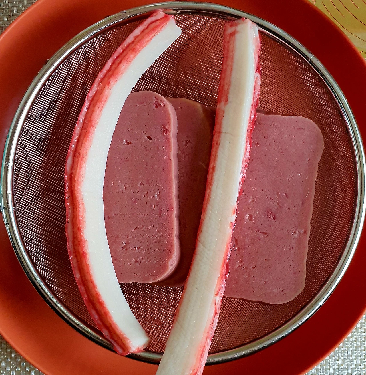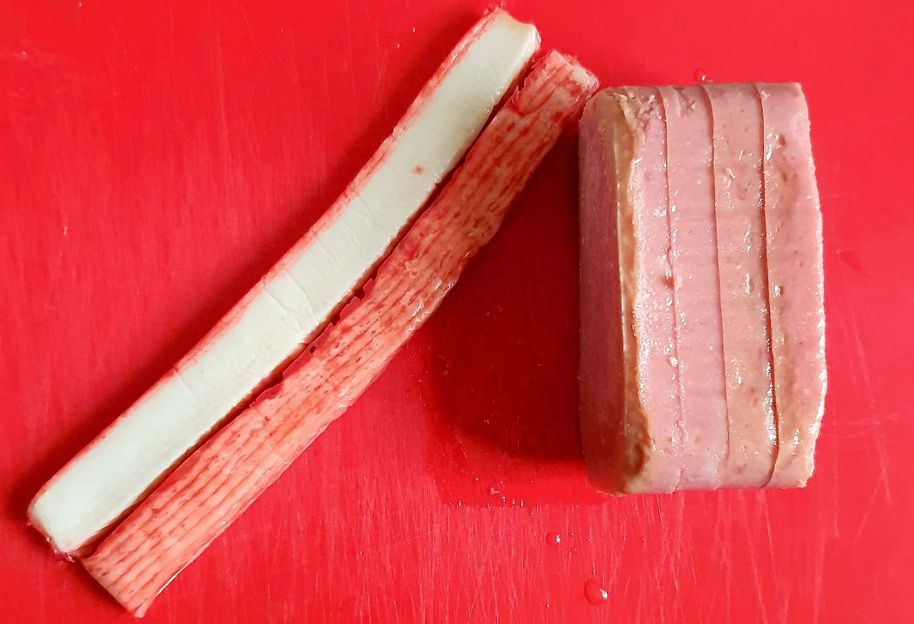 • 달걀은 흰자와 노른자를 분리해서 소금 조금 넣고 풀어주고, 맛살은 끓는 물에 데쳐서 넓게 펼쳐 앞면은 노른자를 뒷면은 흰자위를 입혀 전을 부쳐 썰어준다.