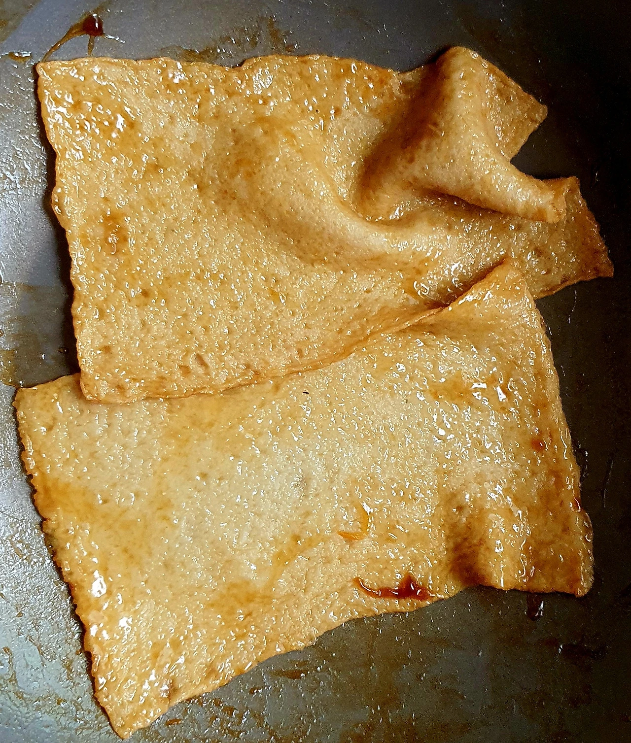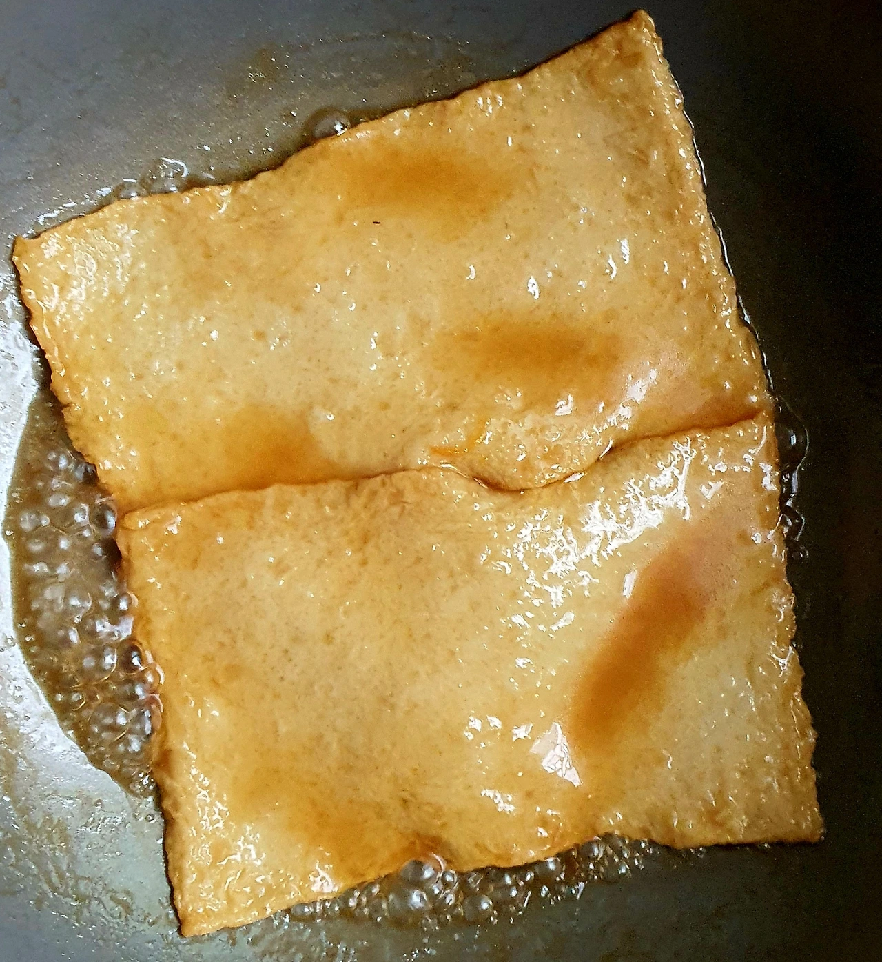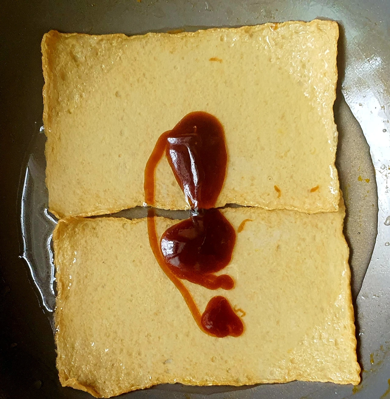 • 사각어묵은 데리야끼소스에 조려서 3등분으로 썰어 준다.