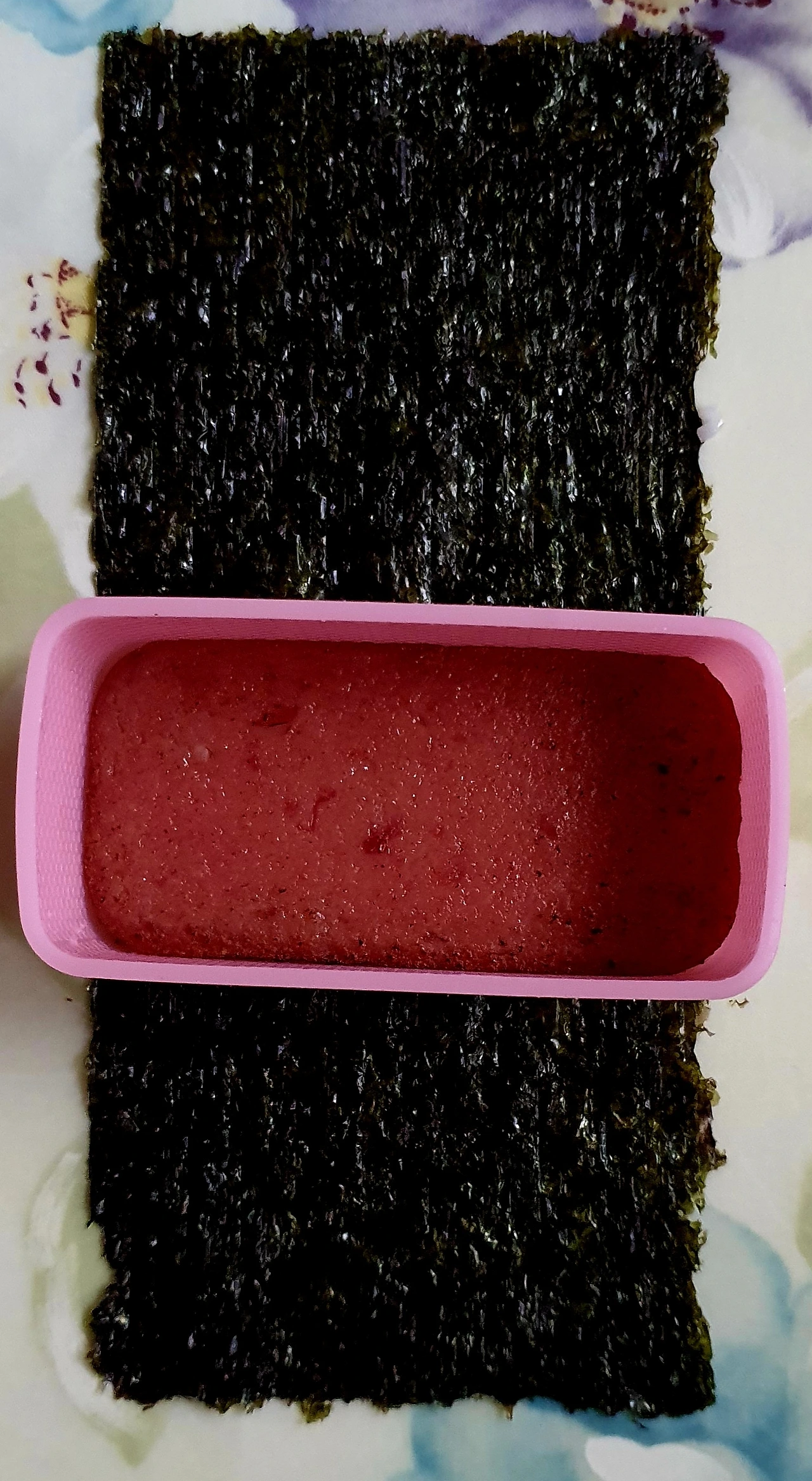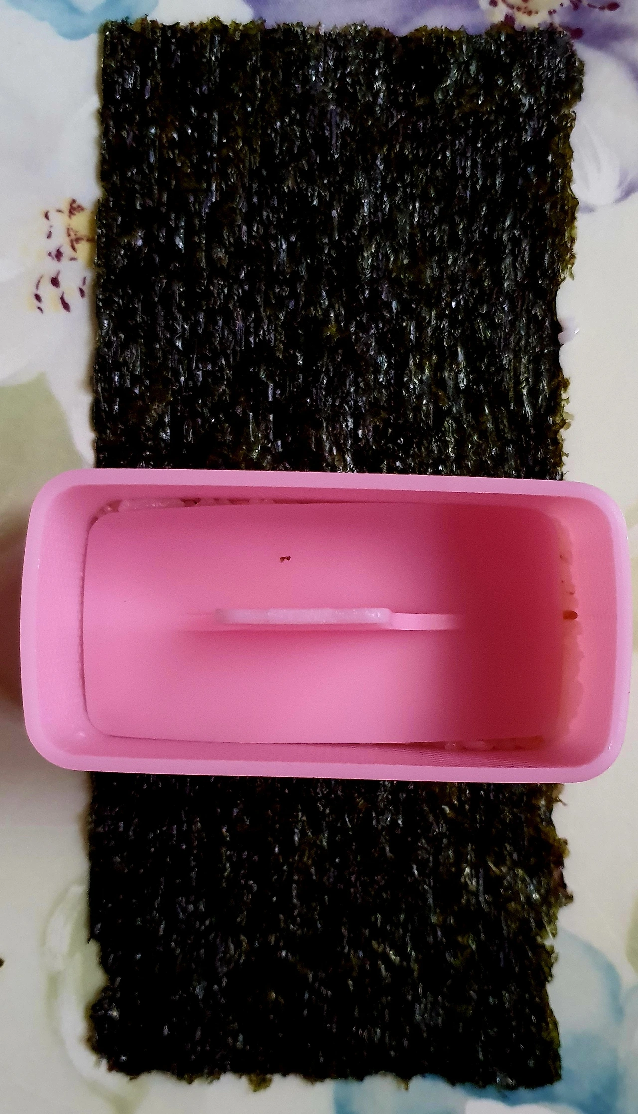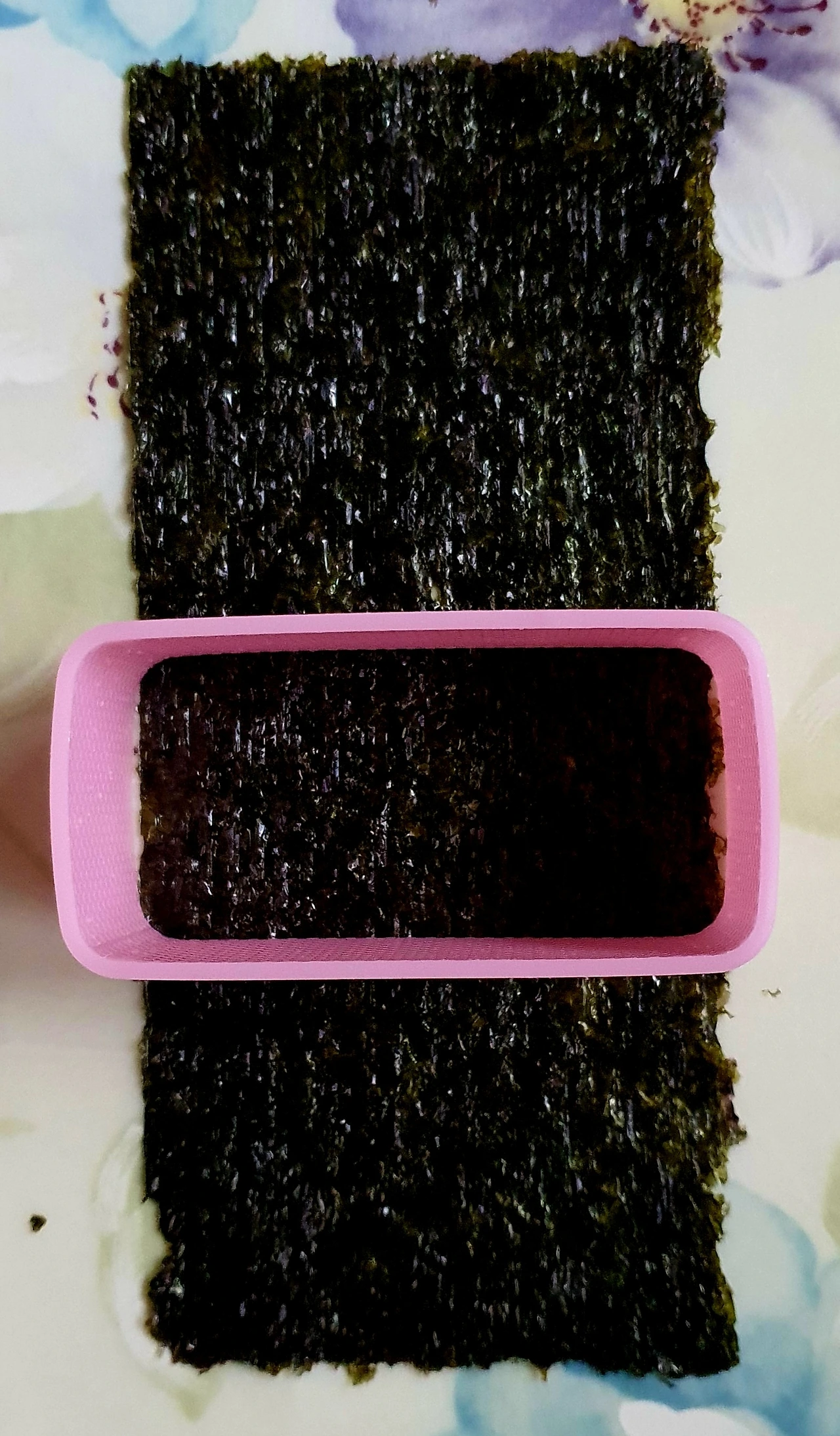 • 김은 반으로 잘라 바닥에 깔고 위에 4각 김밥 틀을 올려준다.