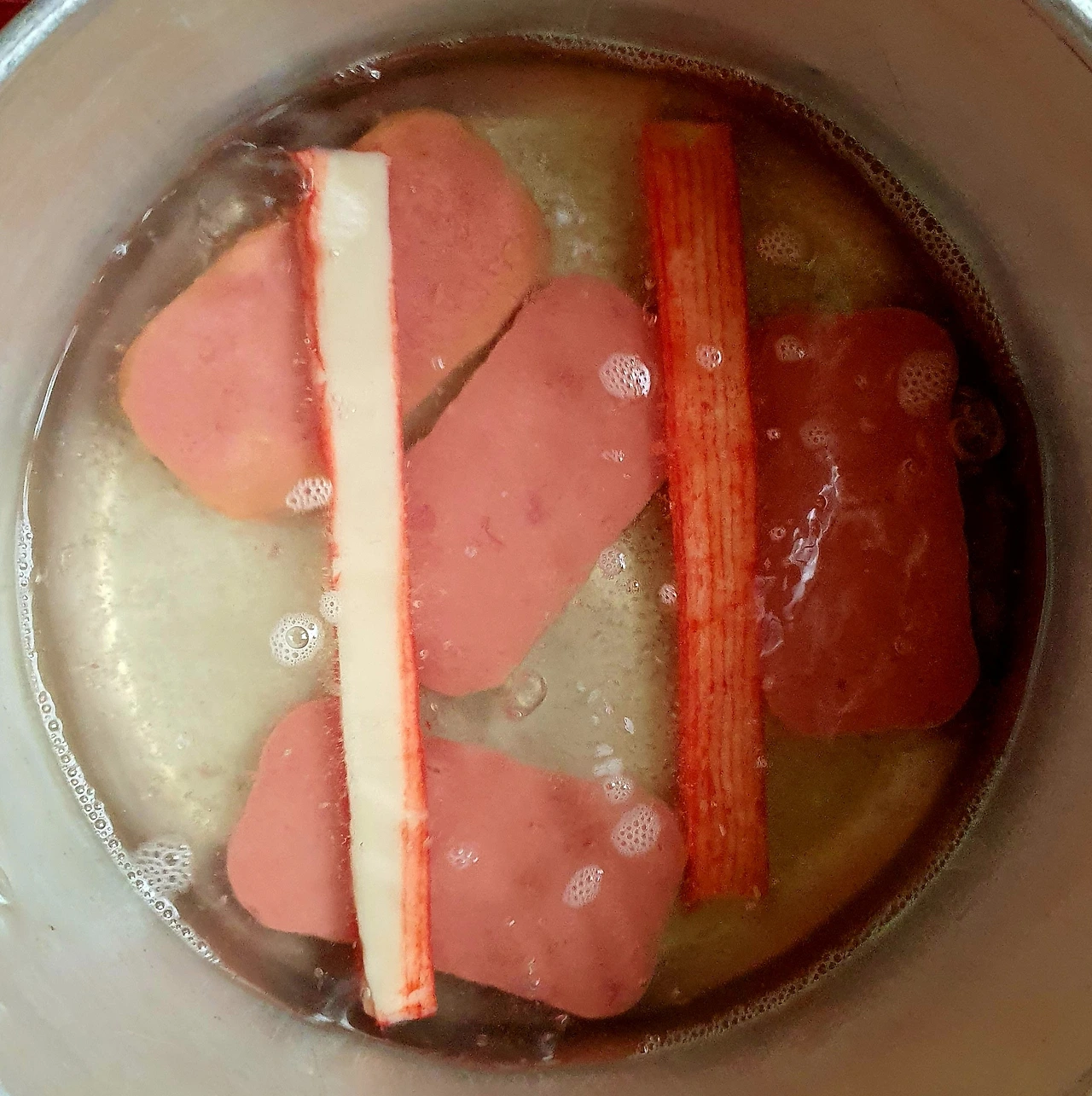 • 달걀은 풀어서 지단을 부쳐주고, 맛살은 펼쳐두고, 어묵은 데리야끼소스에 조려준다. 김밥용 햄은 끓는 물에 데친 다음 팬 위에 구워준다. 치즈는 반으로 잘라 둔다.
