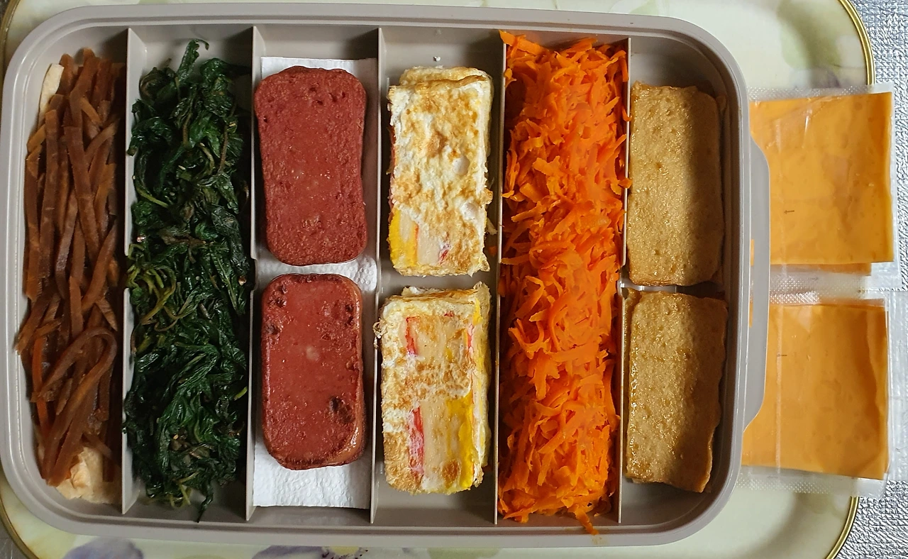 ■ 김밥 재료 : 김밥김 2장. 햄 1통. 사각어묵 2장. 달걀 3개. 깨순 1봉. 당근 ⅓개. 무장아찌 ½컵. 맛살 2줄. 치즈 4장. 즉석밥 300g 1개