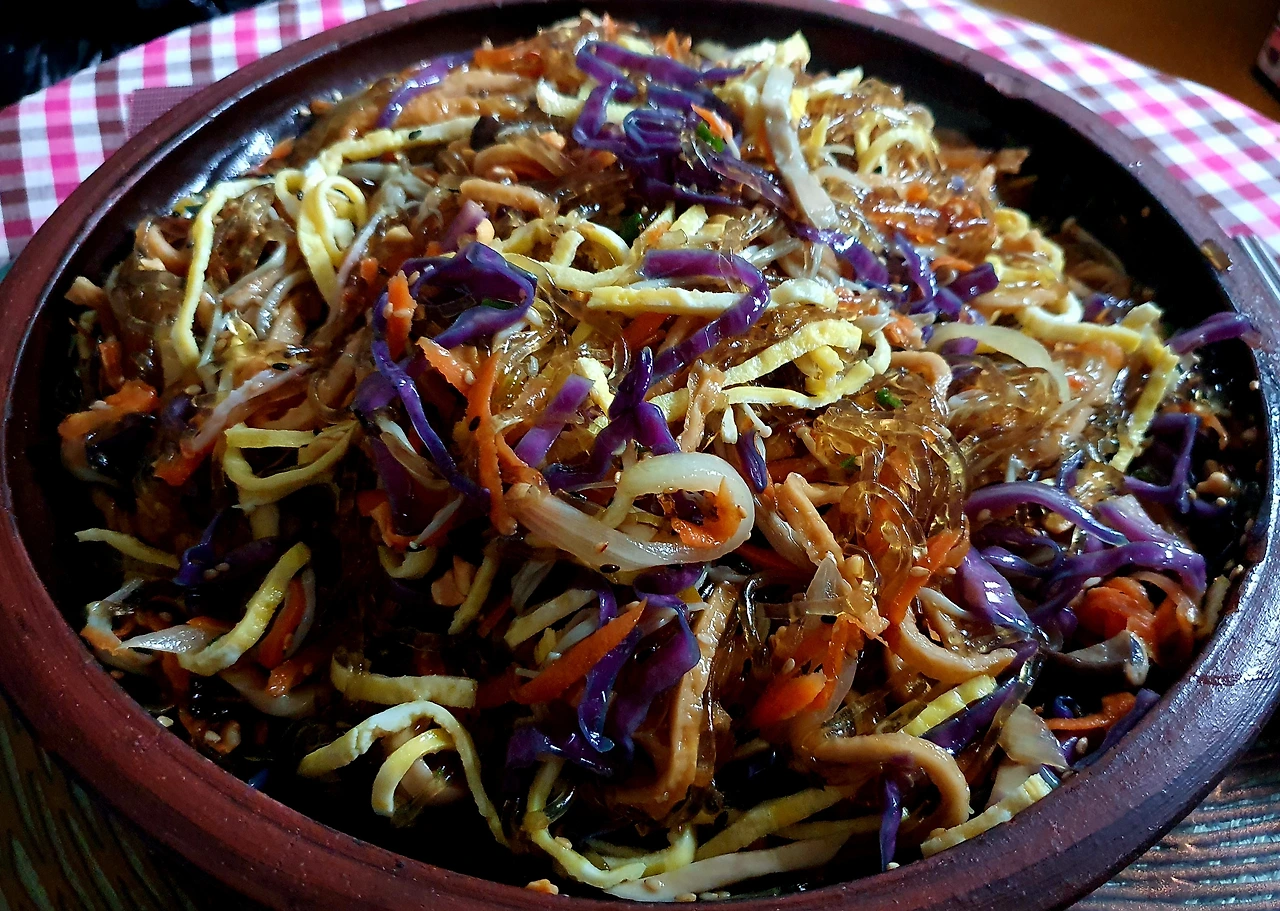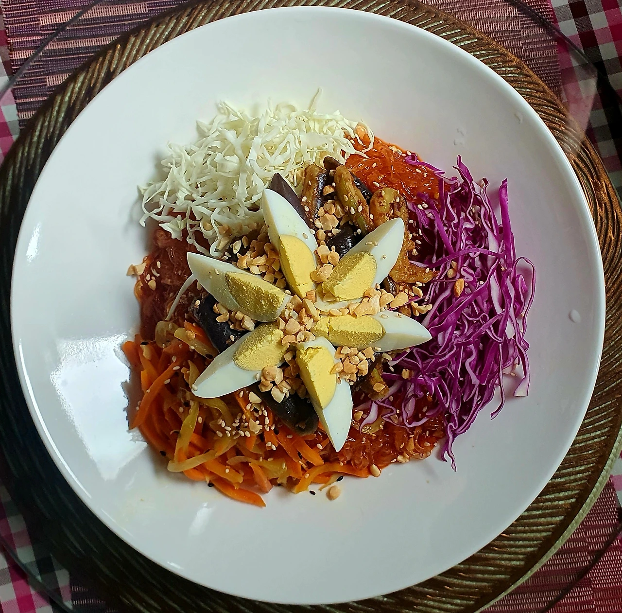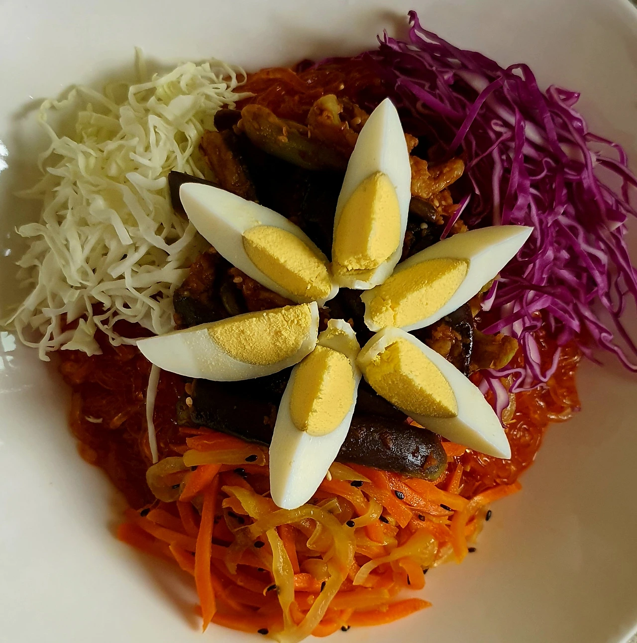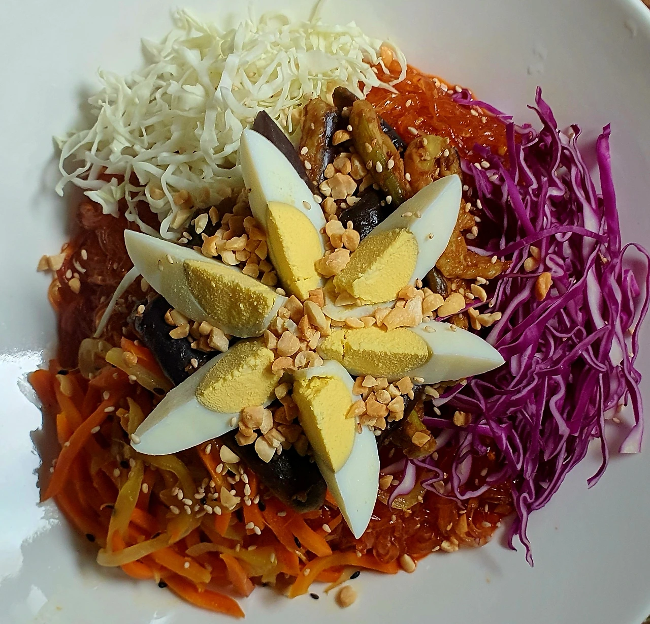 • 양념에 비빈 천사채 국수 위에 가지무침과 볶음 당근. 양파. 자색 양배추를 올리고 가운데 삶은 달걀을 올린다.